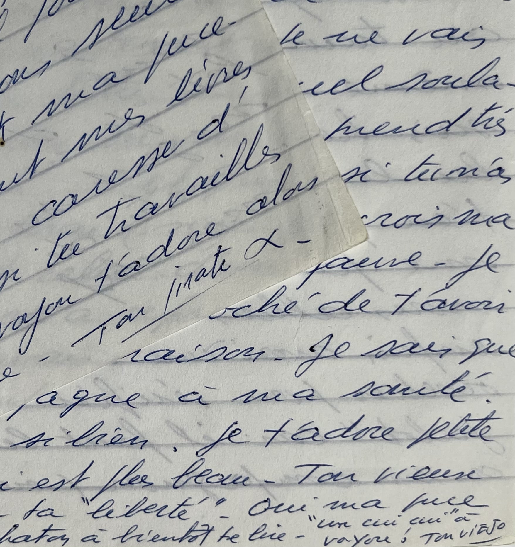 "Ma petite "libérable" adorée. Eh oui, ce soir c'est la fête... la cage s'est ouverte après 7 ans et 4 mois de souffrances. Là je t'écris et tu es toujours à Fleury, car il n'est que 18 heures 20... Tu viens d'apprendre "ta liberté". Que te dire, mon ange. Je suis fou de joie d'avoir vu juste. Cela est une nouvelle fois la preuve que dans la vie il faut toujours lutter. Je n'ose imaginer ta tête!... mais ce soir ta sortie sera digne de toi... Je t'ai fait préparer une fête dans un restaurant... que des "nanas" et le champagne à flot... Tu ne peux comprendre ce que je ressens. J'ai tellement voulu cette liberté. J'y ai toujours cru et t'ai encouragée à y croire. Quand Aiche est venue à 17h30 elle avait le doigt levé de la victoire. Elle m'a dit "vous aviez raison" ; mais je crois que tu dois cette liberté au travail de tous. Aiche, madame Marshal et même madame Paudo. Bon Dieu que je suis heureux de te savoir enfin libre. J'ai lu les conditions... c'est très acceptable. Je t'en parlerai à notre prochain parloir... cela me fait tout drôle de savoir que maintenant nous allons nous voir plus souvent. Voyou va enfin avoir une belle cage... et tu iras chez un oiselier pour vérifier si c'était "une julie" ou "un julot" car il faut lui donner une compagne ou un compagnon (sic) le pauvre est resté assez longtemps au célibat. Je ne parle que pour l'oiseau (sic). Je connais ton programme de ce soir! une vraie "petite reine" j'ai dit à Aiche "crédit illimité" mais ne me la froisse pas ! car après 7 berges de badadi badadoi ! le champagne risque de faire "premier au poteau" ! Là tu es en train de préparer tes affaires, mélangeant tes larmes au sourire. Oui mon ange tu es "libre". Les portes s'ouvrent toujours un jour, mais ce qui est le plus beau, c'est que tu sors debout... tout comme tu y es entrée [...]. Oui, petite fille, ce soir j'ai le coeur en fête, car c'est la moitié de moi-même qui est libre. Je sais que tu respecteras la parole donnée [...]. Je ne t'ai pas fait sortir pour m'aider. Je l'ai fait pour que tu la conserves cette "maudite liberté". Maintenant je ne vais plus mettre (MAF) sur mes lettres... quel soulagement mon ange. Tu vas voir, on reprend très vite l'habitude de la liberté [...]. Je crois, ma puce, que mon instinct est celui d'un fauve. Je sens les événements. On m'a reproché de t'avoir donné cet espoir... mais j'avais raison. Je sais que tu as levé ta coupe de champagne à ma santé, "à l'homme" comme tu dis si bien. Je t'adore petit fille. Tu mérites tout ce qui est plus beau. Ton vieux bagnard pose de tendres bécots sur ta "liberté". Oui ma puce l'espoir est une force. Bonne nuit chaton, à bientôt te lire. "qui lui qui à Voyou!".