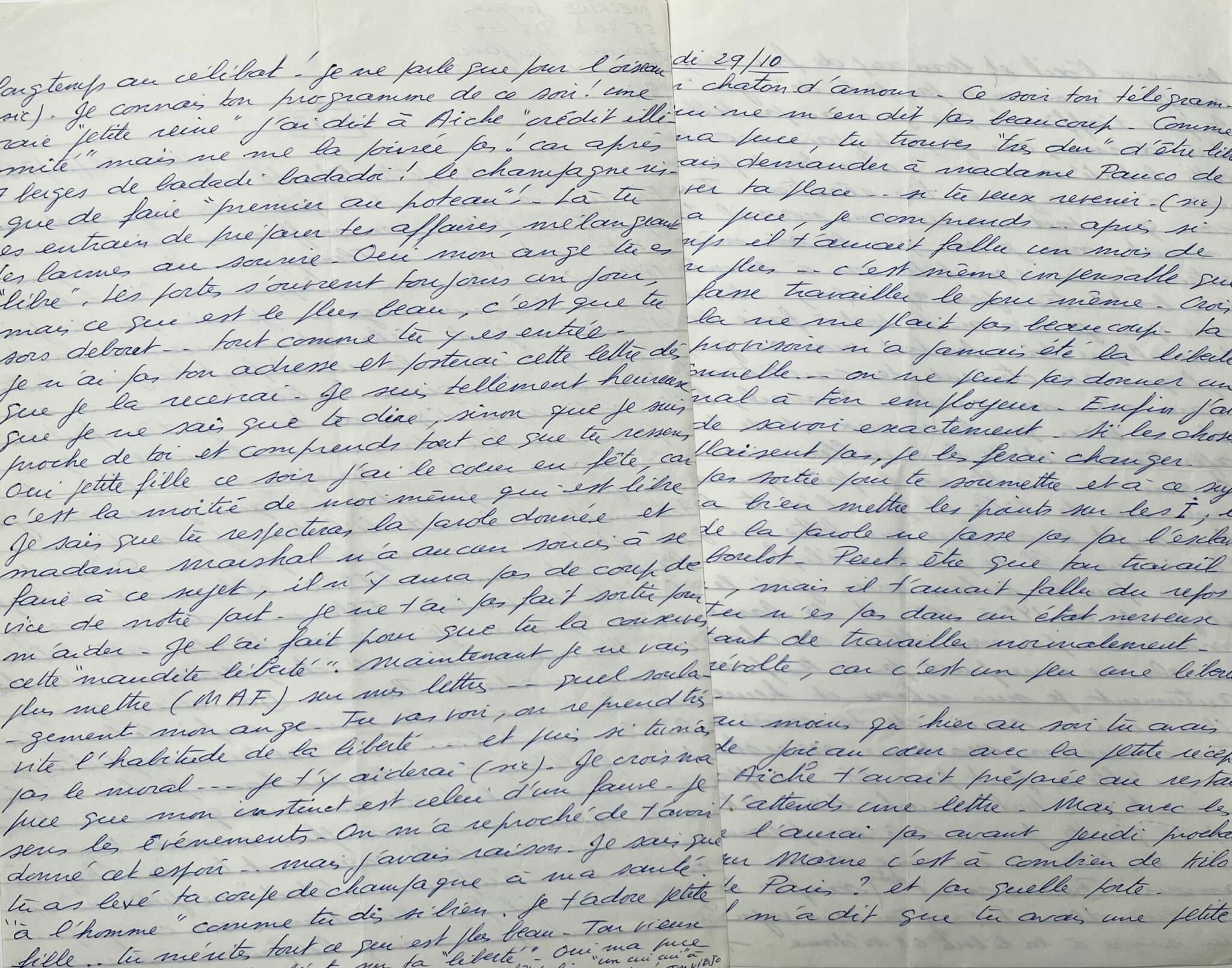 Le lendemain 29 octobre, Jacques Mesrine poursuit sa lettre : il ne comprend pas pourquoi elle travaille dès le lendemain de sa sortie. "Comme cela, ma puce, tu trouves "très dur" d'être libre [...]. La liberté provisoire n'a jamais été la liberté conditionnelle... on ne peut pas donner un droit pénal à ton employeur [...]. Si les choses ne me plaisent pas, je les ferai changer. Tu n'es pas sortie pour te soumettre et à ce sujet il faudra bien mettre les points sur les I ; le respect de la parole ne passe pas par l'esclavage au boulot [...]. Cela me révolte car c'est un peu une liberté chantage. J'espère au moins qu'hier au soir tu avais un peu de joie au coeur avec la petite réception que Aiche t'avait préparée au restaurant". Il se renseigne sur sa vie hors de la prison : "Nogent sur Marne c'est à combien de kilomètre de Paris ? et par quelle porte. Mon chef m'a dit que tu avais une petite larme à l'oeil et beaucoup de fric (sic) à ton compte [...]. Je peux t'affirmer que je n'ai pas tellement bien dormi car je partageais moralement cette liberté avec toi... cherchant par la pensée à imaginer tes réactions. Tu vas voir que tout va redevenir normal très rapidement. Moi je sais que le soir même j'aurais retrouvé mon équilibre car à Montréal j'étais au boulot trois jours après (sic) [...]. Surtout mon ange, tu m'expliques exactement tes conditions de vie sans rien me cacher - travail, logement, etc. [...]. Ok ma puce je te quitte pour ce soir en posant mes lèvres sur les tiennes en une douce caresse d'amour [...]".