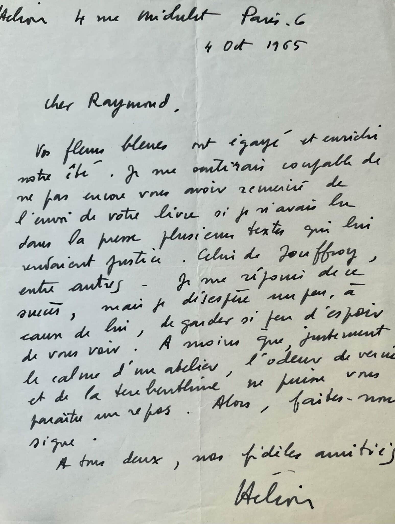 "Vos fleurs bleues ont égayé et enrichi notre été. Je me sentirais coupable de ne pas encore vous avoir remercié de l'envoi de votre livre si je n'avais lu dans la presse plusieurs textes qui lui renvoient justice. Celui de Jouffroy, entre autres. Je me réjouis de ce succès, mais je désespère un peu, à cause de lui, de garder si peu d'espoir de vous voir. A moins que, justement le calme d'un atelier, l'odeur de vernis et de la térébenthine ne puisse vous paraître un repos. Alors, faites-moi signe. À tous deux, mes fidèles amitiés. Hélion".