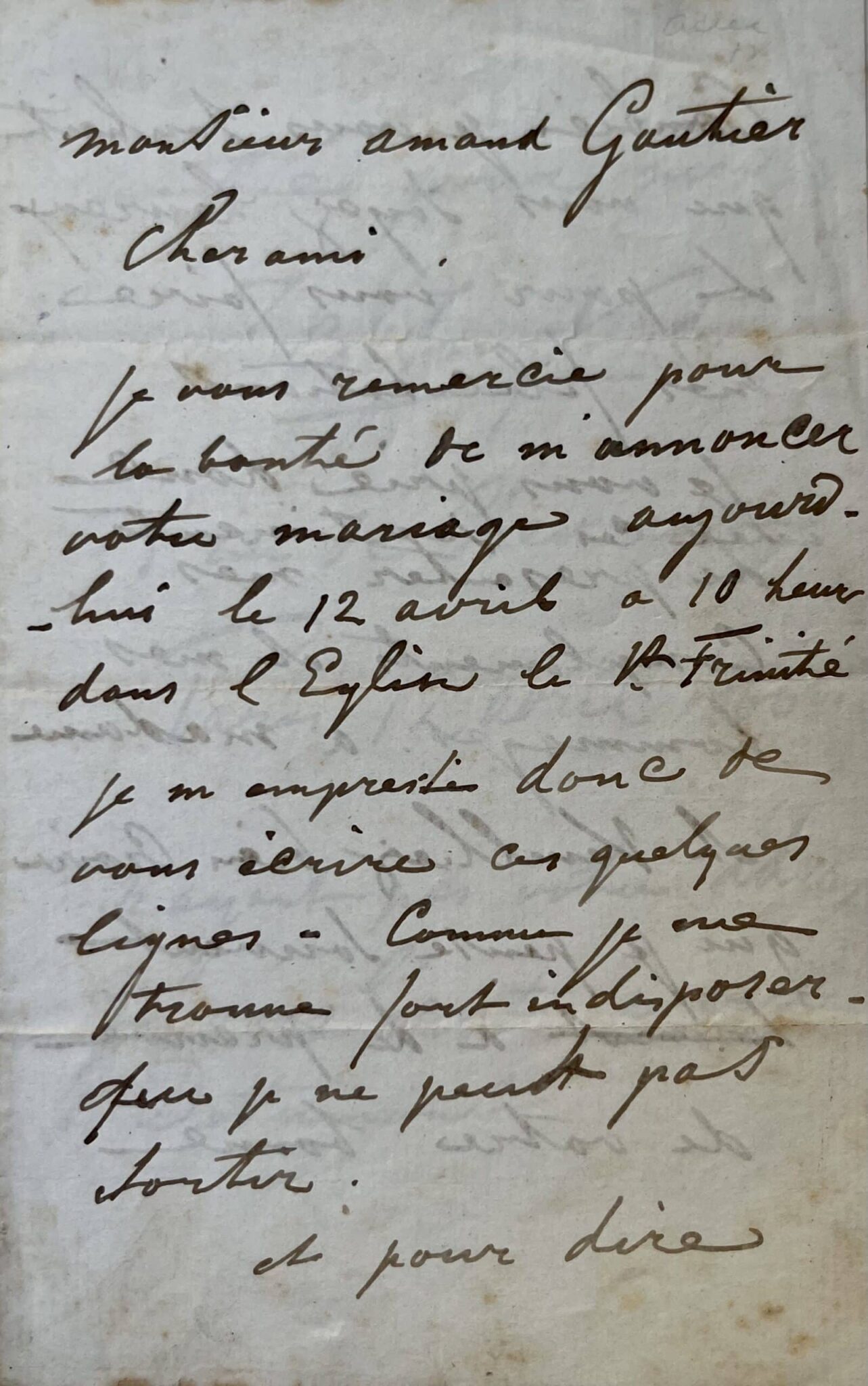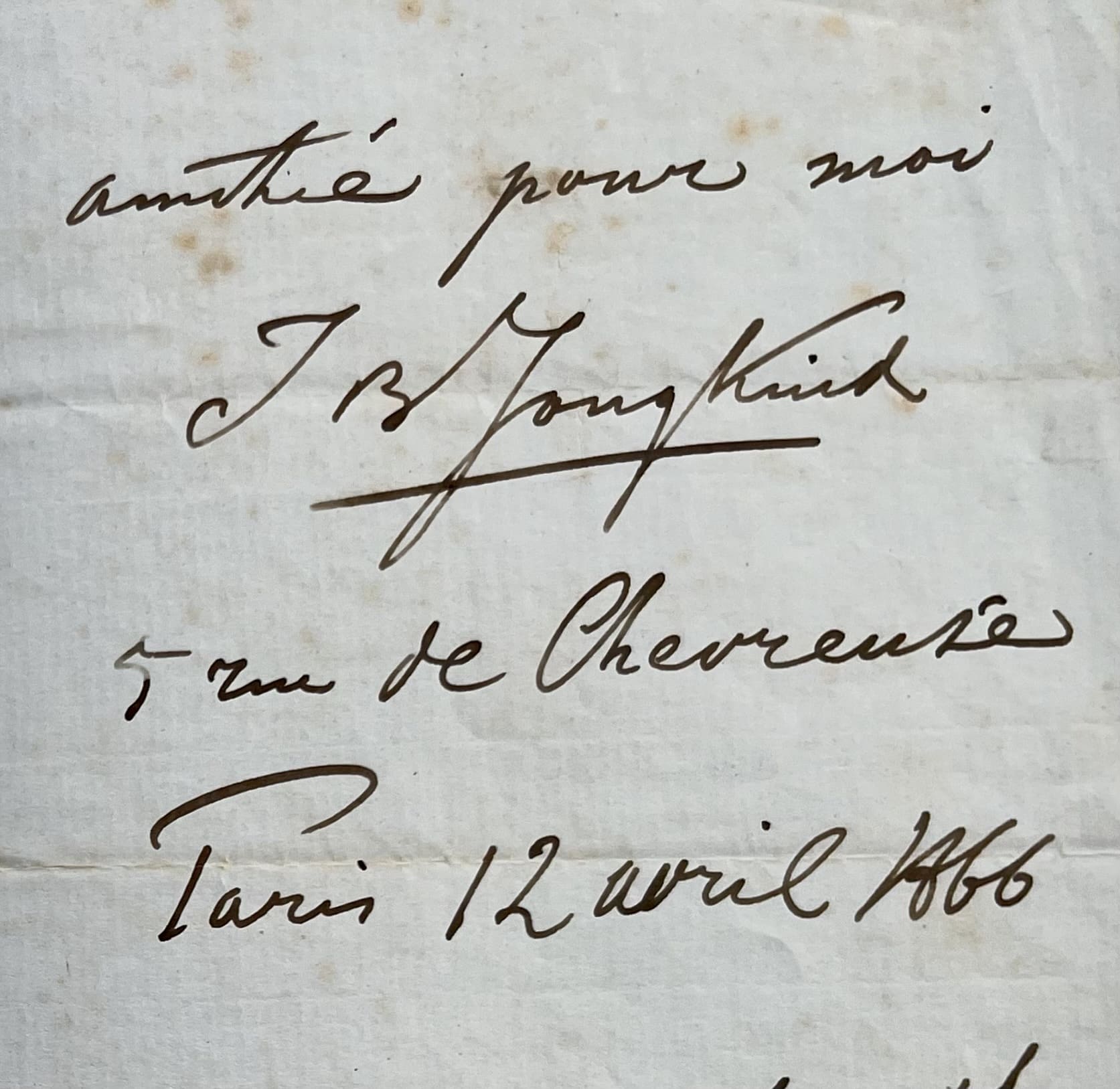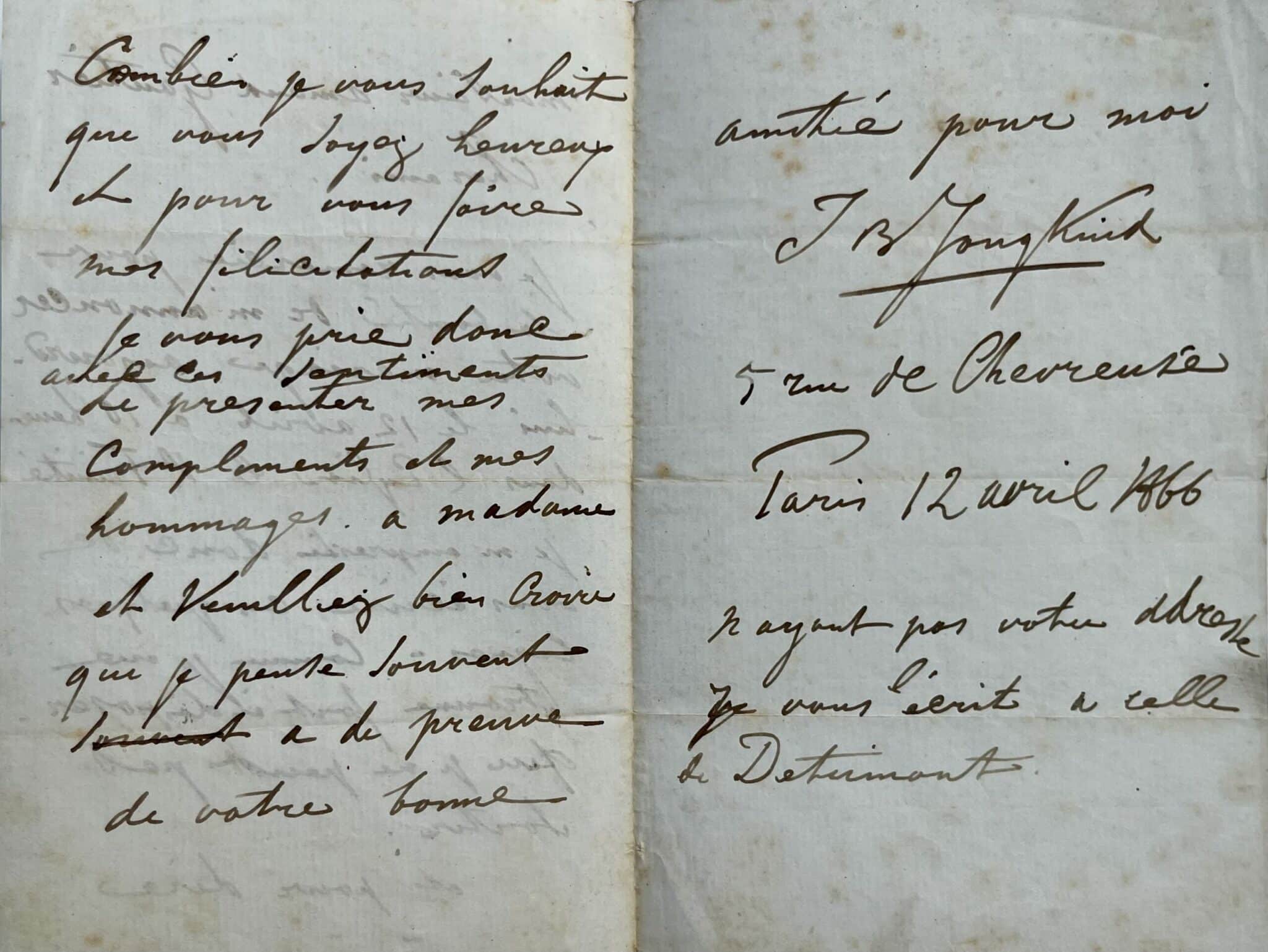Jongkind remercie son ami de l'avoir invité à son mariage, qui doit se dérouler le jour même, à l'église de la Trinité. "Je m'empresse donc de vous écrire ces quelques lignes. Comme je me trouve fort indisposé, que je ne peux pas sortir. Et pour dire combien je souhaite que vous soyez heureux et pour vous faire mes félicitations. Je vous prie donc avec ces sentiments de présenter mes compliments et mes hommages à Madame et veuillez bien croire que je pense souvent à de preuve de votre bonne amitié pour moi [...]".