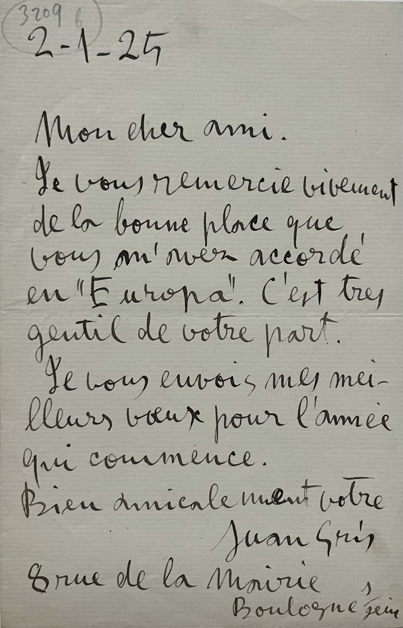 "Mon cher ami. Je vous remercie vivement de la bonne place que vous m'avez accordé en "Europa". C'est très gentil de votre part. Je vous envoie mes meilleurs vœux pour l'année qui commence. Bien amicalement vôtre".
