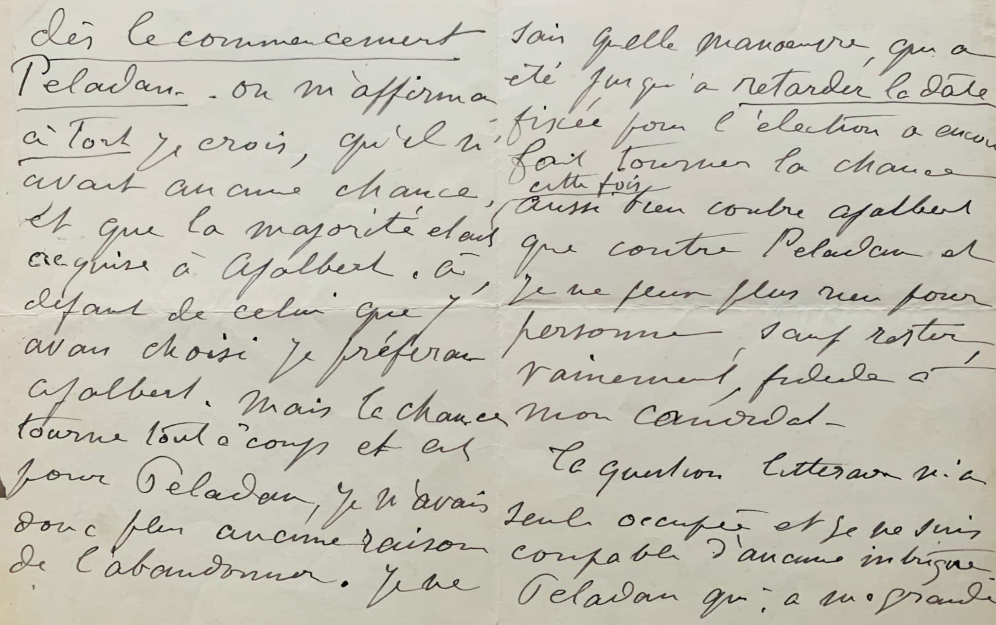 "Je crains bien qu'aucun des candidats qui nous intéressent ne triomphe et que ce soit un troisième. La genèse de l'élection n'est pas d'ailleurs comme vous le dites. Mon candidat fut dès le commencement Peladan. On m'affirma, à tort je crois, qu'il n'avait aucune chance, et que la majorité était cette fois acquise à Ajalbert. À défaut de celui que j'avais choisi je préférai Ajalbert. Mais la chance tourne tout à coup et c'est pour Peladan, je n'avais donc plus aucune raison de l'abandonner. Je ne sais quelle manoeuvre, qui a été jusqu'à retarder la date fixée pour l'élection, a encore fait tourner la chance aussi bien contre Ajalbert que contre Peladan et je ne peux plus rien pour personne sauf rester, vainement, fidèle à mon candidat.