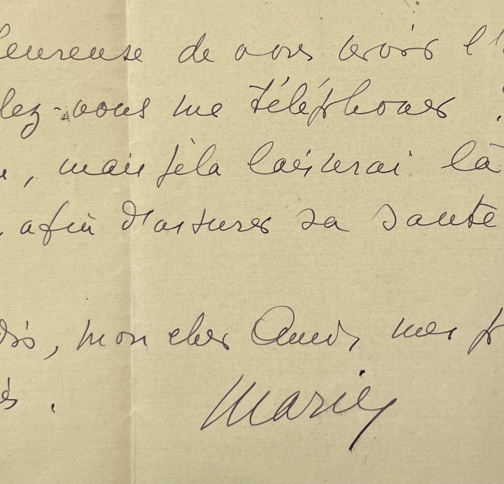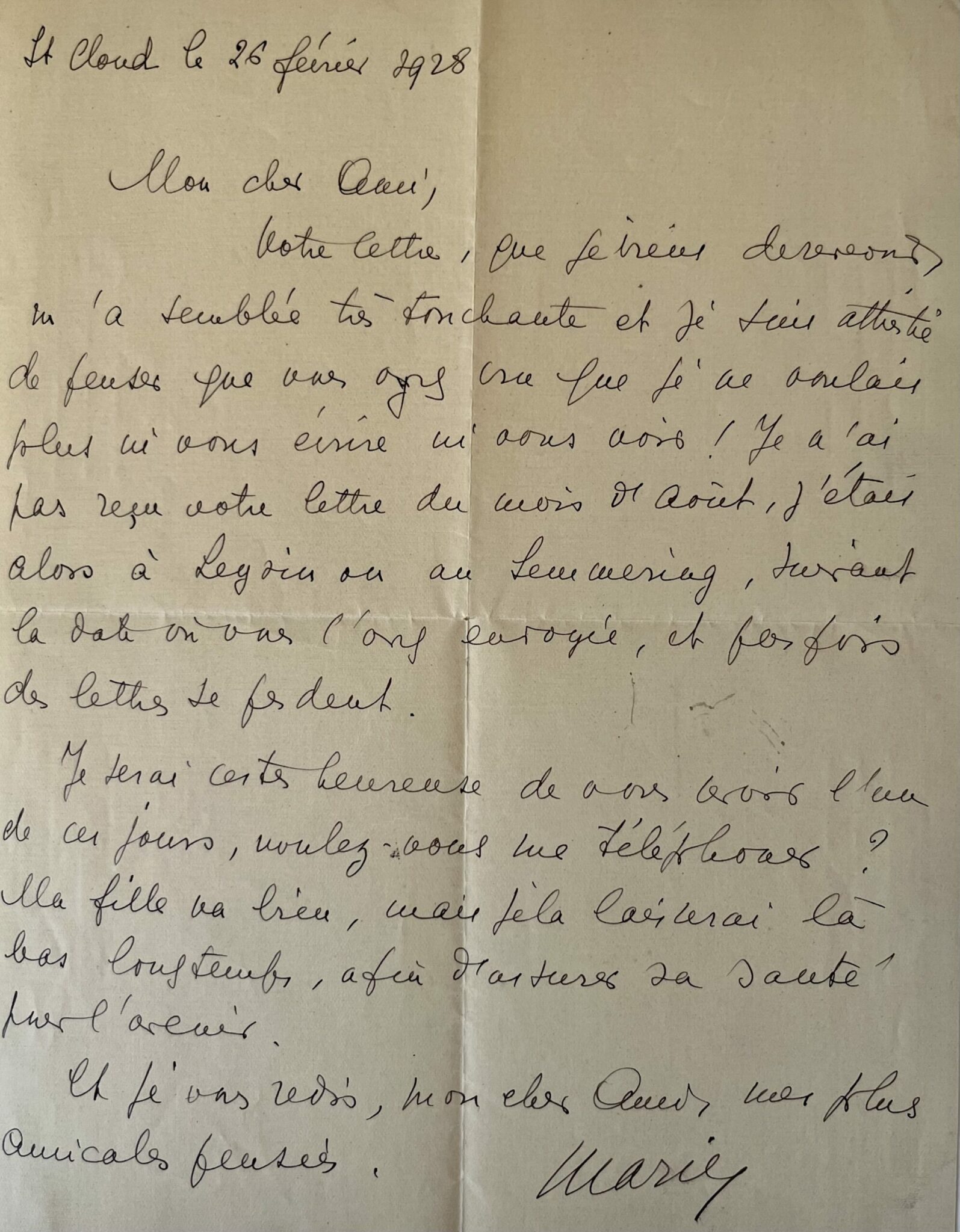 Marie Bonaparte (Saint-Cloud, 1886/1962)"Mon cher ami, votre lettre, que je viens de recevoir m’a semblé très touchante et je suis attristée de penser que vous ayez cru que je ne voulais plus ni vous écrire, ni vous voir ! Je n’ai pas reçu votre lettre du mois d’août, j’étais alors à Leysin ou au Semmering, suivant la date où vous l’avez envoyée, et parfois des lettres se perdent. Je serai certes heureuse de vous voir l'un de ces jours, voulez-vous me téléphoner ? Ma fille va bien, mais je la laisserai là-bas longtemps, afin d’assurer sa santé pour l’avenir. Et je vous redis, mon cher Ami, mes plus amicales pensées. Marie".
