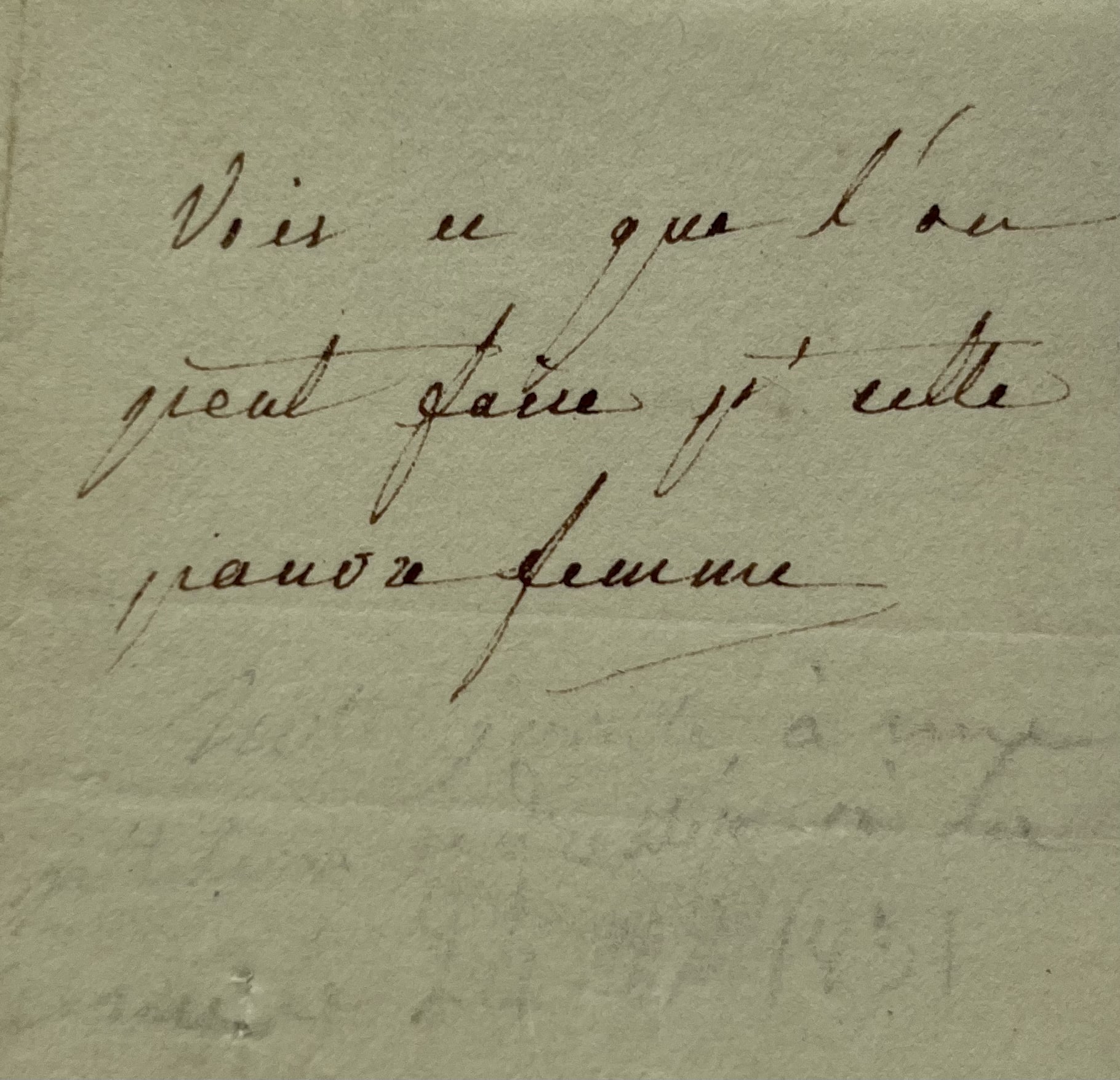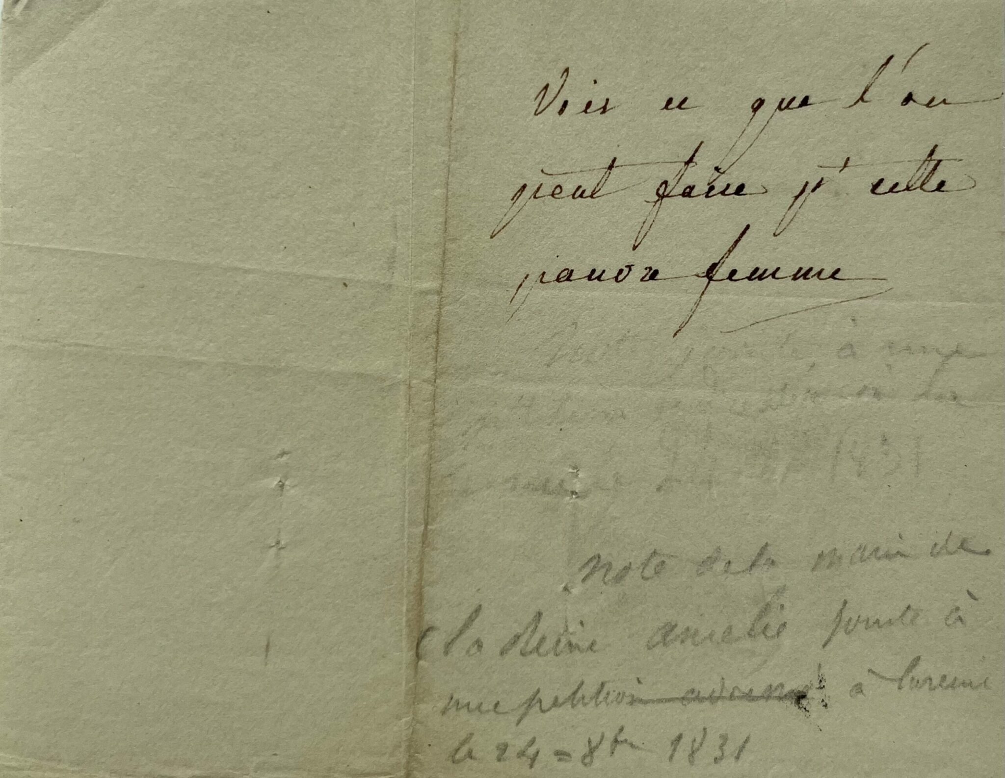 Note anciennement épinglée à une pétition, de la main de la reine Marie-Amélie, non signée : "Voir ce que l'on peut faire pr cette pauvre femme".