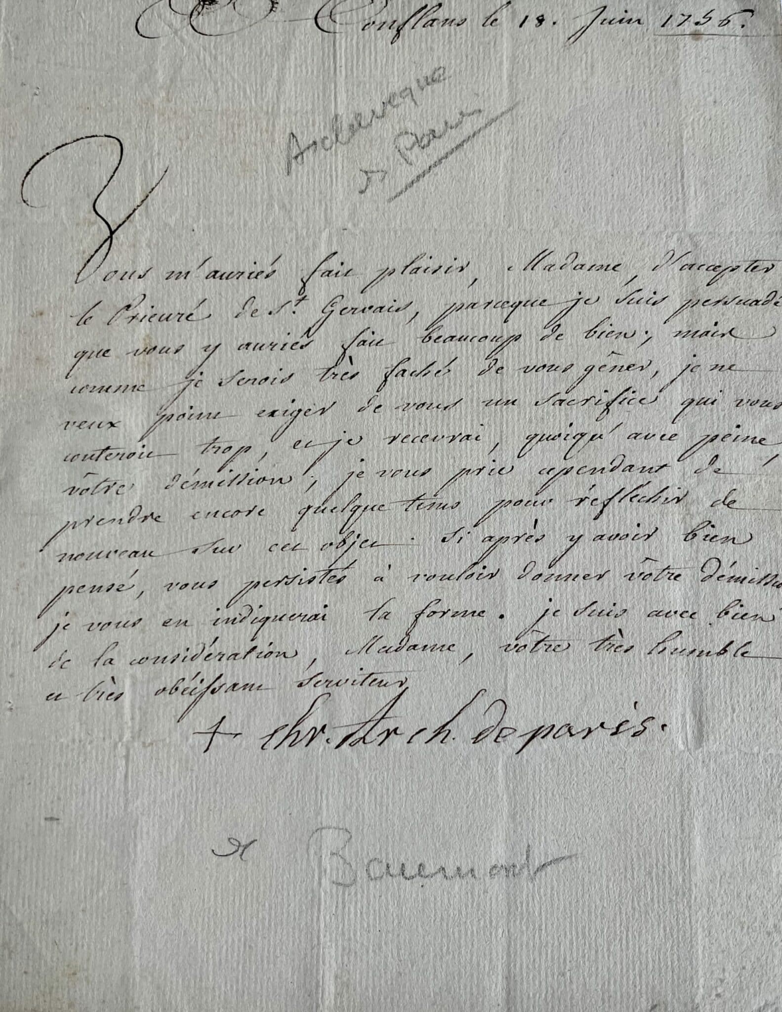 L’archevêque de Paris se résoud à ne pas imposer le prieuré de Saint-Gervais à Mme de Saint-Paul