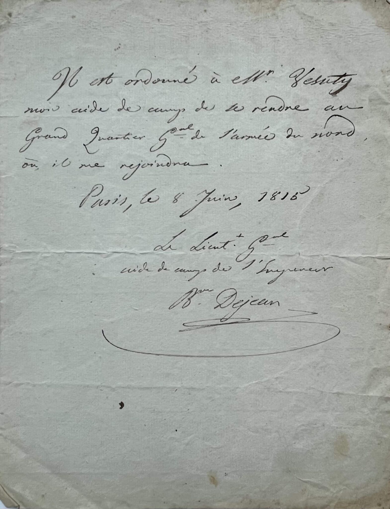 Le second document, écrit 3 jours plus tard, est également destiné à Vesuty, devenu son aide de Camp : "Il est ordonné à Mr Vesuty mon aide de camp de se rendre au grand quartier Gal de l'armée du Nord, où il me rejoindra. Paris, le 8 juin 1815. Le Lieut Gal aide de camp de l'Empereur. Bon Dejean".