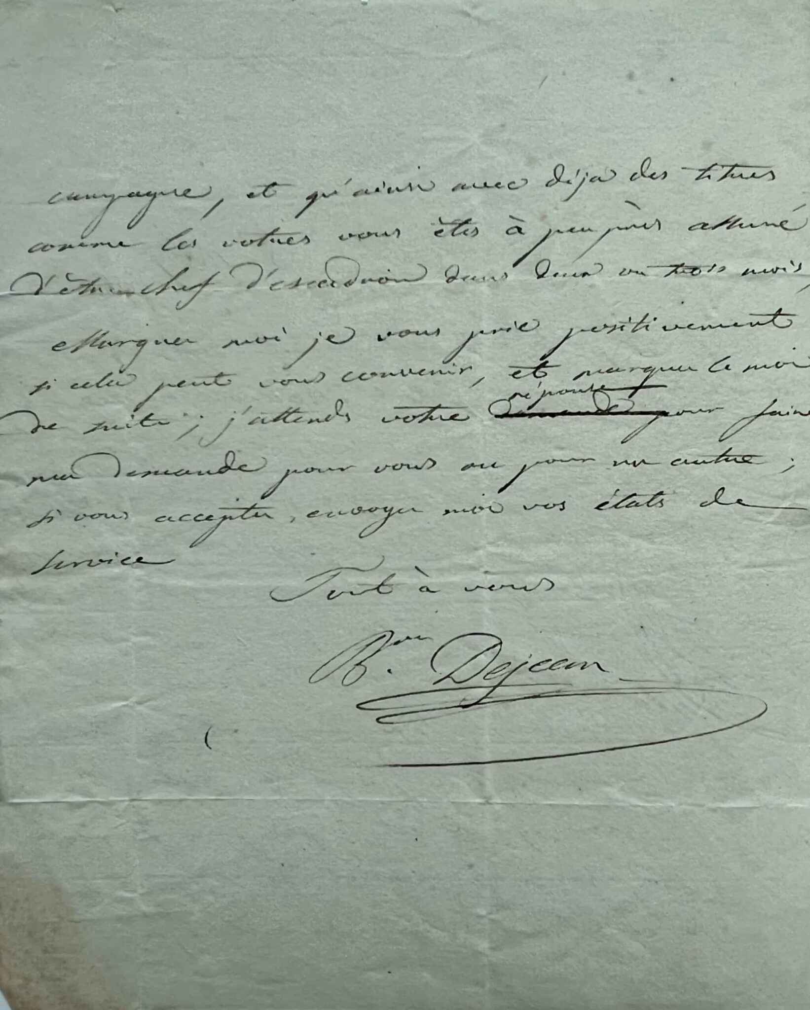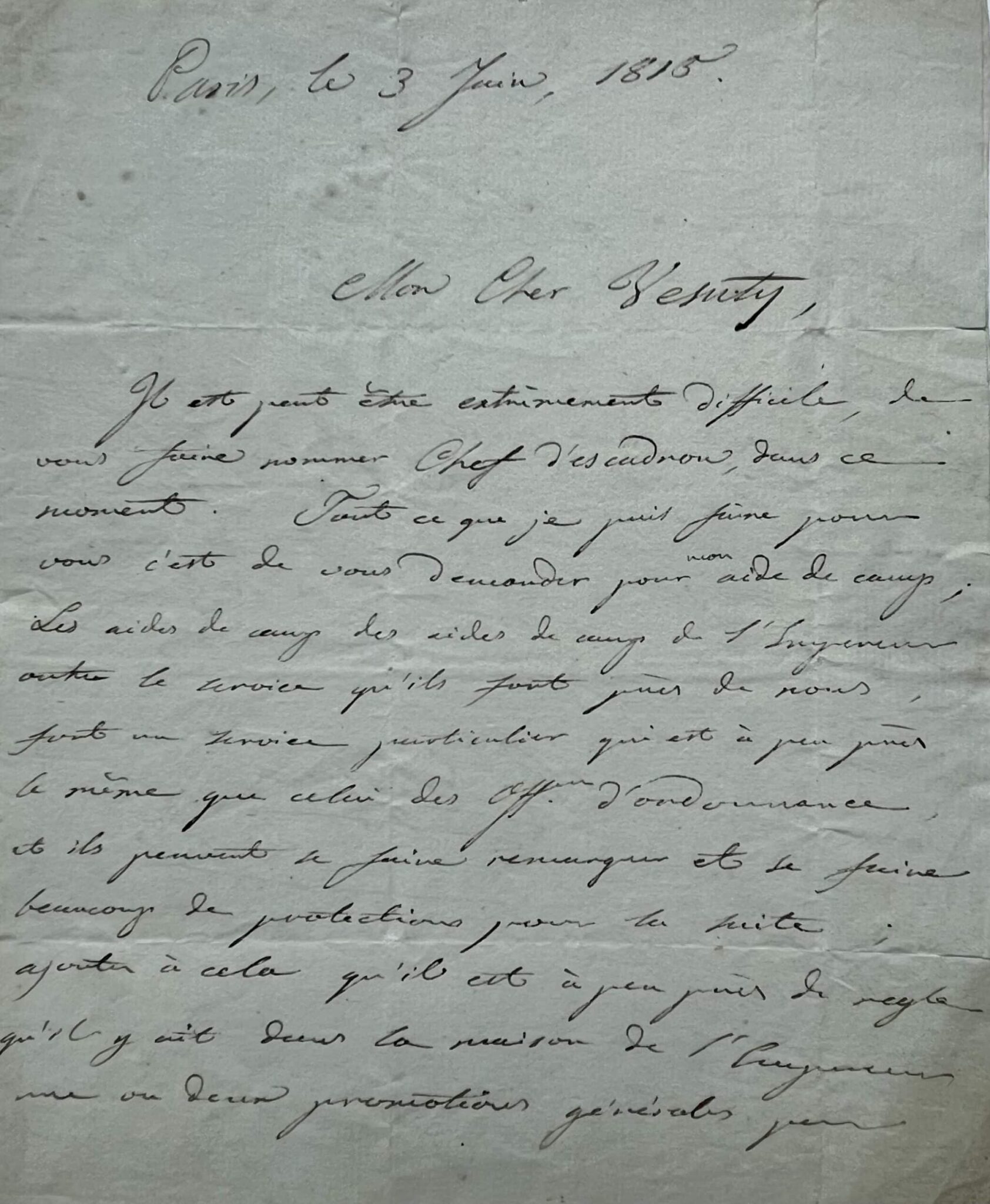 "Mon Cher Vesuty. Il est peut être extrêmement difficile de vous faire nommer Chef d'escadron, dans ce moment. Tout ce que je puis faire pour vous c'est de vous demander pour mon aide de camp. Les aides de camp des aides de camp de l'Empereur outre le service qu'ils font près de nous, font un service particulier qui est à peu près le même que celui des officiers d'ordonnance, et ils peuvent se faire remarquer et se faire beaucoup de protection pour la suite ; ajouter à cela qu'il est à peu près de règle qu'il y ait dans la maison de l'Empereur une ou deux promotions générales par campagne, et qu'ainsi avec déjà des titres comme les vôtres vous êtes à peu près assuré d'être chef d'escadron dans deux ou trois mois. Marquez moi je vous prie positivement si cela peut vous convenir, et marquez le moi de suite ; j'attends votre réponse pour faire une demande pour vous ou pour un autre ; si vous acceptez, envoyez moi vos états de service".