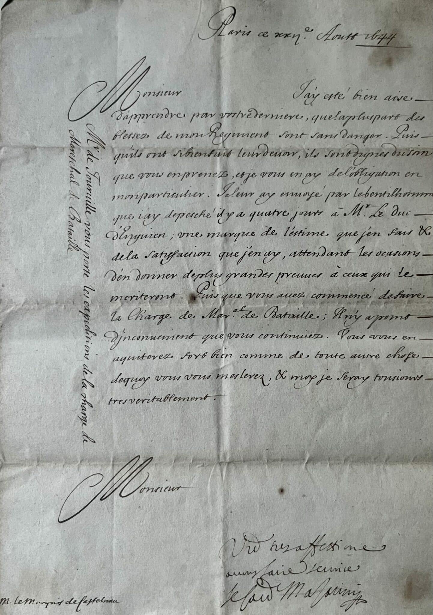 "Monsieur. J'ay est bien aise d'apprendre par vostre dernière, que la pluspart des blessez de mon Régiment sont sans danger. Puis qu'ils ont si bien fait leur devoir, ils sont dignes du soin que vous en prenez, et je vous en ay de l'obligation en mon particulier. Je leur ay envoyé par le gentilhomme que j'ay depesché il y a quatre jours à Mr le duc d'Enghien ; une marque de l'estime que j'en fais & de la satisfaction que j'en ay, attendant les ocasions [sic] d'en donner de plus grandes preuves à ceux qui le mériteront. Puisque vous avez commencé de faire la charge de Maral [maréchal] de Bataille ; Il n'y a point d'inconvénient que vous continuiez. Vous vous en acquitterez fort bien comme de toute autre chose dequoy vous vous meslerez, & moy je seray tousjours tres véritablement Monsieur". Mazarin ajoute de sa propre main "Votre tres affectionné a vous faire service Le Cardl Mazarini".