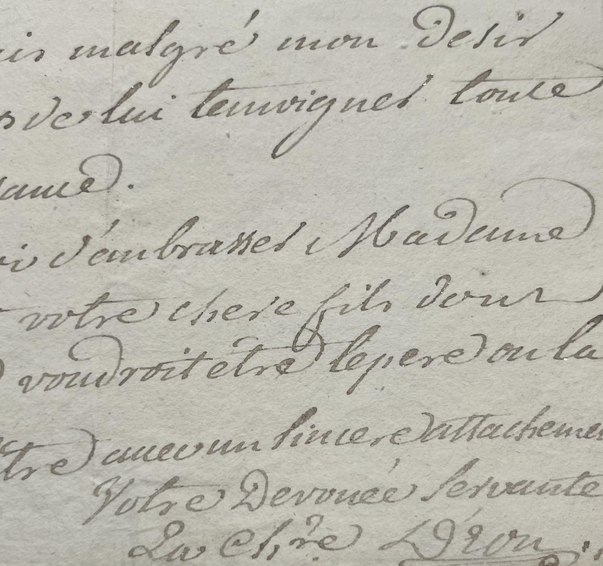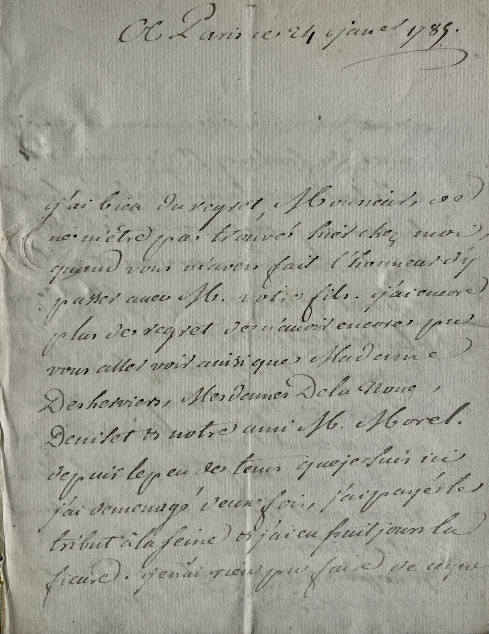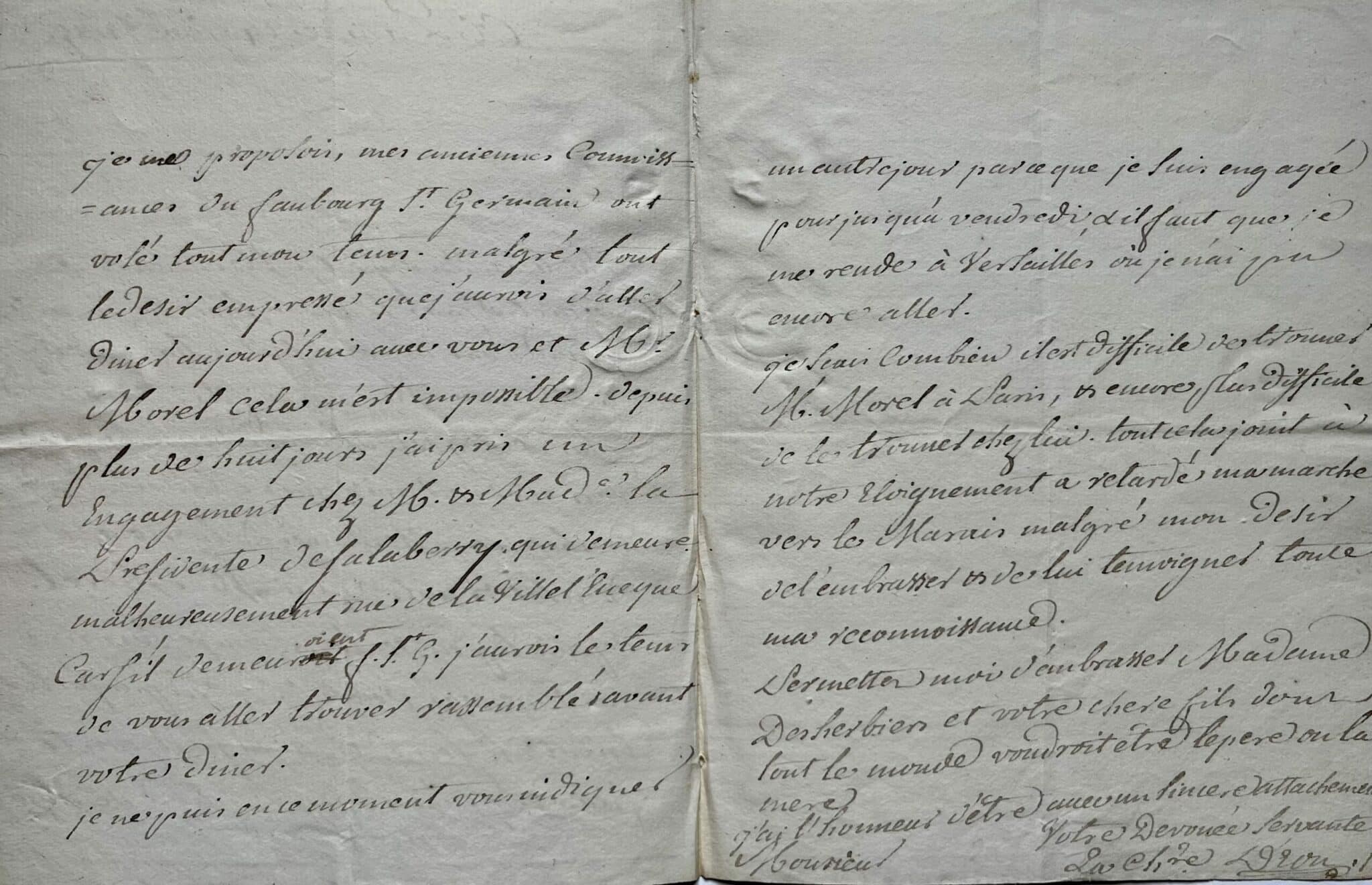 "La Chevalière d'Eon" (selon sa signature) évoque une visite manquée et déplore de n'avoir toujours pas vu Mesdames Desherbiers, Delanoue et Deniset, ainsi que M. Morel. "Depuis le peu de tems que je suis ici j'ai déménagé deux fois, j'ai payé le tribut à la Seine et j'ai eu huit jours la fièvre. Je n'ai rien pu faire de ce que je me proposois, mes anciennes connoissances du faubourg St Germain ont volé tout mon tems". Il se voit contrait de refuser une invitation à diner avec Desherbiers et M. Morel en raison d'un engagement avec M. et Mme la Présidente de Salaberry, "qui demeurent malheureusement rue de la Ville l'Evêque, car s'ils demeuroient f. St. G. [Faubourg Saint-Germain] j'aurois le tems de vous aller trouver rassemblés avant votre diner. Je ne puis en ce moment vous indiquer un autre jour parce que je suis engagée pour jusqu'au vendredi & il faut que je me rende à Versailles où je n'ai pu encore aller. Je sais combien il est difficile de trouver M. Morel à Paris [...]. Tout cela joint à notre éloignement a retardé ma marche vers le Marais malgré mon désir de l'embrasser & de lui témoigner toute ma reconnoissance. Permettez moi d'embrasser Madame Desherbiers [Marie-Anne Daret] et votre chère [sic] fils dont tout le monde voudroit être le père ou la mère ".
