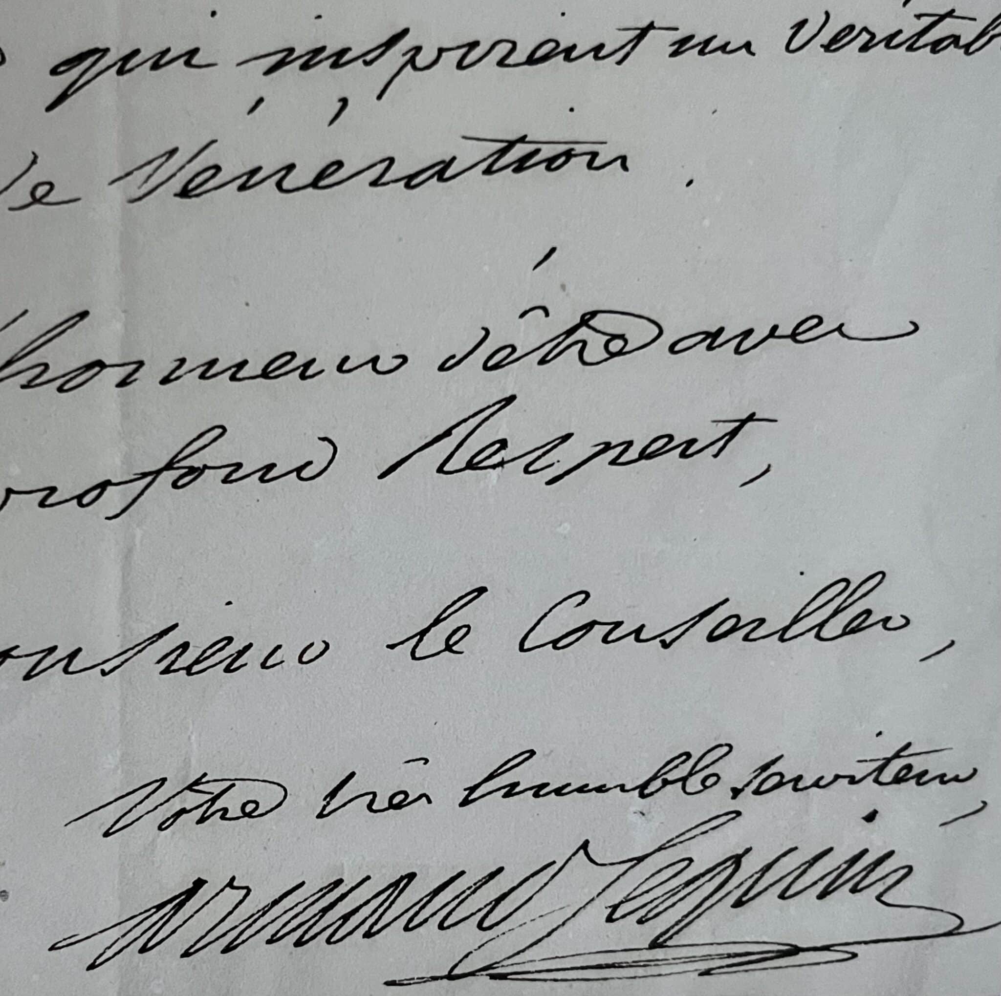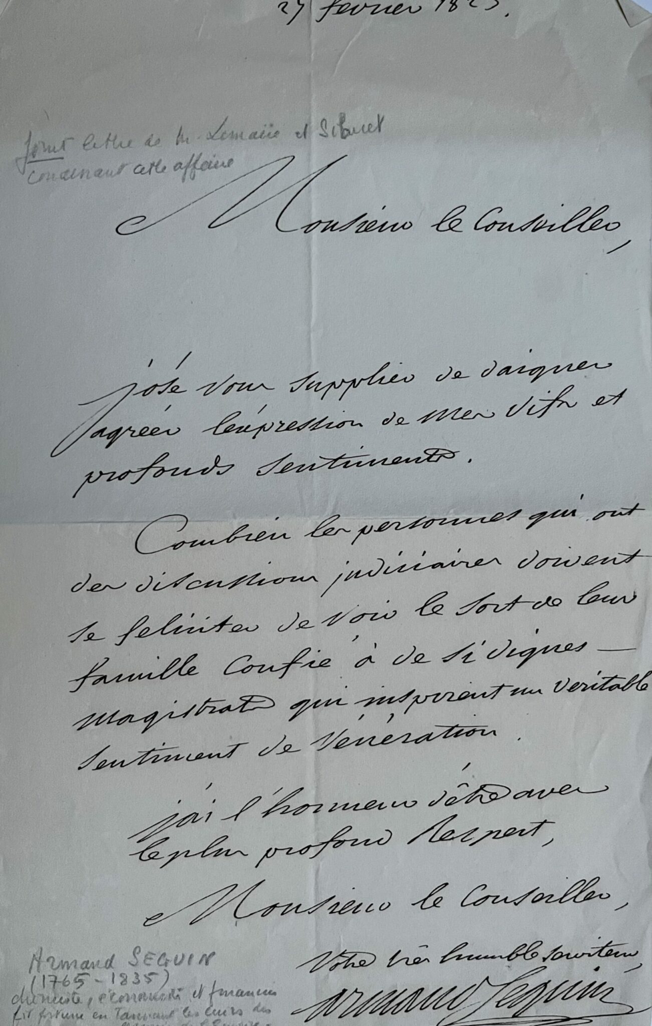 Armand Séguin (Paris, 1767/1835)"J'ose vous supplier de daigner agréer l'expression de mes vifs et profonds sentiments. Combien les personnes qui ont des discussions judiciaires doivent se féliciter de voir le sort de leur famille confié à de si dignes magistrats qui inspirent un véritable sentiment de vénération [...]". Séguin était coutumier des démêlés judiciaires.