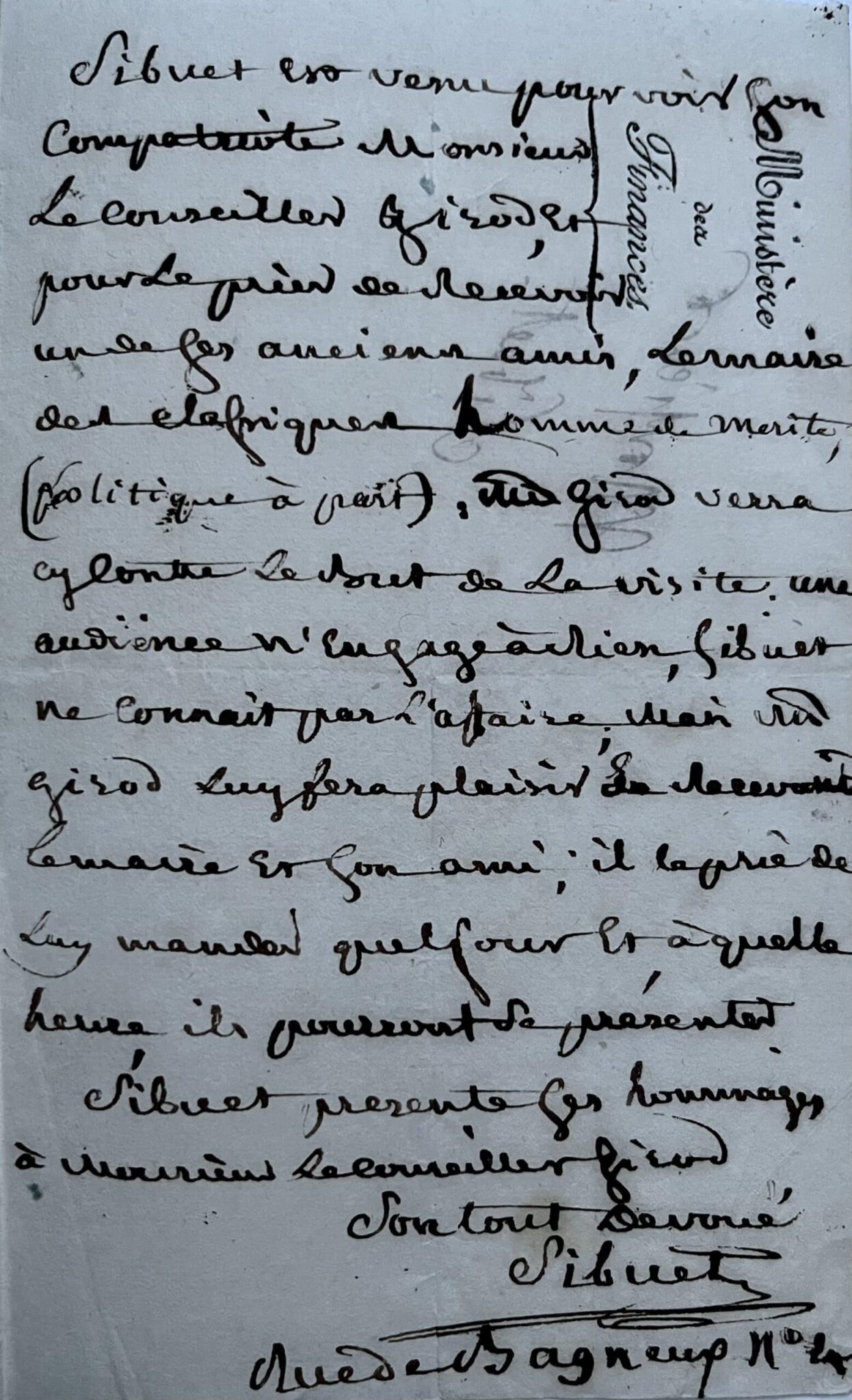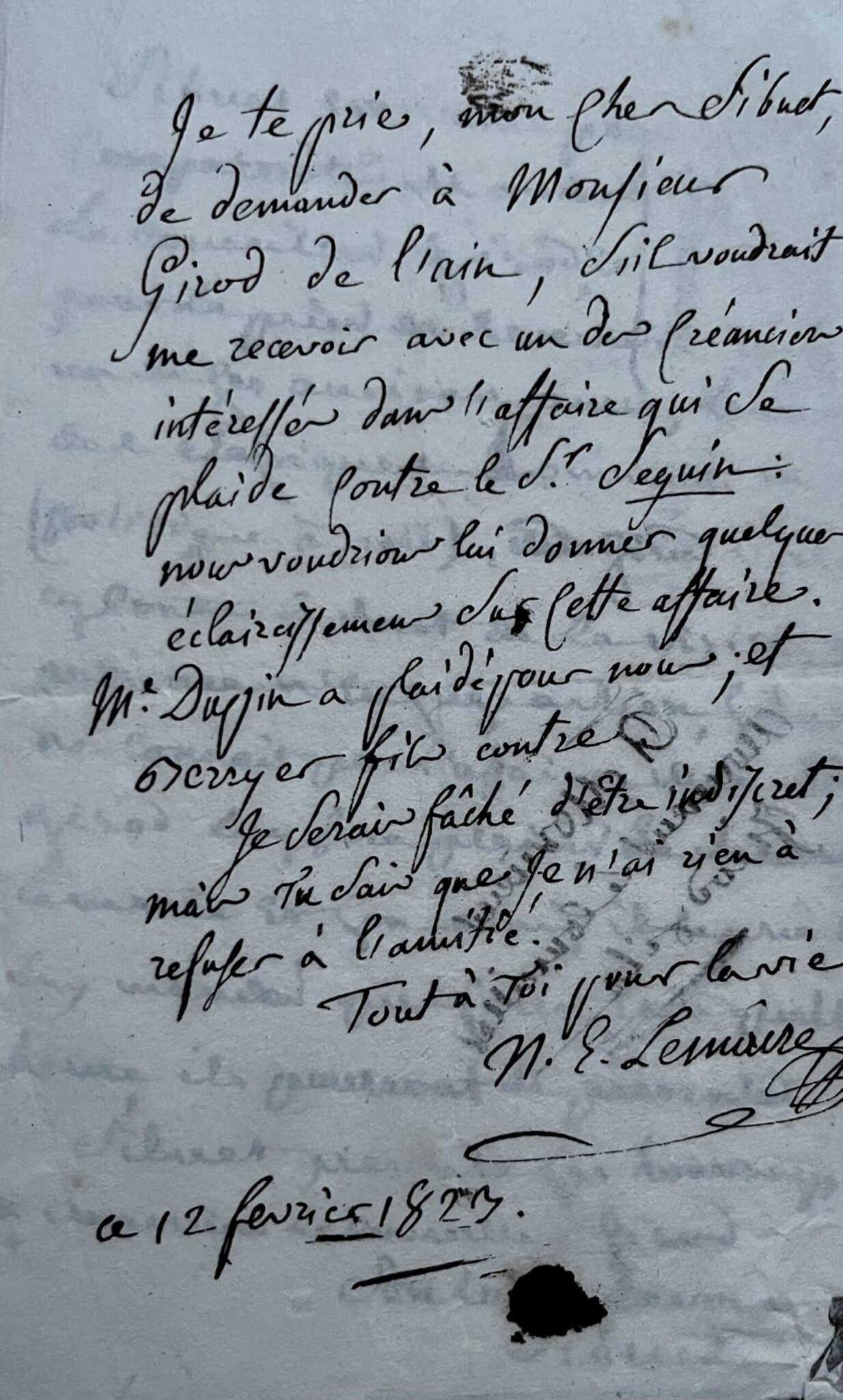 On joint une lettre de Nicolas-Éloi Lemaire à Sibuet, à propos de ladite affaire et sur le même feuillet lettre de Georges Sibuet la transmettant à Girod de l'Ain :"Je te prie, mon cher Sibuet, de demander à Monsieur Girod de l'Ain, s'il voudrait me recevoir avec un des créanciers intéressés dans l'affaire qui se plaide contre le Sr Seguin : nous voudrions lui donner quelques éclaircissements sur cette affaire. Me Dupin a plaidé pour nous ; et Berryer fils contre [...]". 12 février 1823 et s.d.2 pp. in-8.