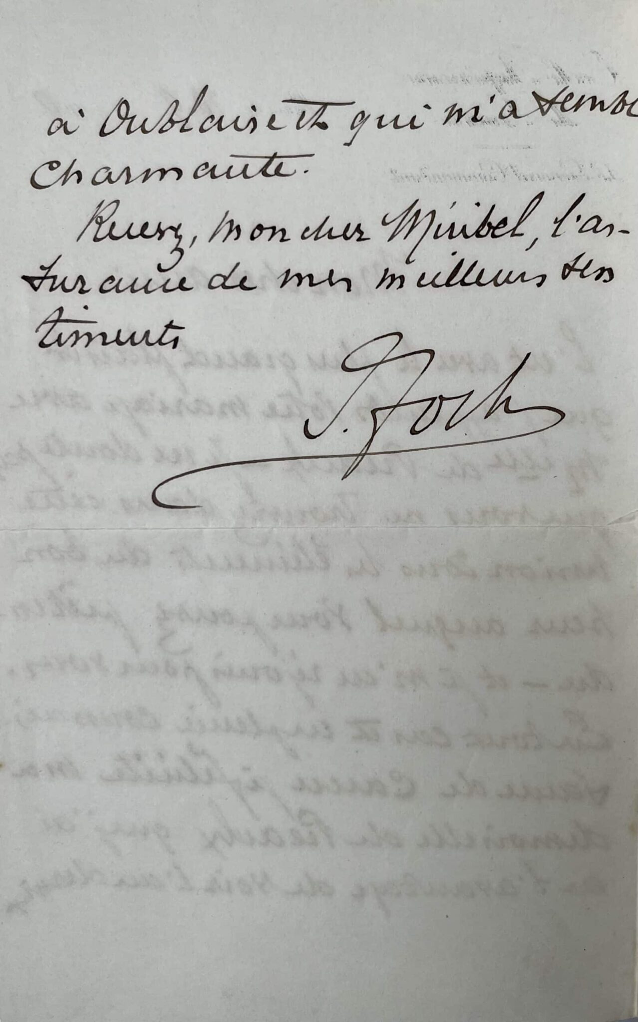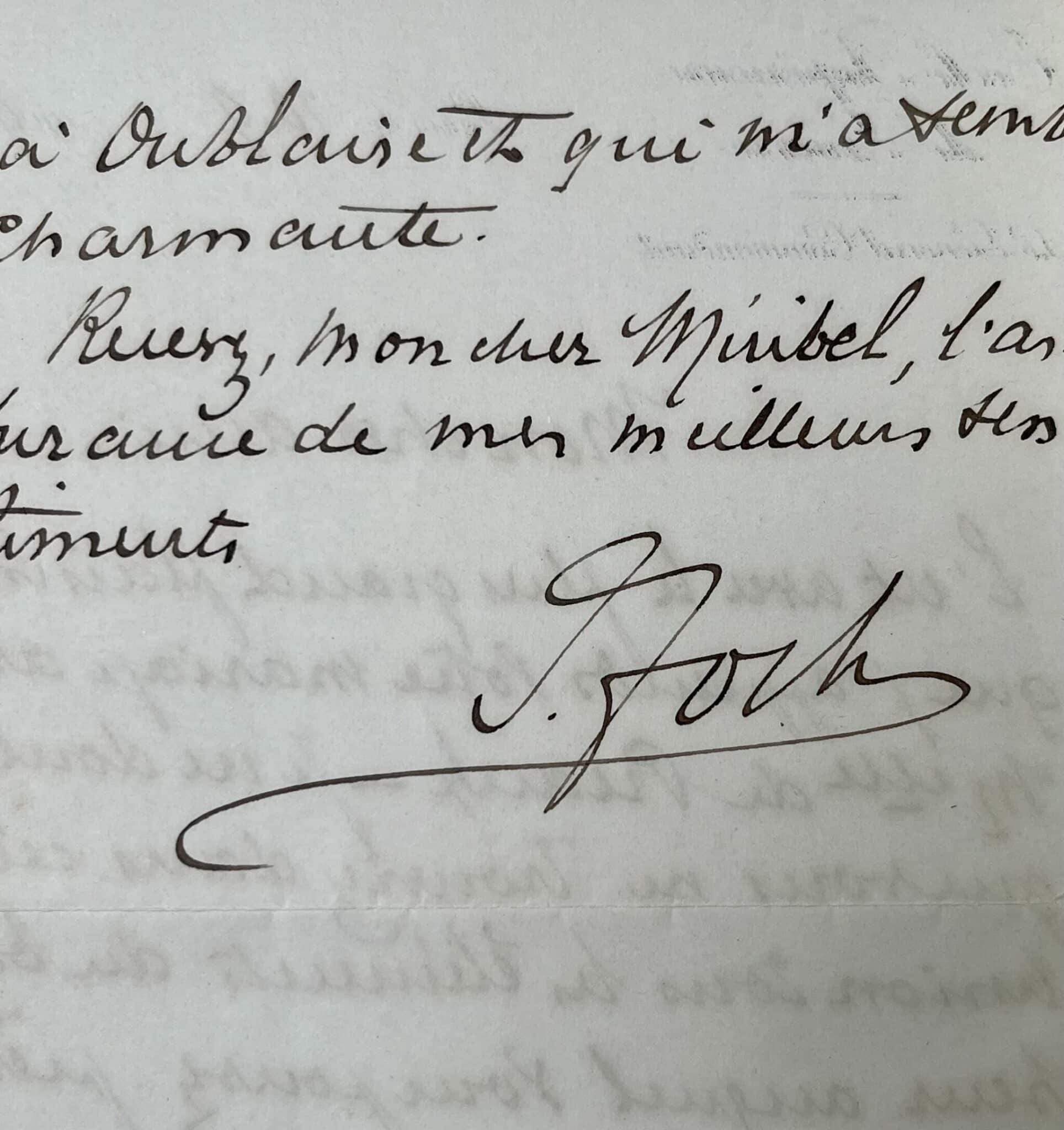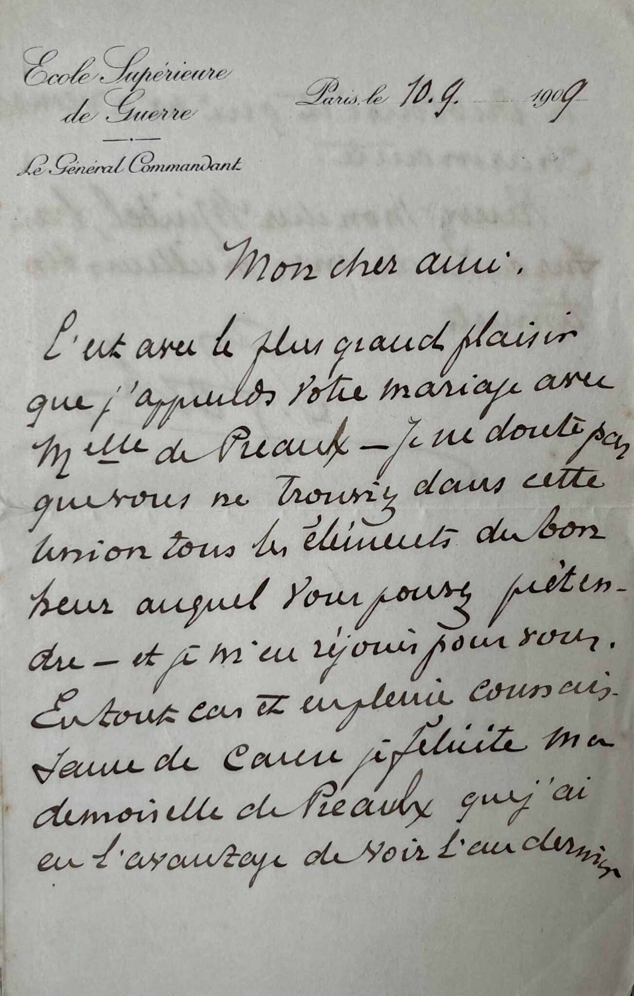 "Mon cher ami, c’est avec le plus grand plaisir que j’apprends votre mariage avec Melle de Preaulx. Je ne doute pas que vous ne trouviez dans cette union tous les éléments du bonheur auquel vous pouvez prétendre - et je m’en réjouis pour vous. En tout cas est en pleine connaissance de cause, je félicite mademoiselle de Preaulx que j’ai eu l’avantage de voir l’an dernier à Oublaise et qui m’a semblé charmante. Recevez, mon cher Miribel, l’assurance de mes meilleurs sentiments."
