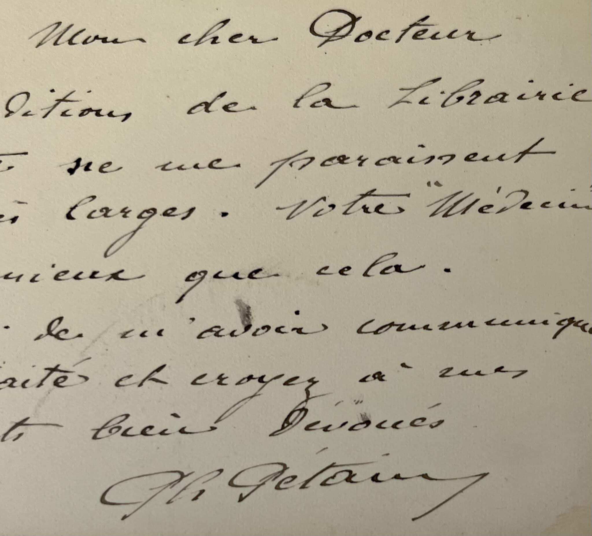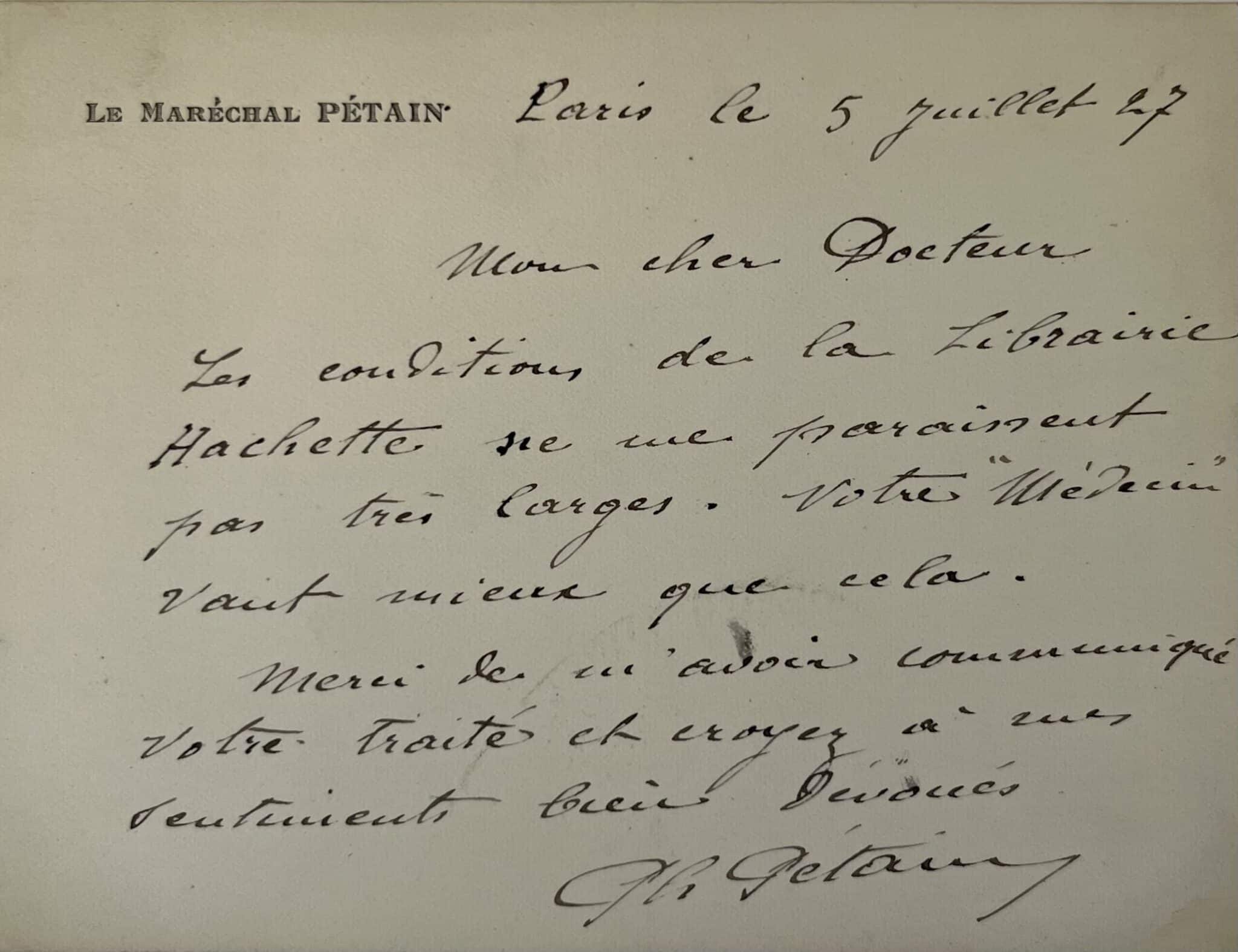 "Mon cher Docteur. Les conditions de la librairie Hachette ne me paraissent pas très larges. Votre "Médecin" vaut mieux que cela. Merci de m'avoir communiqué votre traité et croyez à mes sentiments bien dévoués. Ph. Pétain".