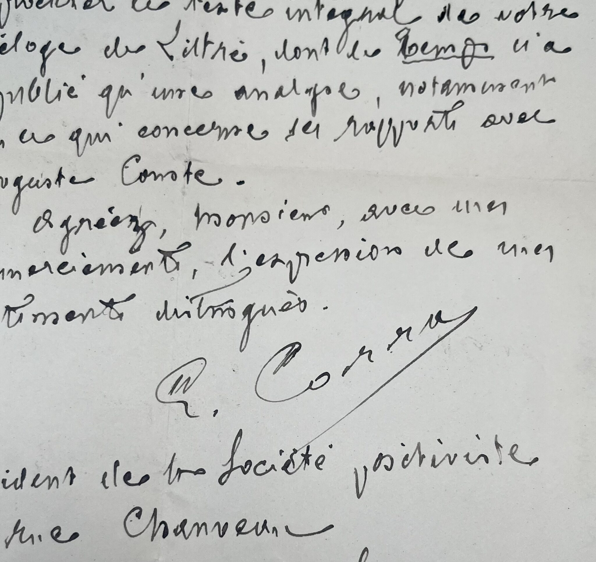"Monsieur. Je vous serais très obligé de bien vouloir m’indiquer où je pourrais me procurer le texte intégral de votre éloge de Littré, dont le Temps n’a publié qu’une analyse, notamment en ce qui concerne les rapports avec Auguste Comte. Agréer, Monsieur, avec mes remerciements, l’expression de mes sentiments distingués. E. Corra. Président de la société positiviste".