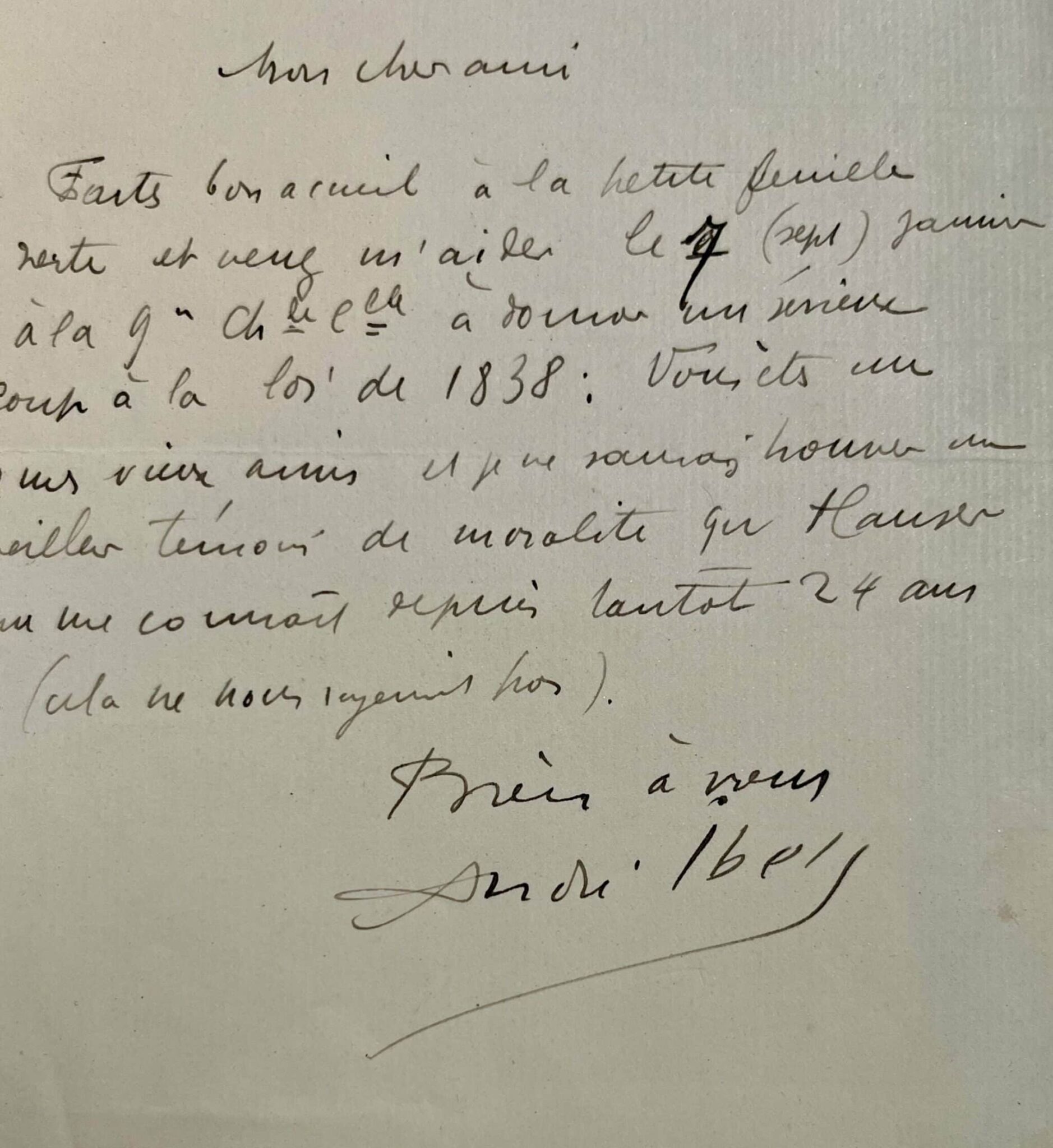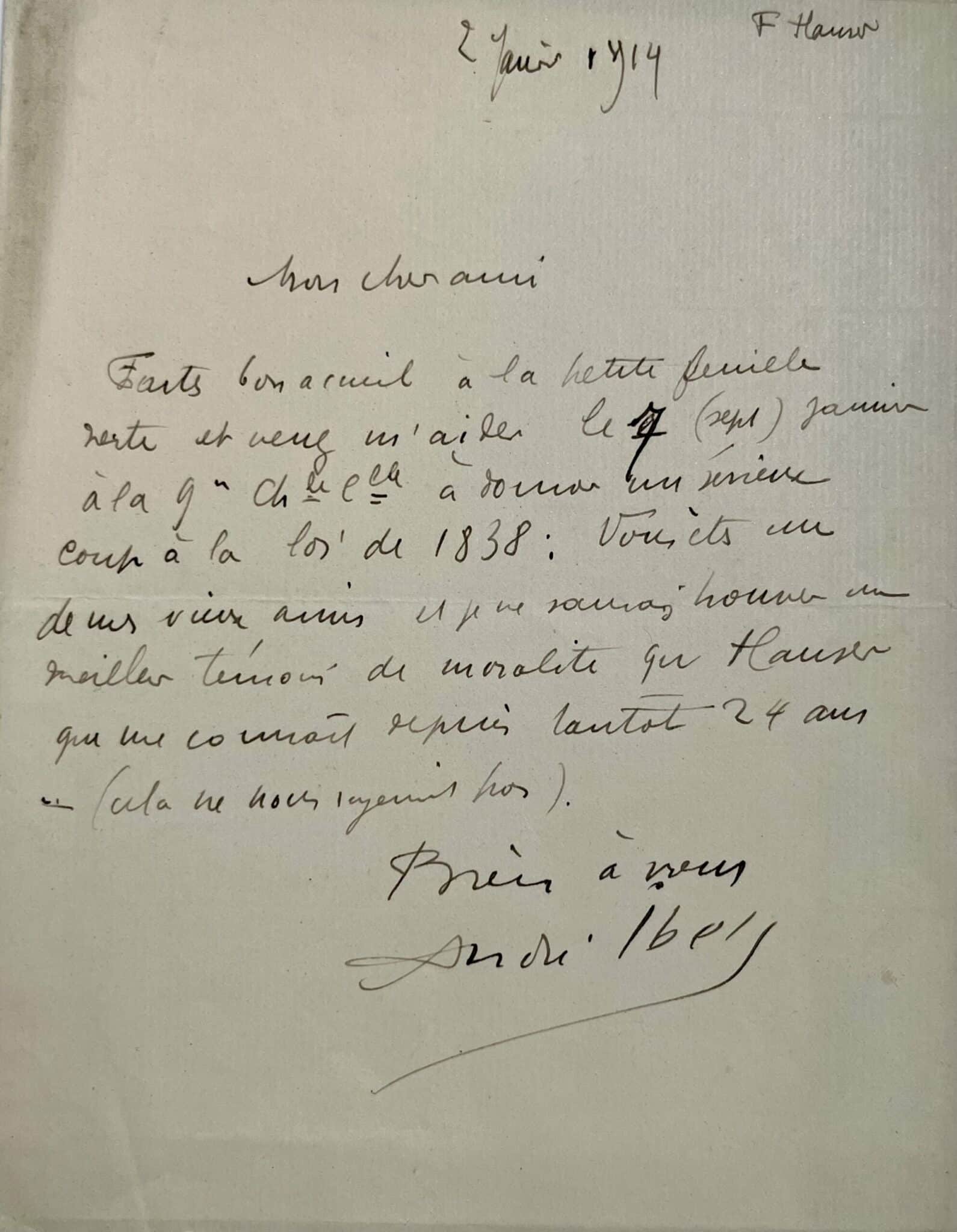 "Faites bon accueil à la petite feuille verte et venez m'aider le 7 (sept) janvier [...] à donner un sérieux coup à la loi de 1838. Vous êtes un de mes vieux amis et je ne saurais trouver un meilleur témoin de moralité que Hauser qui me connaît depuis tantôt 24 ans (cela ne nous rajeunit pas)".