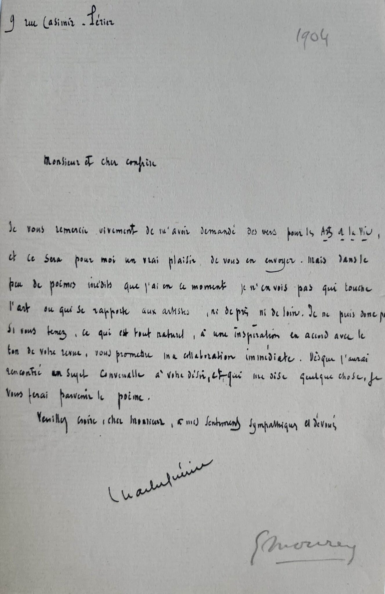 "Je vous remercie vivement de m'avoir demandé des vers pour les Arts de la vie, et ce sera pour moi un vrai plaisir de vous en envoyer. Mais dans le peu de poèmes inédits que j'ai en ce moment je n'en vois pas qui touche l'art ou qui se rapporte aux artistes, ni de près ni de loin. Je ne puis donc pas. Si vous tenez, ce qui est tout naturel, à une inspiration en accord avec le ton de votre revue, vous promettre ma collaboration immédiate, dès que j'aurai rencontré un sujet convenable a votre désir, et qui me dise quelque chose, je vous ferai parvenir le poème".