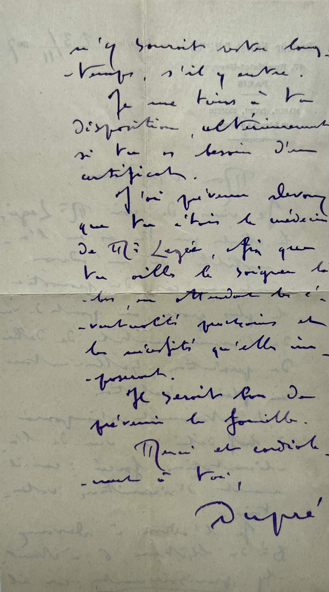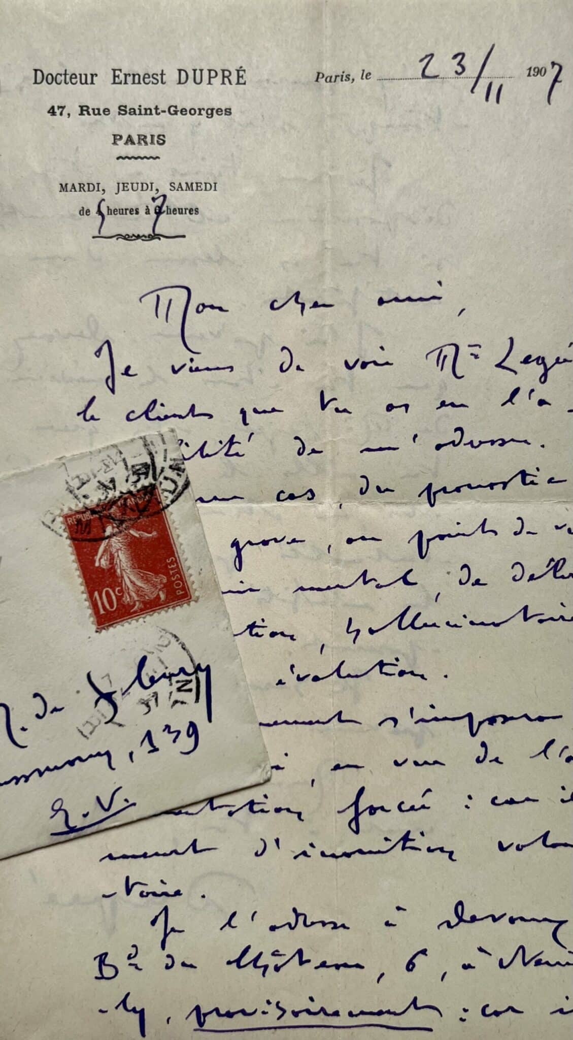 Ernest Dupré (Marseille , 1862/1921)"Mon cher ami, je viens de voir M. Legée, le client que tu as eu l’amabilité de m’adresser. C’est un cas du pronostic le plus grave, au point de vue de l’avenir mental, du délire de persécution, hallucinatoire, en pleine évolution. L’internement s’impose à bref délai, en vue de l’acclimatation forcé [...]. Je l’adresse à Devaux [...] à Neuilly, provisoirement : car il n’y saurait rester longtemps, s'il y entre. Je me tiens à ta disposition ultérieurement, si tu as besoin d’un certificat. J’ai prévenu Devaux que tu étais le médecin de M. Legée, afin que tu ailles le soigner là-bas, en attendant les éventualités prochaines et les nécessités qu'elles imposeront. Il serait bon de prévenir la famille [...]".
