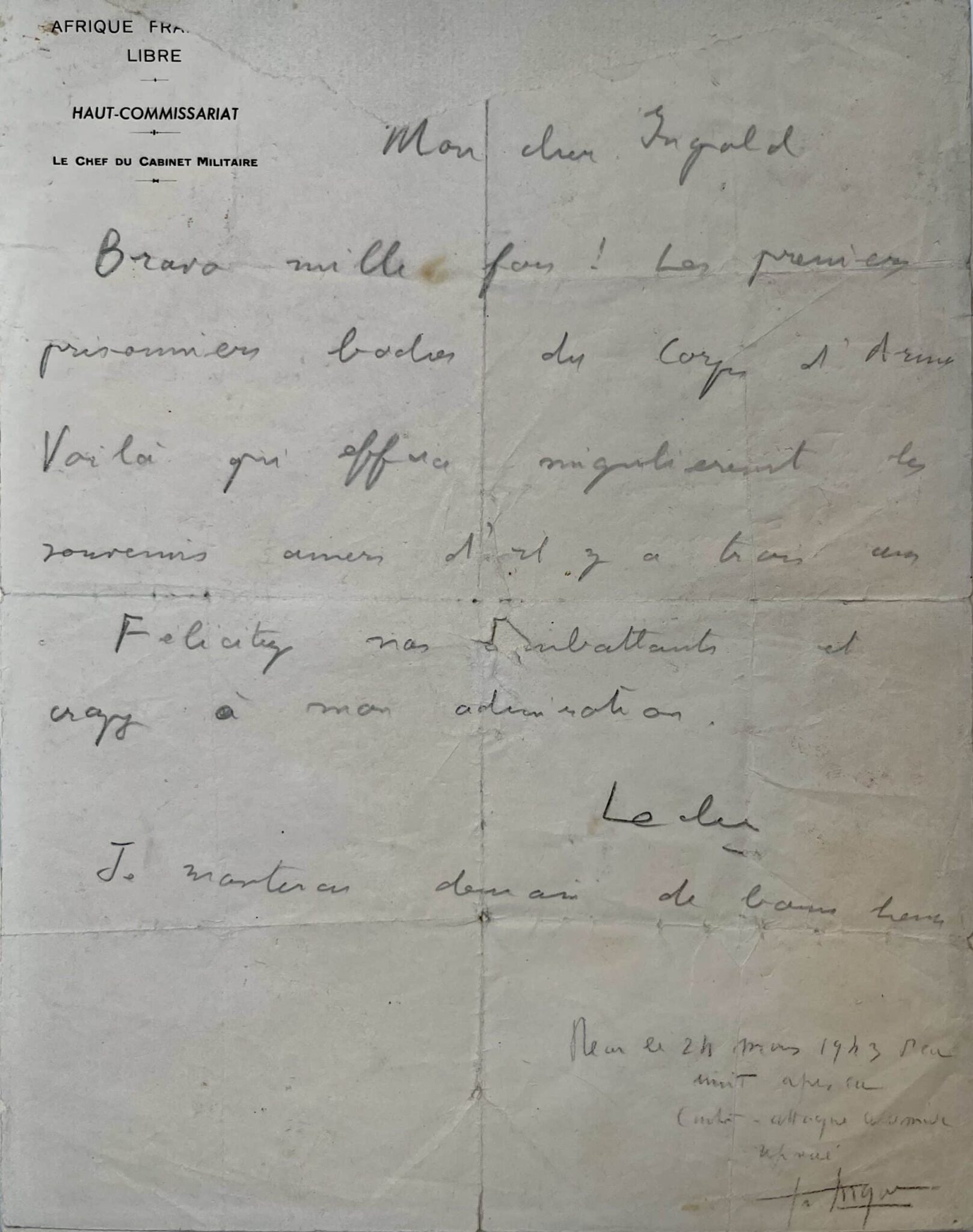 "Mon cher Ingold, Bravo mille fois ! Les premiers prisonniers boches du Corps d'Armée. Voilà qui efface singulièrement les souvenirs amers d'il y a trois ans. Félicitez nos combattants et croyez à mon admiration. Leclerc. Je ponterai demain de bonne heure".