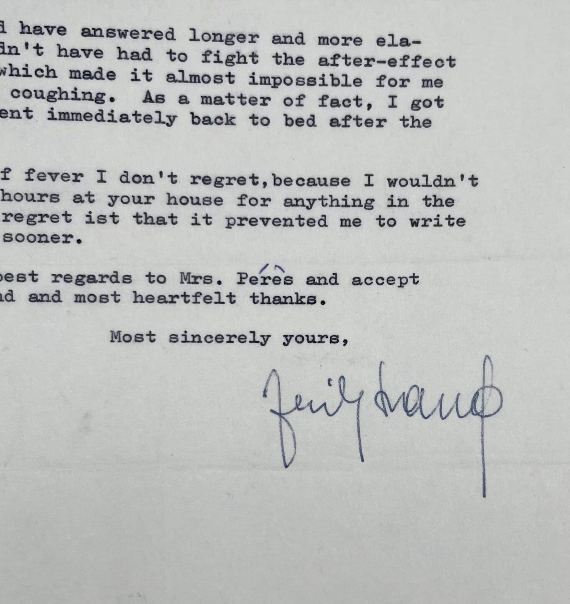 "Dear Mr. Consul General. I would like to thank you herewith once more for the lavish reception you gave for me and my friends. The kind and warm words of your speech touched me deeply. I certainly would have answered longer and more elaborate if I wouldn't have had to fight the after-effect of a severe flu which made it almost impossible for me to speak without coughing. As a matter of fact, I got out of bed and went immediately back to bed after the reception. The recurrence of fever I don't regret, because I wouldn't have missed the hours at your house for anything in the world. My only regret is that it prevented me to write you this letter sooner. Please give my best regards to Mrs. Pérès and accept again my profound and most heartfelt thanks".