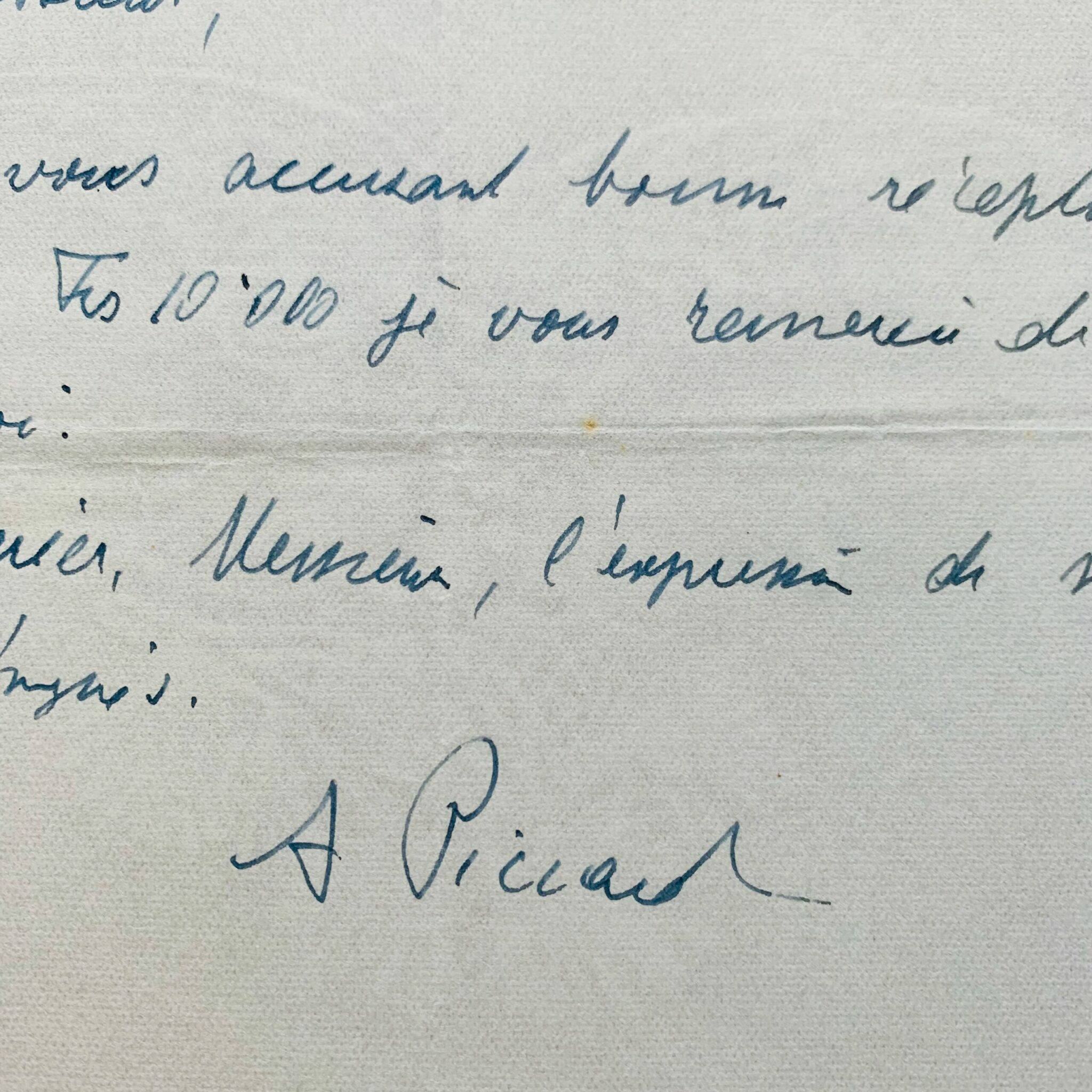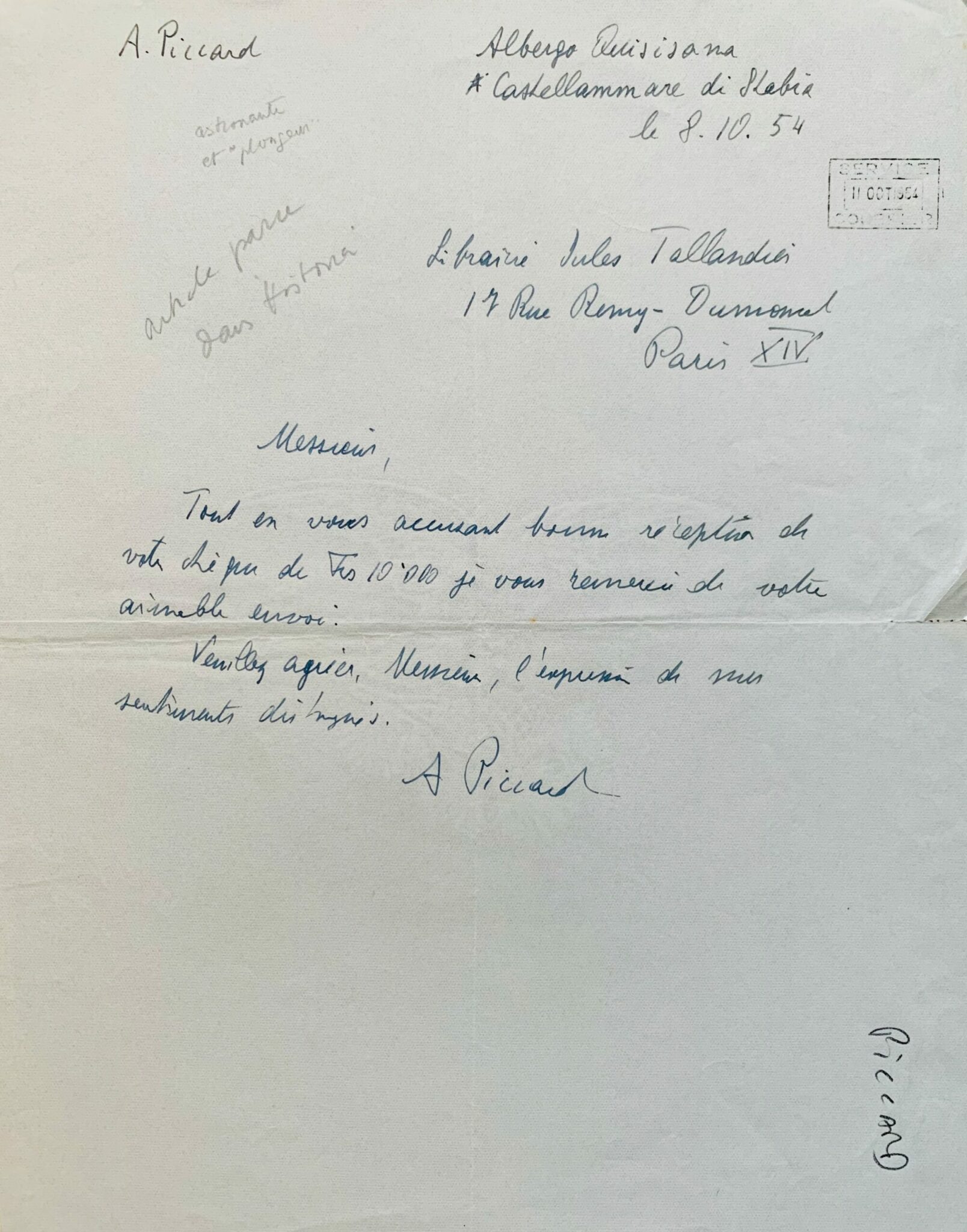 Auguste Piccard accuse réception du chèque de 10.000 francs de la librairie Tallandier en rémunération de l'article paru dans la revue Historia (selon une note au crayon)