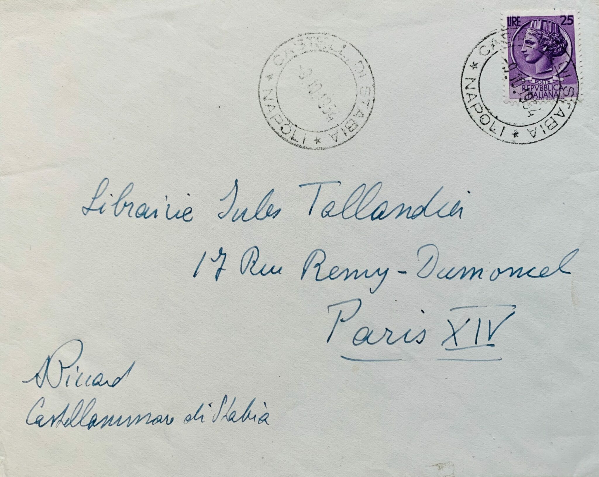 Cachet d'arrivée du courrier (à la date du 11 octobre 1954). Enveloppe autographe timbrée.