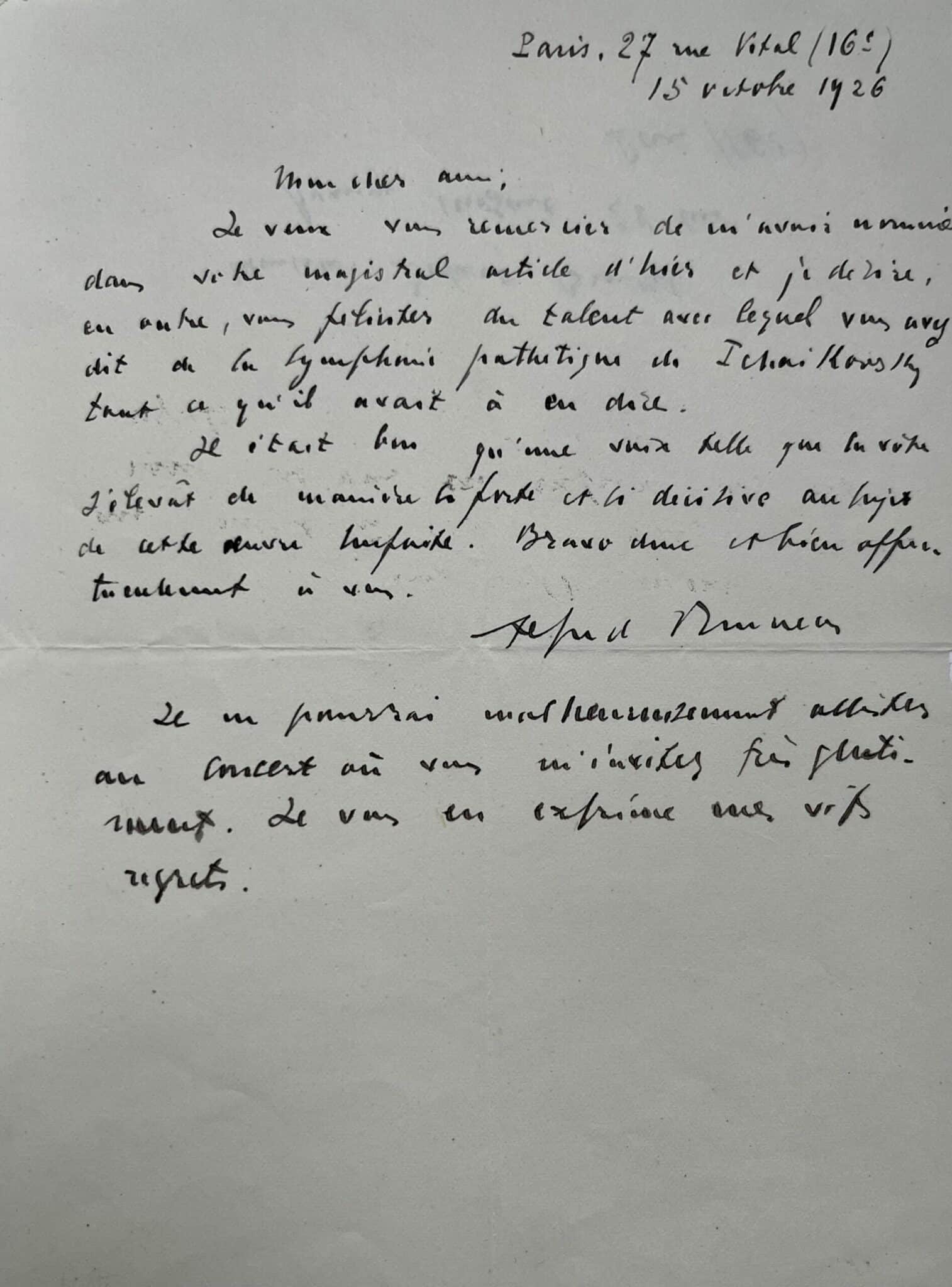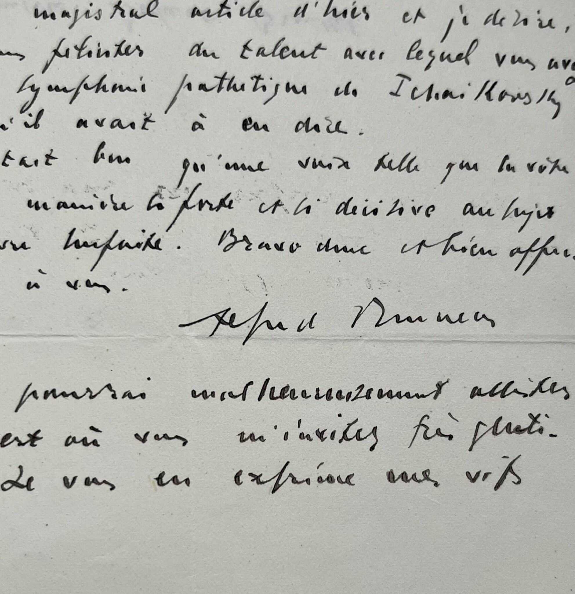 "Mon cher ami, je veux vous remercier de m'avoir nommé dans votre article magistral article d'hier et je désire, en outre, vous féliciter du talent avec lequel vous avez dit de la symphonie pathétique de Tchaikovsky tout ce qu'il y avait à en dire. Il était bien qu'une voix telle que la vôtre s'élevât de manière si forte et si décisive au sujet de cette oeuvre imparfaite. Bravo donc [...]. Je ne pourrai malheureusement assister au concert où vous m'invitez [...]".