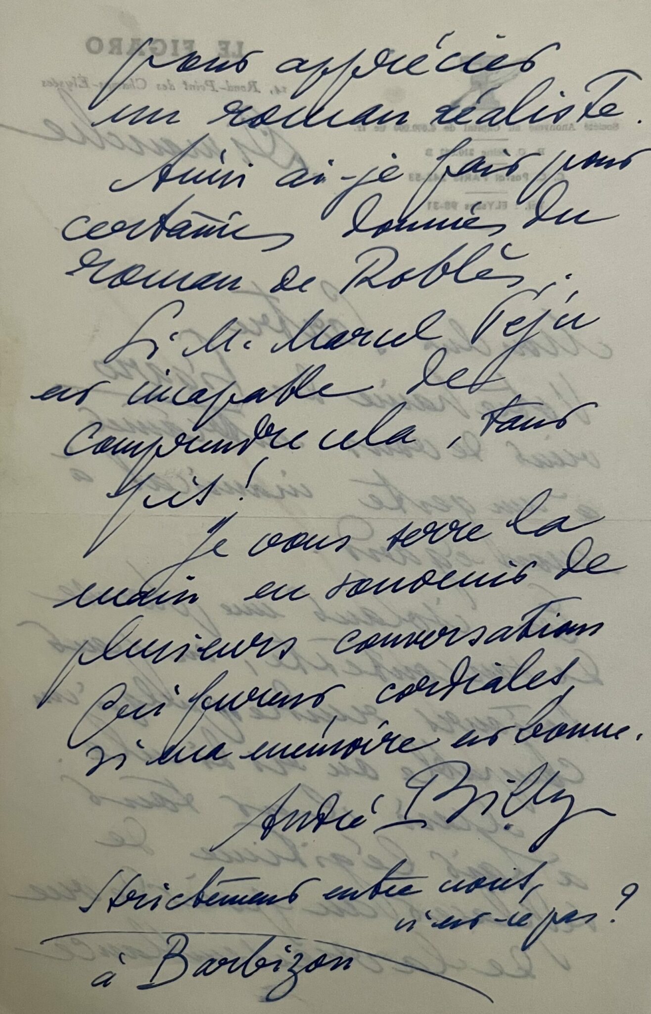 "Mon cher Sartre. Votre haine du Figaro vient de vous entraîner à un geste inamical à mon égard. En isolant une phrases de son contexte, on peut toujours rendre quelqu’un coupable ou ridicule. Mais il est tout à fait légitime de se placer au point de vue de la vraisemblance pour apprécier un roman réaliste. Ainsi ai-je fait pour certaines données du roman de Roblès [l'écrivain Emmanuel Roblès (]. Si M. Marcel Péju [( journaliste français, secrétaire général de la revue de Sartre Les Temps modernes de 1953 à 1962] est incapable de comprendre cela, tant pis ! Je vous serre la main en souvenir de plusieurs conversations qui furent cordiales si ma mémoire est bonne. André Billy". Il ajoute "Strictement entre nous n’est-ce pas ?".