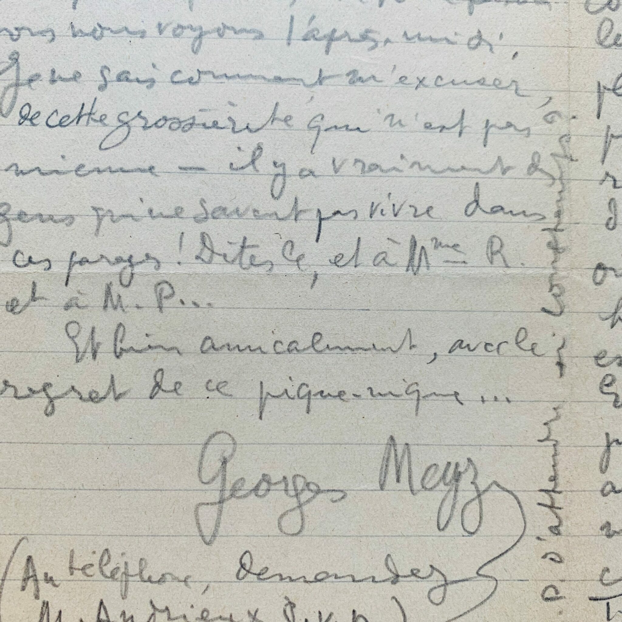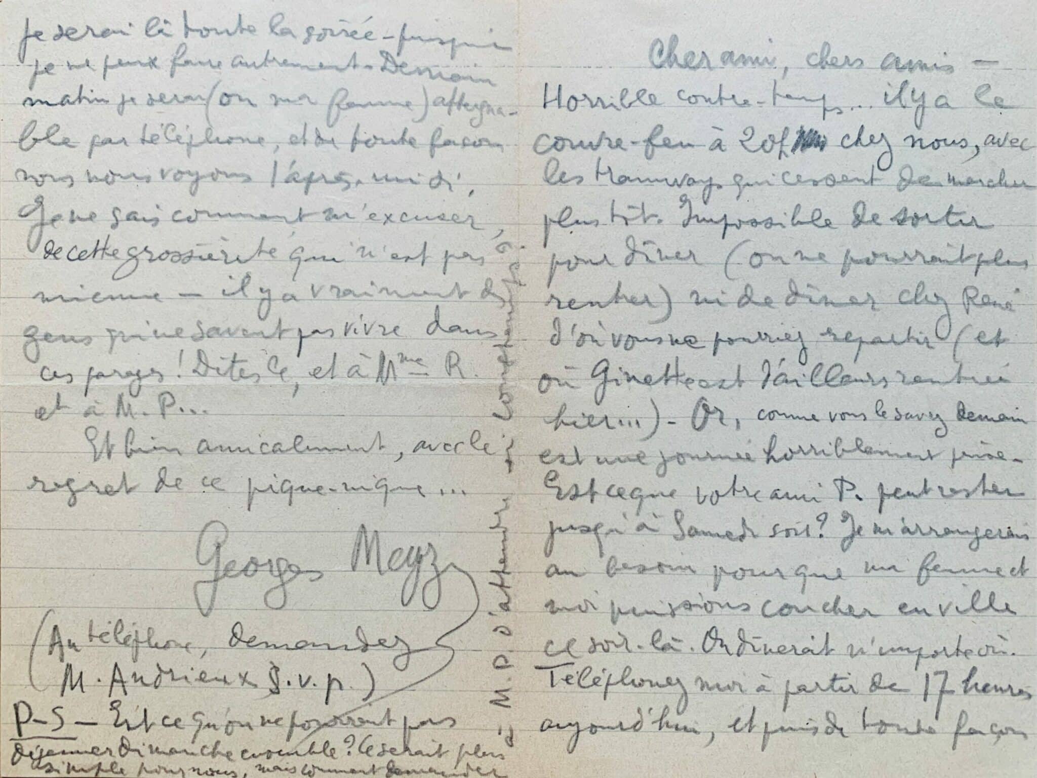 Louis Aragon (Paris, 1897/1982)"Horrible contretemps... il y a le couvre-feu à 20h chez nous, avec les tramways qui cesseront de marcher plus tôt. Impossible de sortir pour dîner (on ne pourrait plus rentrer) ni dîner chez René d'où vous ne pourriez repartir (et où Ginette est d'ailleurs rentrée hier). Or, comme vous le savez demain est une journée horriblement prise. Est-ce que votre ami P. peut rester jusqu'à samedi soir? Je m'arrangerais au besoin pour que ma femme et moi puissions coucher en ville ce soir-là. On dînerait n'importe où. Téléphonez-moi à partir de 17 heures aujourd'hui, et puis de toute façon je serai là toute la soirée - puisque je ne peux faire autrement. Demain matin je serai (ou ma femme) atteignable par téléphone, et de toute façon nous nous voyons l'après-midi. Je ne sais comment m'excuser de cette grossièreté qui n'est pas mienne. Il y a vraiment des gens qui ne savent pas vivre dans ces parages! Dites-le , et à Mme R. et à M. P... Et bien amicalement, avec le regret de ce pique-nique... Georges Meyz. (Au téléphone, demandez M. Andrieux s.v.p.)