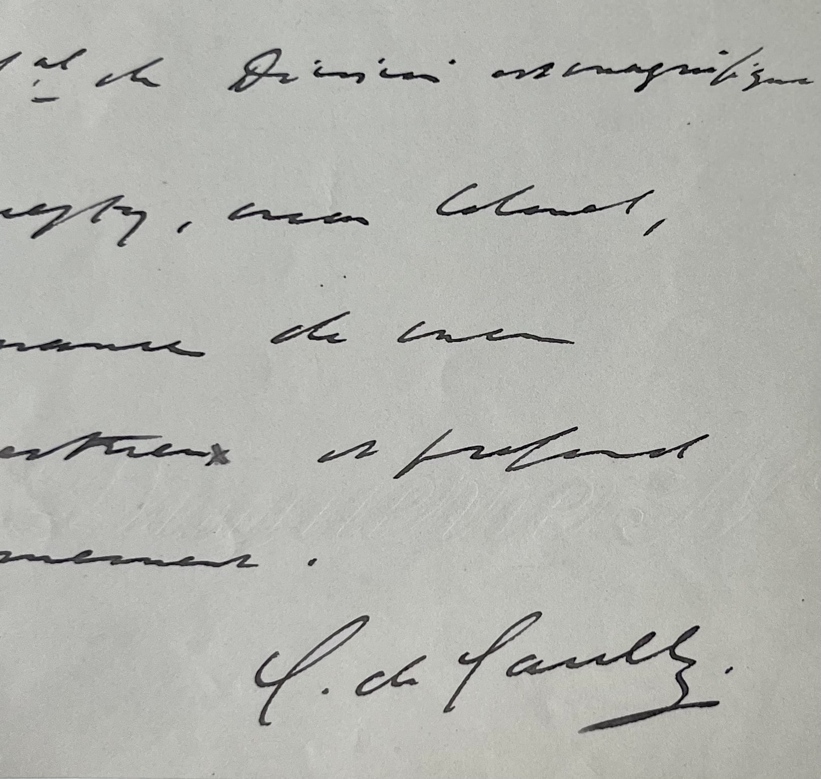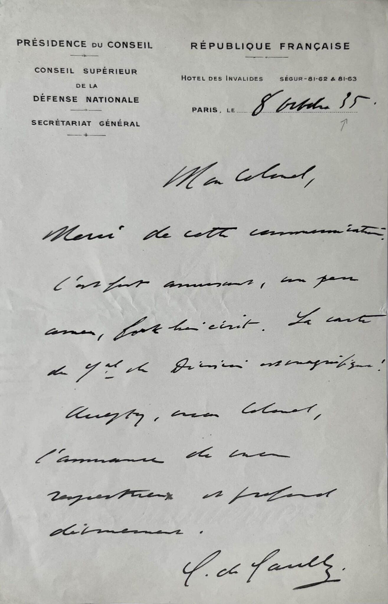 "Merci de cette communication. C'est fort amusant, un peu amer, fort bien écrit. La carte du Gal de division est magnifique ! Acceptez, mon Colonel, l'assurance de mon respectueux et profond dévouement. C. de Gaulle".