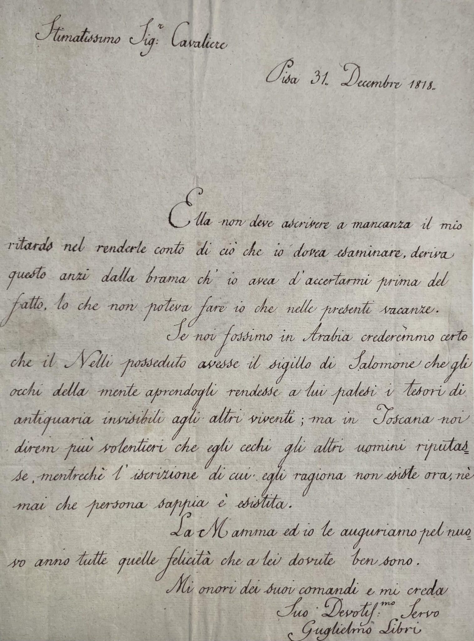 Traduction : "Vous ne devez pas imputer à une faute mon retard à vous rendre compte de ce que j'étais censé examiner ; il découle plutôt de mon empressement à le faire pendant les présentes vacances. Si nous étions en Arabie, nous croirions certainement que le possédé Nelli avait le sceau de Salomon qui, en ouvrant les yeux de son esprit, lui ferait comprendre les trésors de l'antiquité invisibles aux autres êtres vivants ; mais en Toscane nous dirions plutôt qu'il a rejeté aveuglément les autres hommes, puisque l'inscription dont il parle n'existe plus aujourd'hui, et que personne qui la connaît n'a jamais existé. Maman et moi te souhaitons tout le bonheur pour cette nouvelle année [...]".