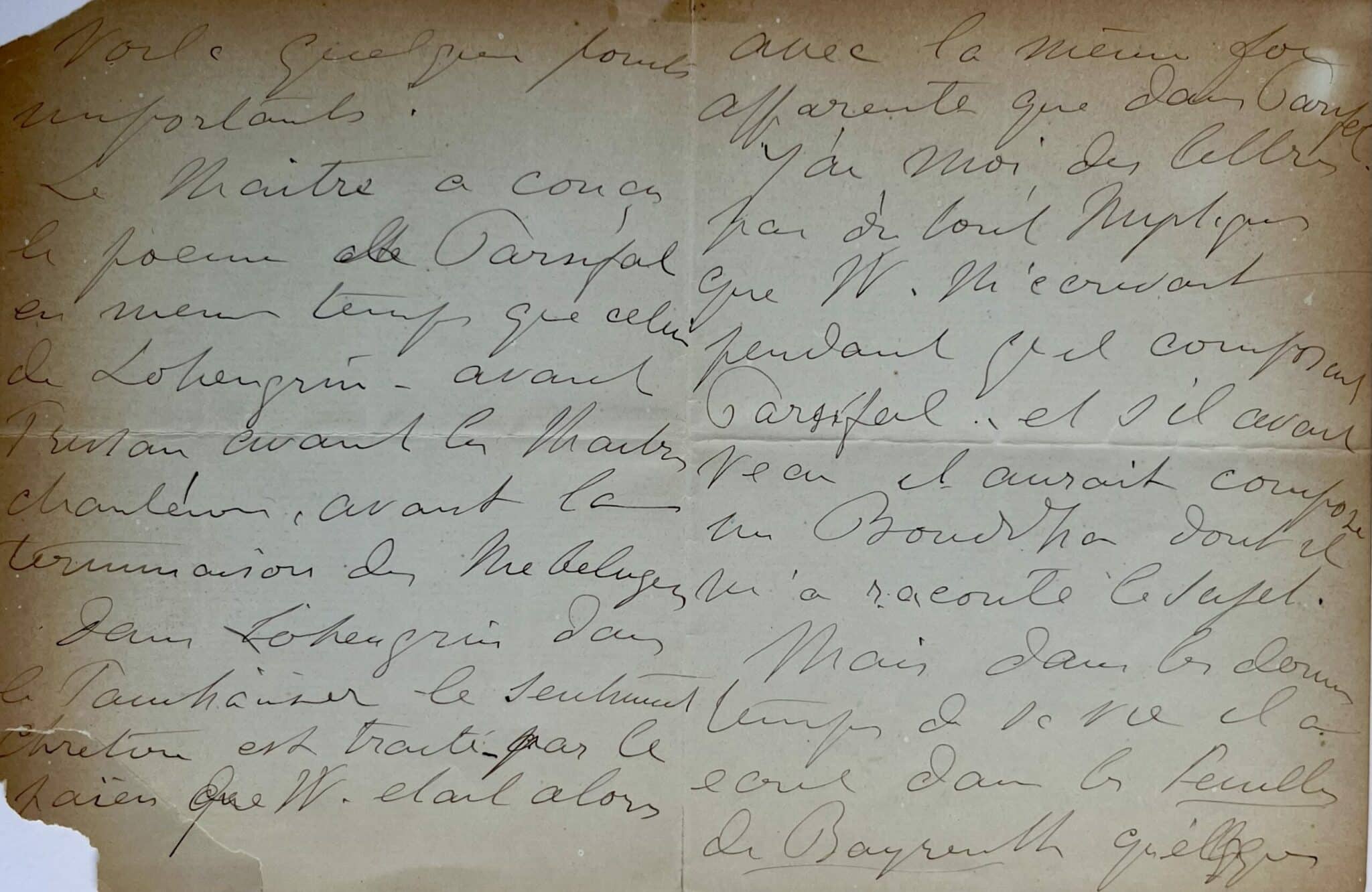 "Cher ami. Vous avez tout à fait raison, je le crois bien, mais la question est assez compliquée. J’aimerais mieux en causer avec vous car par atavisme une lettre est toujours une grande pénitence pour moi. Voilà quelques points importants. Le Maitre a conçu le poème de Parsifal en même tant que celui de Lohengrin - avant Tristan, avant les Maîtres Chanteurs, avant la terminaison des Nibelungen. Dans Lohengrin dans le Tannhäuser, le sentiment chrétien est traité par le païen que W. était alors avec la même foi apparente que dans Parsifal. J’ai moi, des lettres pas du tout mystiques que W. m’écrivait pendant qu’il composait Parsifal, et s’il avait vécu, il aurait composé un Bouddha dont il m’a raconté le sujet. Mais dans les derniers temps de sa vie, il a écrit dans les Feuilles de Bayreuth quelques phrases ambiguës sur lesquelles peut peut-être s’appuyer votre philosophie. Je voudrais avoir le texte. C’est en allemand et je ne sais guère la date des articles. Si vous voulez poursuivre la question à fond, dites-le-moi, nous chercherons".