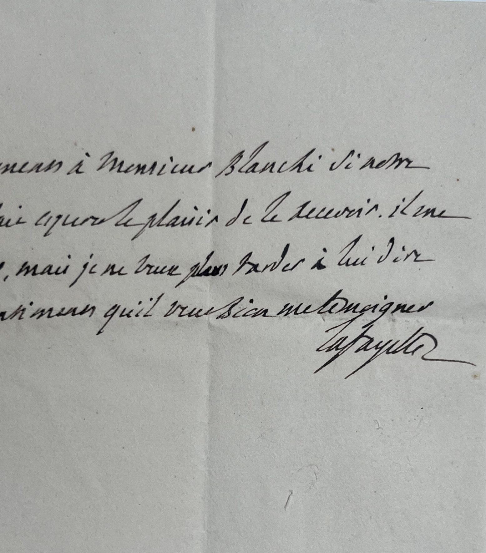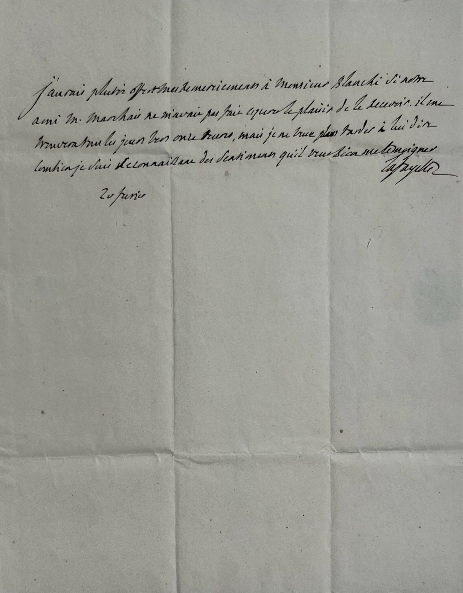 "J'aurais plutôt offert mes remerciements à M. Blanqui si notre ami M. Marchais ne m'avait pas fait espérer le plaisir de le recevoir. Il me trouvera tous les jours vers onze heures, mais je ne veux plus tarder à lui dire combien je suis reconnaissant des sentiments qu'il veut bien me témoigner. Lafayette".