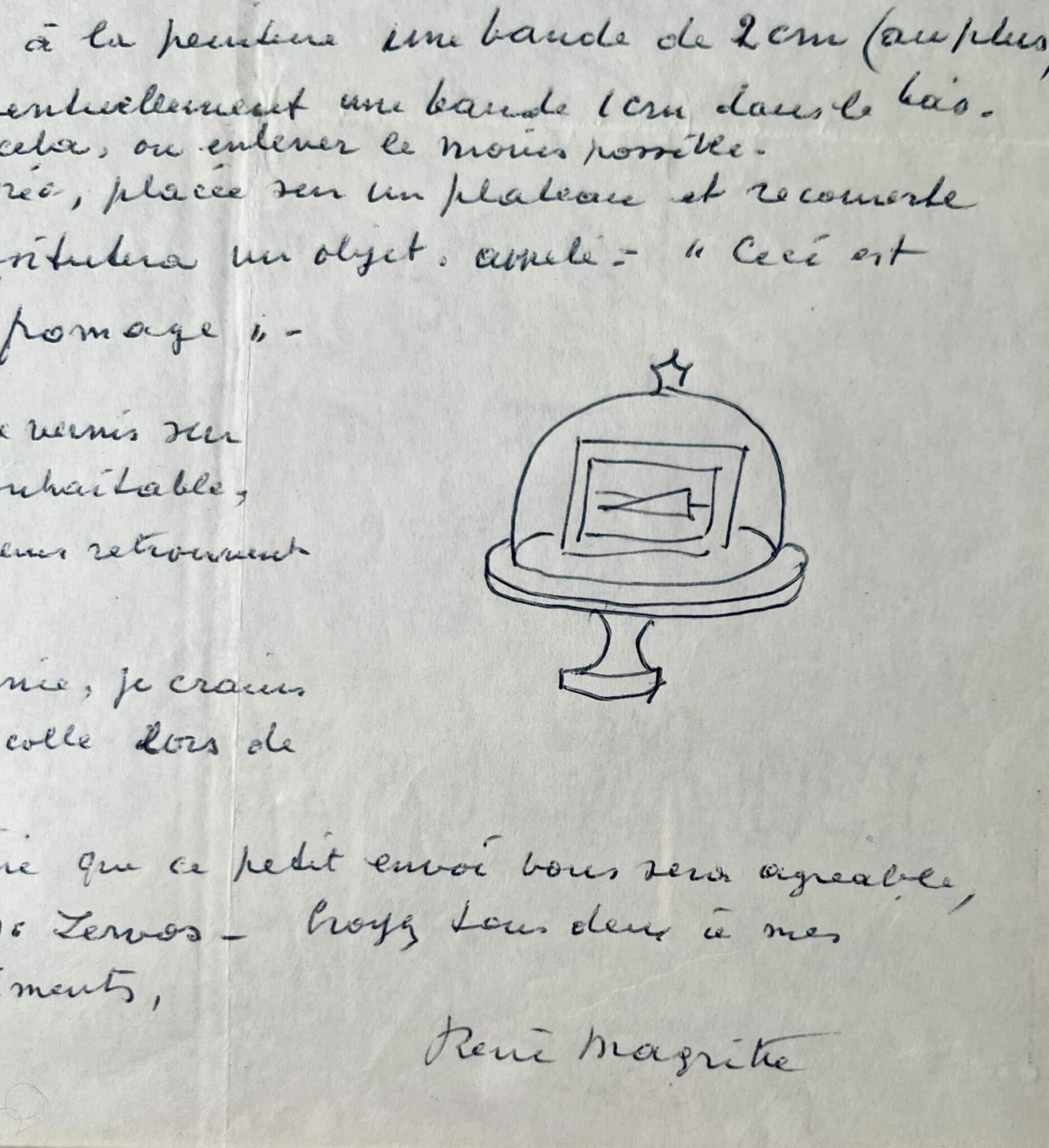 Dans cette lettre il donne des consignes pour l'encadrement d'une toile, décrivant avec précision son installation sous une cloche à fromage, afin de constituer un objet intitulé « Ceci est un morceau de fromage ».