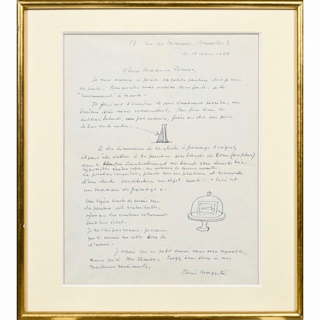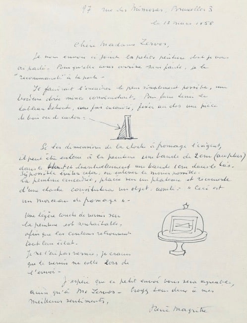 René Magritte (Lessines, Belgique, 1898/1967)Exceptionnelle lettre de René Magritte, illustrée de deux croquis de sa main, adressée à la galeriste Yvonne Zervos (1905-1970), épouse de Christian Zervos (1889-1970), critique d’art et éditeur, fondateur de la maison d’édition des Cahiers d’Art.