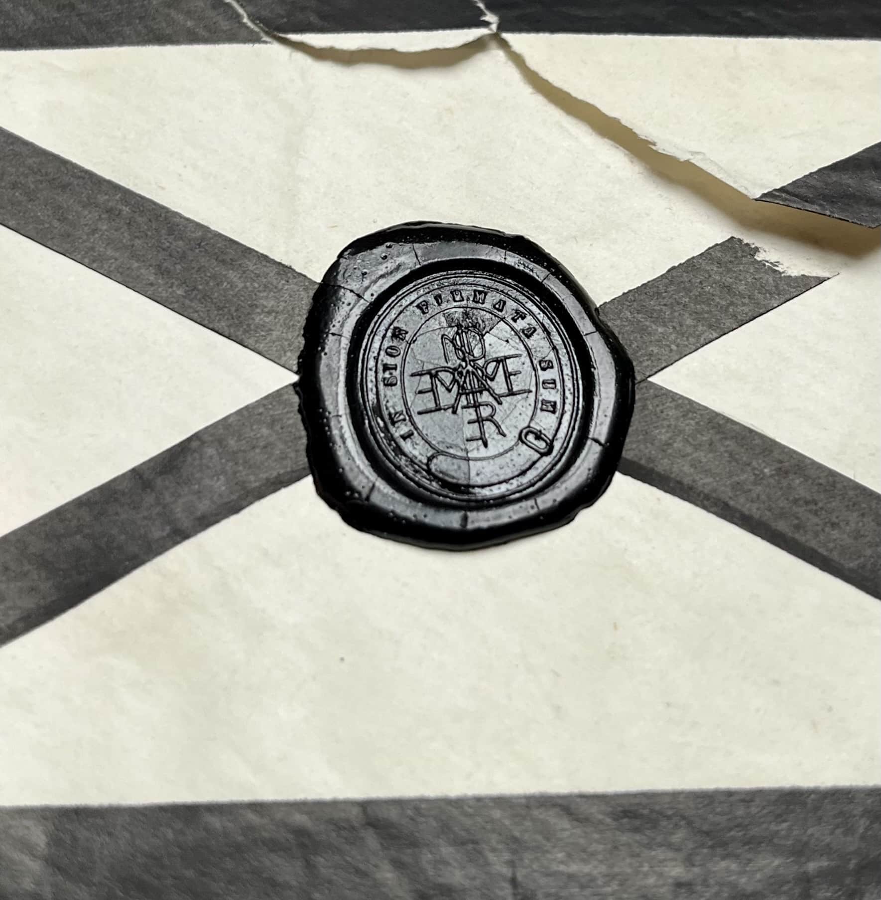 Enveloppe conservée. Papier de deuil avec beau cachet de cire noire portant la devise "In Sion firmata sum" et .