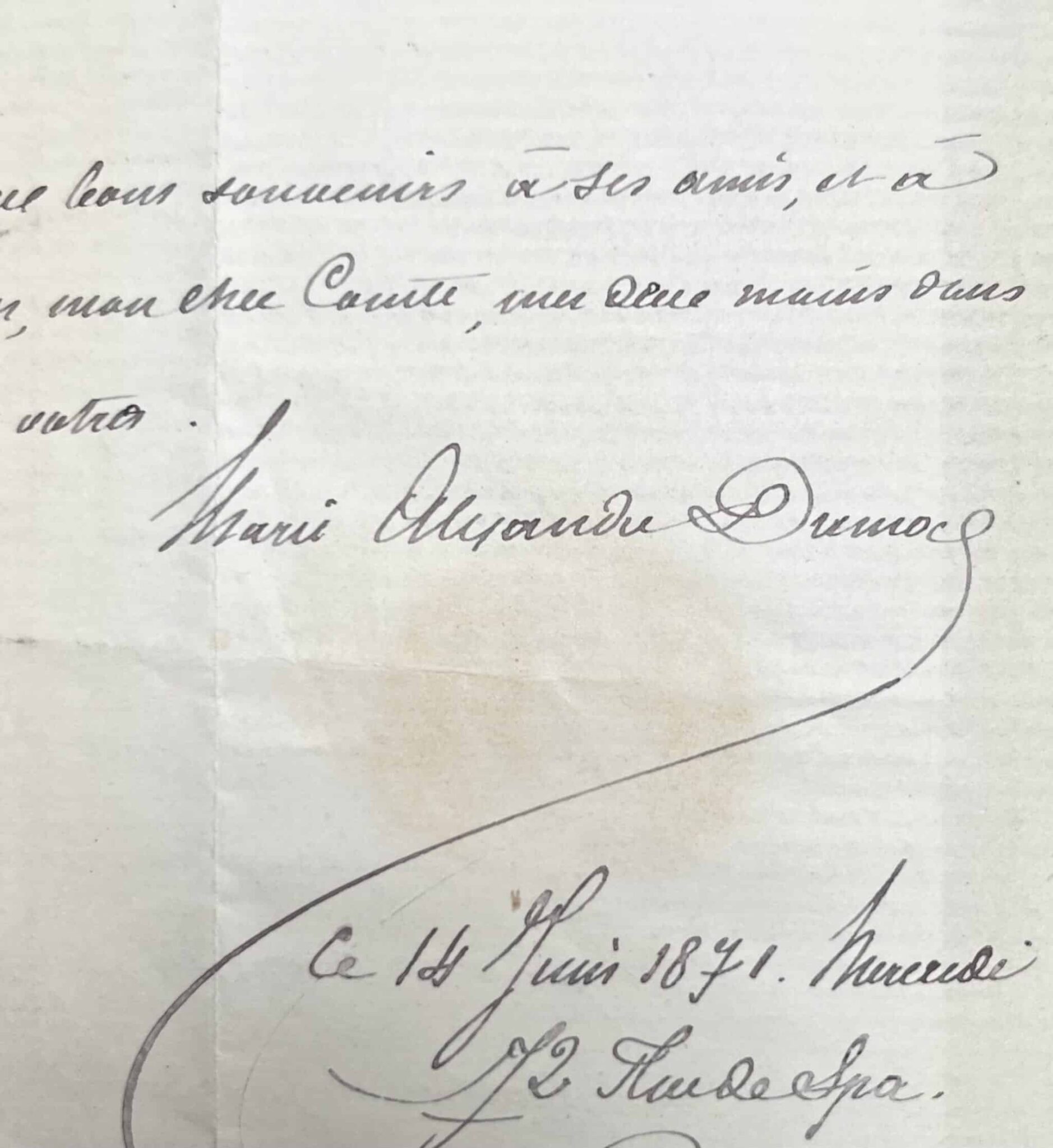 Lettre de Marie Alexandre Dumas, fille de l’illustre écrivain, datée de 1871