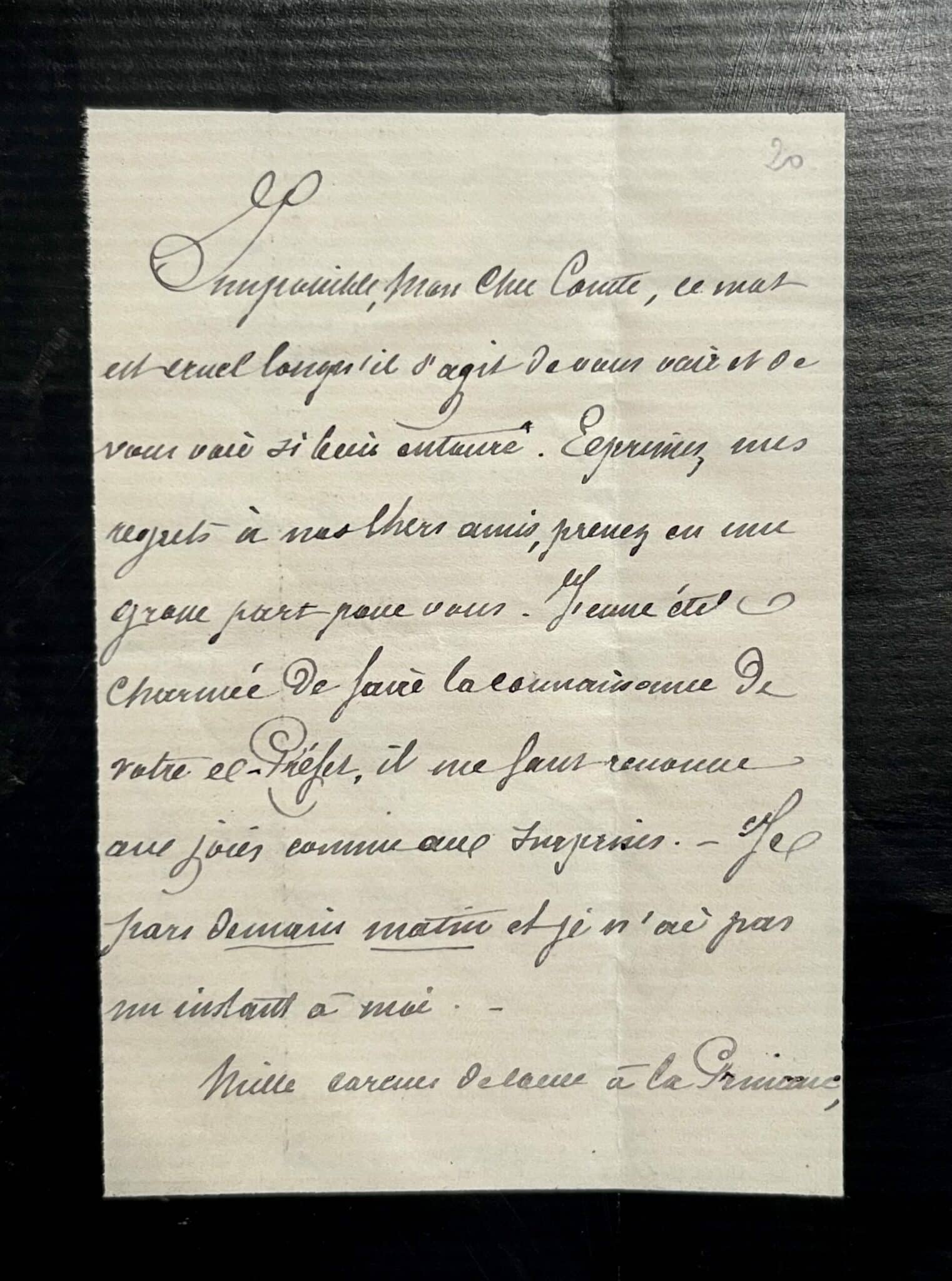 "Impossible mon cher Comte, ce mot est cruel lorsqu’il s’agit de vous voir et de vous voir si bien entouré. Exprimer mes regrets à nos chers amis, prenez-en une grosse part pour vous. J'eusse été charmée de faire la connaissance de votre ex-Préfet, il me faut renoncer aux joies comme aux surprises. Je pars demain matin et je n’ai pas un instant à moi. Mille caresses de cœur à la Princesse, doux bons souvenirs à ses amis, et à vous, mon cher Comte, mes deux mains dans les vôtres. Marie Alexandrine Dumas".