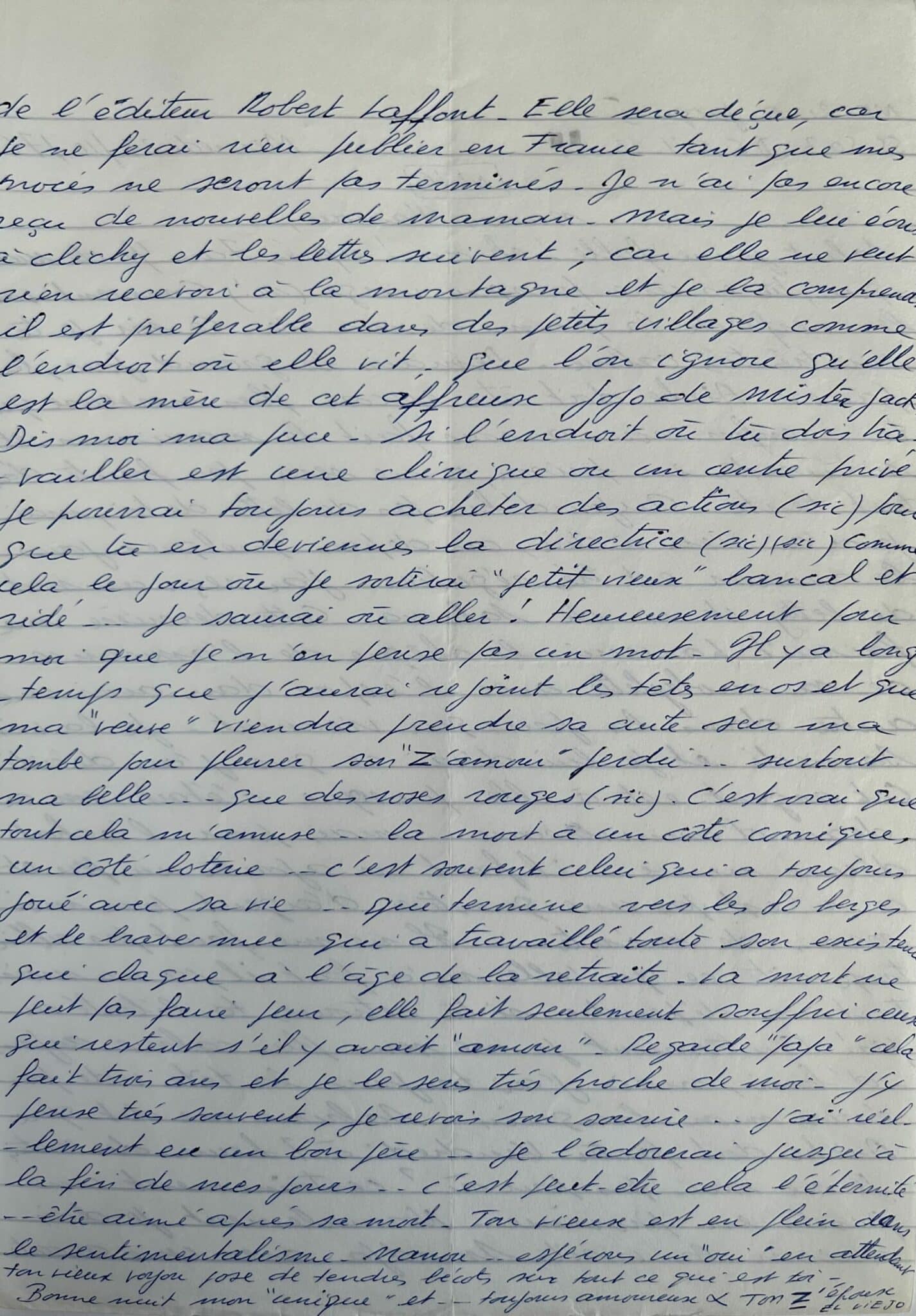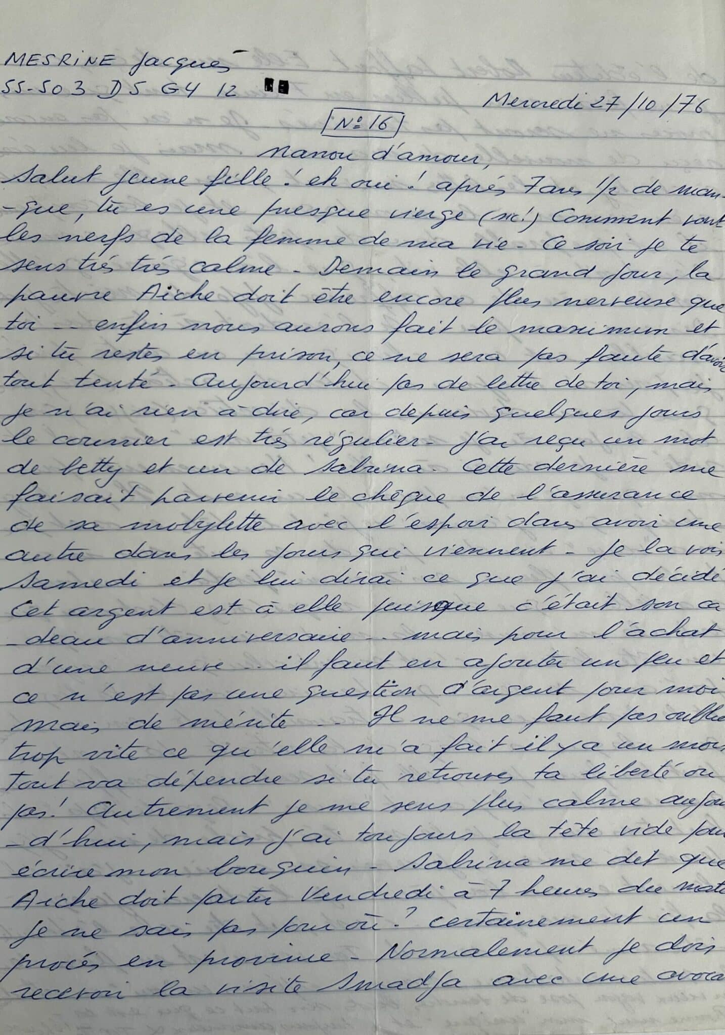 "Salut jeune fille ! eh oui ! après 7 ans ½ de manque, tu es une presque vierge (sic !). Comment vont les nerfs de la femme de ma vie. Demain le grand jour […] Enfin, nous aurons fait le maximum et si tu restes en prison, ce ne sera pas faute d'avoir tout tenté […] ». Il lui parle de sa fille Sabrina et de l'achat d'une mobylette neuve. « Ce n'est pas une question d'argent pour moi mais de mérite. Il ne me faut pas oublier trop vite ce qu'elle m'a fait il y a un mois. Tout va dépendre si tu retrouves ta liberté ou non. Autrement je me sens plus calme aujourd'hui, mais j'ai toujours la tête vide pour écrire mon bouquin […]. Normalement je dois recevoir la visite de Smadja [son avocat] avec une avocate de l'éditeur Robert Laffont. Elle sera déçue car je ne ferai rien publier en France tant que mes procès ne seront pas terminés". Il parle de sa mère qui vit à la montagne et ne veut pas recevoir ses lettres. "Je la comprends, il est préférable dans des petits villages comme l'endroit où elle vit, que l'on ignore qu'elle est la mère de cet affreux jojo de mister Jack". Il évoque sa possible sortie de prison, il irait alors travailler avec elle dans une clinique ou un centre privé. "Heureusement pour moi, je n'en pense pas un mot. Il y a longtemps que j'aurai rejoint les têtes en os et que ma « veuve » viendra prendre sa cuite sur ma tombe pour pleurer son « z'amour » perdu… surtout ma belle… que des roses rouges (sic). C'est vrai que tout cela m'amuse… la mort a un côté comique, un côté loterie… c'est souvent celui qui a toujours joué avec sa vie… qui termine vers les 80 berges et le brave mec qui a travaillé toute son existence qui claque à l'âge de la retraite. La mort ne peut pas faire peur, elle fait seulement souffrir ceux qui restent s'il y avait « amour ». Regarde « papa » cela fait trois ans et je le sens très proche de moi. J'y pense très souvent, je revois son sourire. J'ai réellement eu un bon père… je l'adorerai jusqu'à la fin de mes jours... c'est peut-être cela l'éternité, être aimé après sa mort […]".