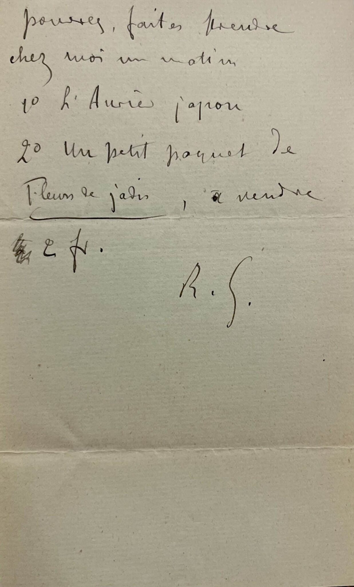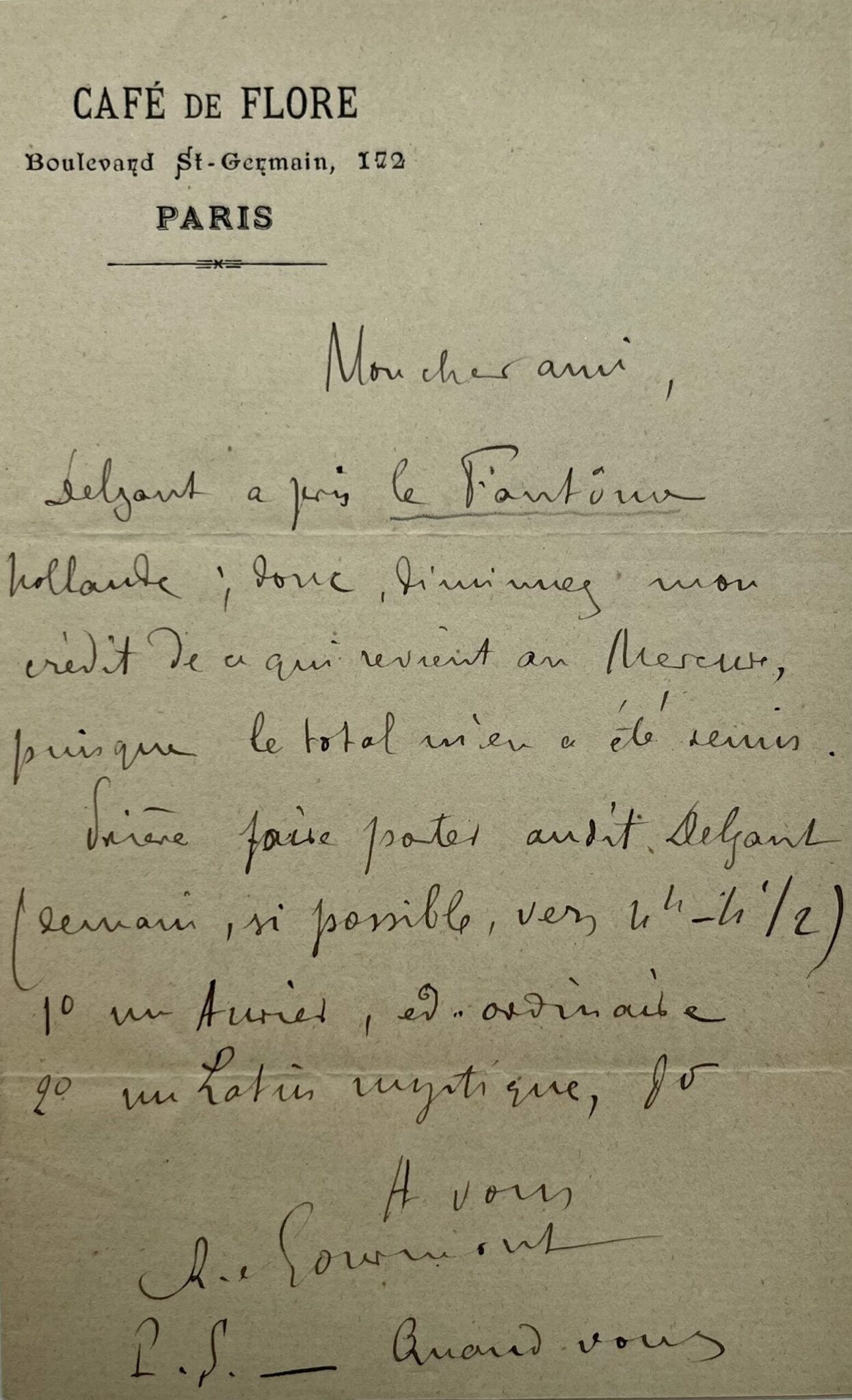 "Mon cher ami, Delzant a pris Le Fantôme hollande ; donc, diminuez mon crédit de ce qui revient au Mercure, puisque le total m'en a été remis. Prière faire porter audit Delzant (demain, si possible, vers 4h - 4h1/2) 1° un Aurier, ed. ordinaire. 2° un Latin mystique [...] P.s. Quand vous pourrez, faites prendre chez moi un matin 1° L'Aurier Japon 2° Un petit paquet de Fleurs de Jadis, à vendre 2 fr. R.G."