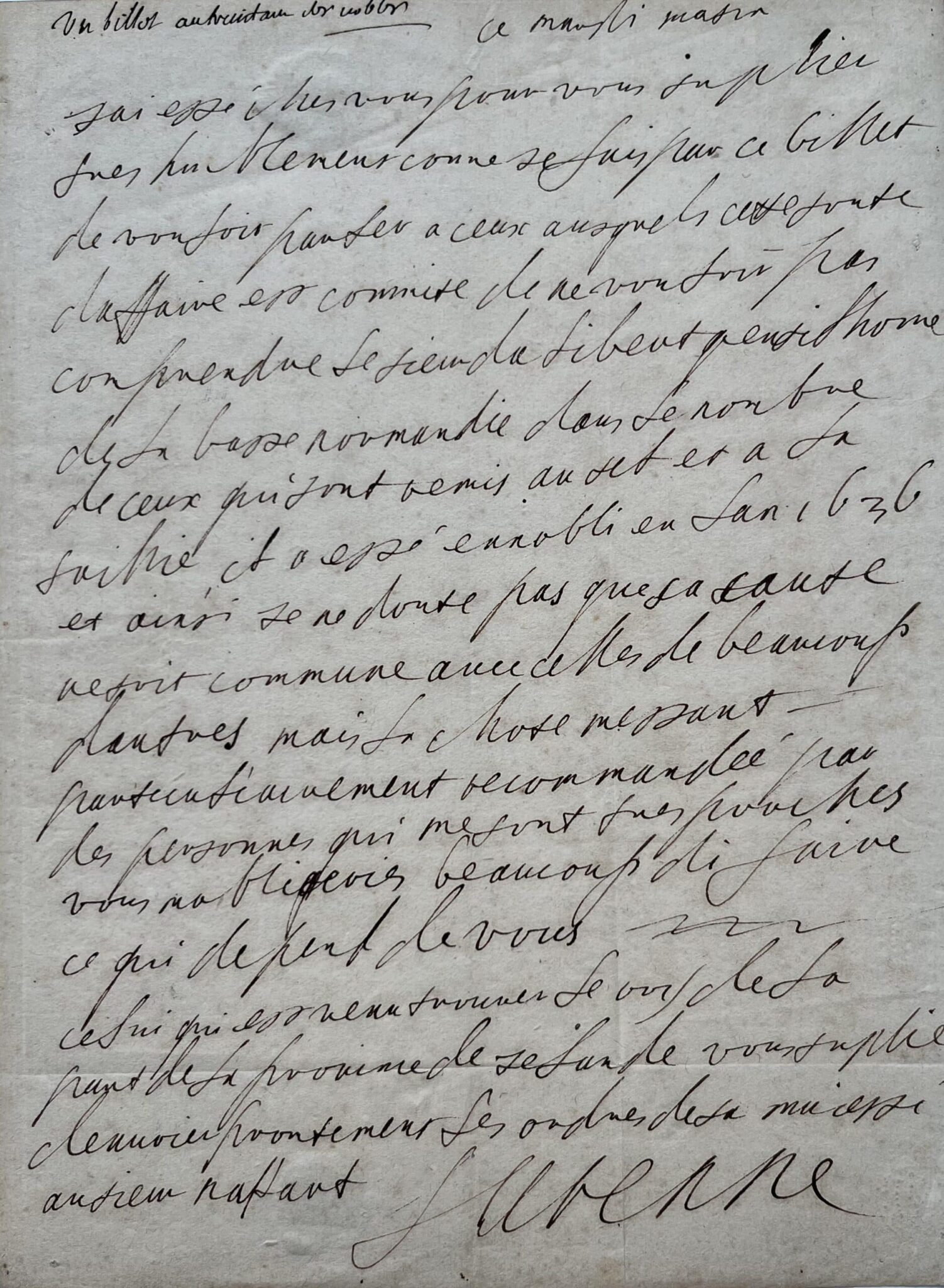 "J'ai esté chez vous pour vous suplier tres humblement comme je fais par ce billet de vouloir panser a ceux ausquels cette sorte daffaire est commise de ne vouloir pas comprendre le sieur d’Alibert gentilhome de la basse Normandie dans le nombre de ceux qui sont remis [...]. Il a esté ennobli en lan 1636 et ainsi je ne doute pas que sa cause ne soit commune avec celles de beaucoup dautres mais sa chose mestant particulièrement recommandée par des personnes qui me sont tres proches vous m'obligeries beaucoup di faire ce qui dépend de vous. Celui qui est venu trouver  [...]".
