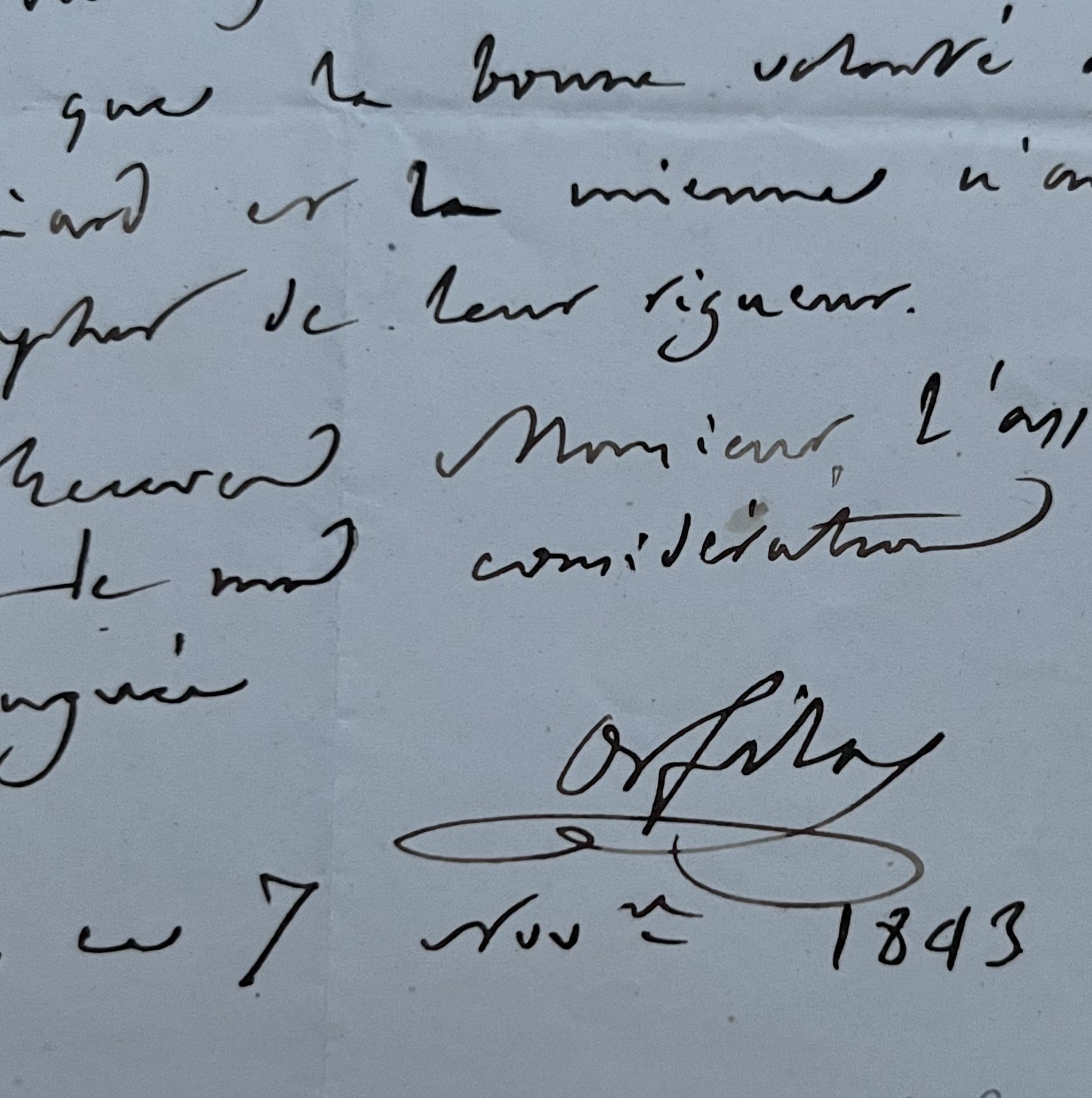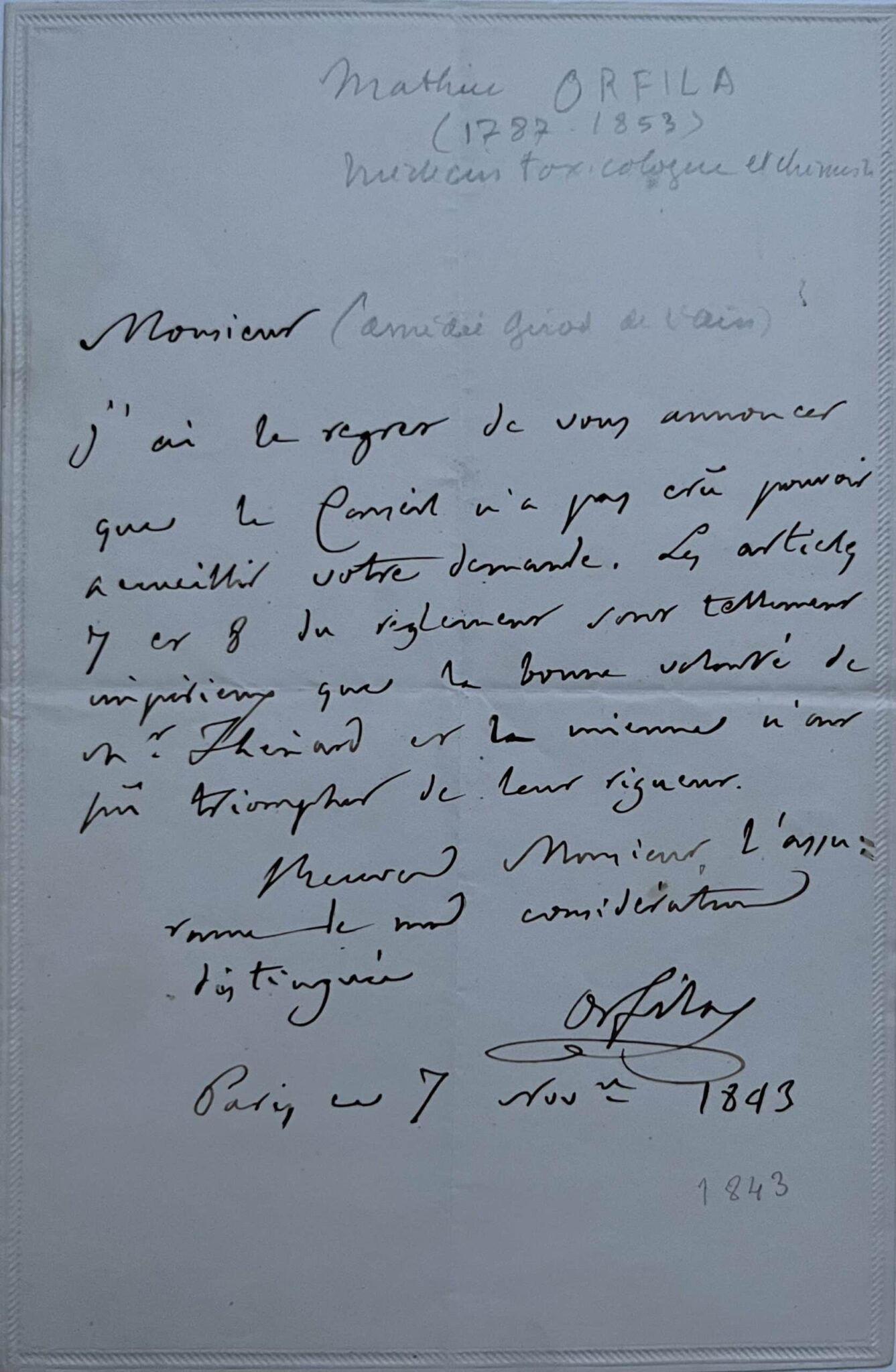 "J'ai le regret de vous annoncer que le Conseil n'a pas crû pouvoir accueillir votre demande. Les articles 7 et 8 du règlement sont tellement impérieux que la bonne volonté de M. Thénard [le chimiste Jacques-Louis Thénard (1777-1857)] et la mienne n'ont pu triompher de leur rigueur [...]".