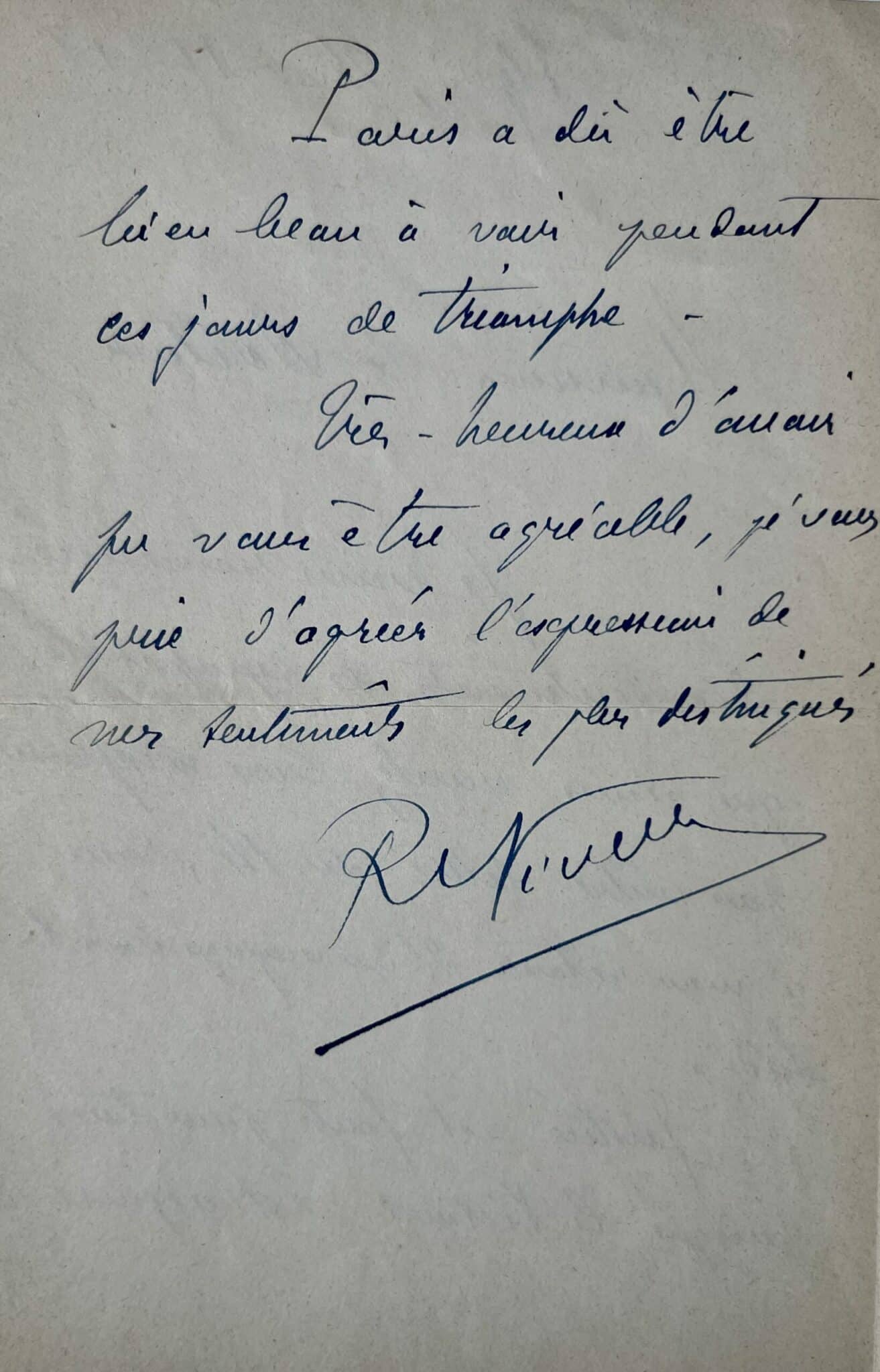 "Monsieur le Docteur. Je vous remercie des sentiments de sympathie que vous voulez bien m'exprimer par votre lettre du 14, reçu à mon retour d'un voyage dans le sud. Justice est faite pour tous puisque la Victoire est acquise. Paris a dû être bien beau à voir pendant ces jours de triomphe. Très heureux d'avoir pu vous être agréable [...]".