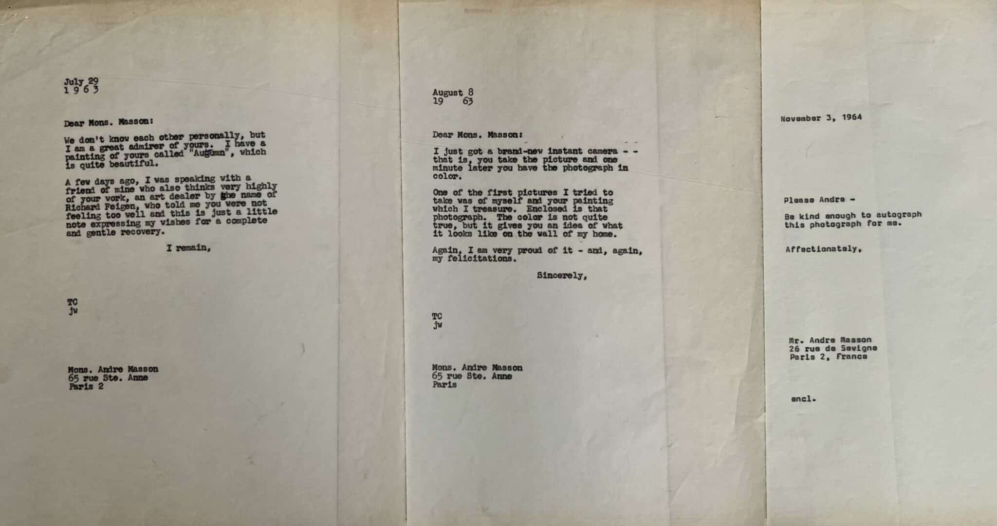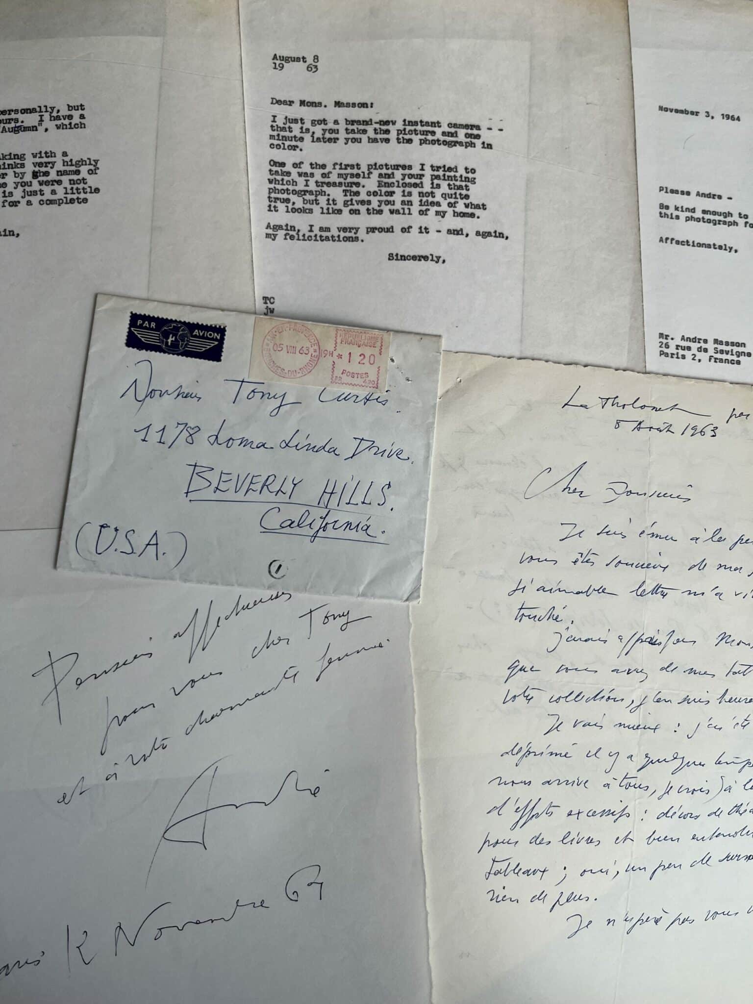 - 3 doubles de lettres tapuscrites de Tony Curtis à André Masson (1963-1964).