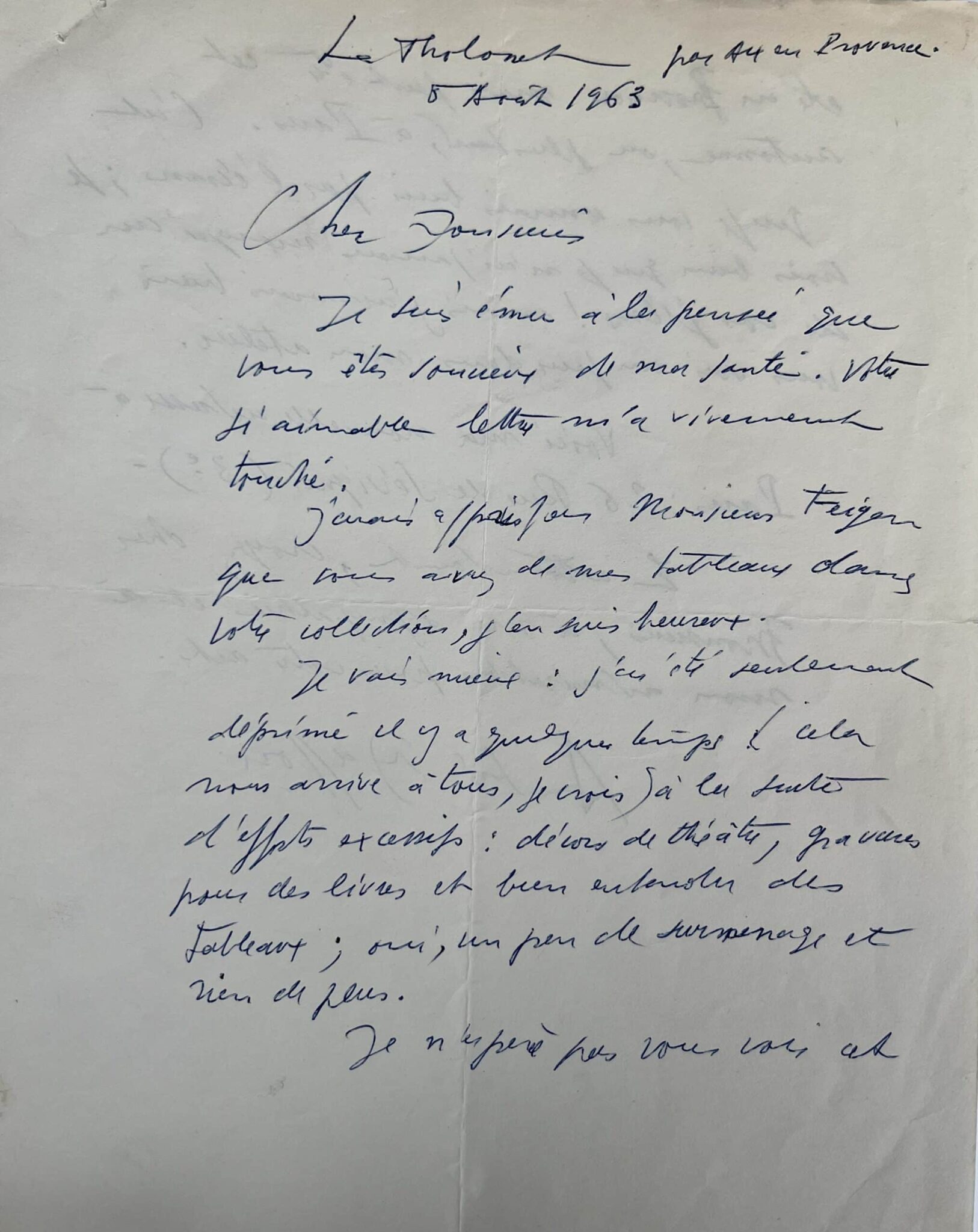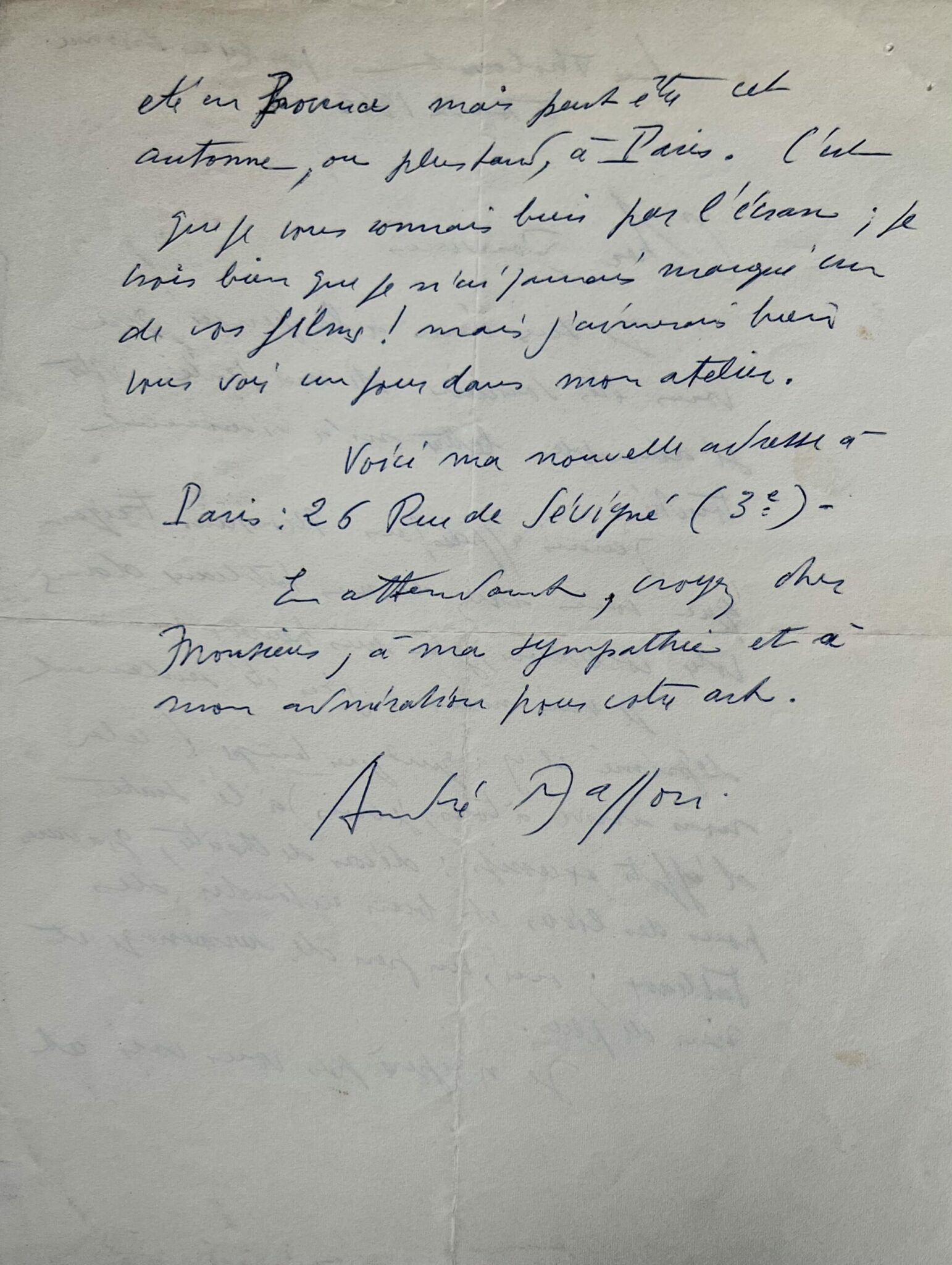 "Cher Monsieur, Je suis ému à la pensée que vous êtes soucieux de ma santé. Votre si aimable lettre m'a vraiment touché. J'avais appris par monsieur Feigen que vous avez de mes tableaux dans votre collection, j'en suis heureux. Je vais mieux : j'ai été seulement déprimé il y a quelques temps (cela arrive à tous, je crois) à la suite d'efforts excessifs : décors de théâtre, gravures pour des livres et bien entendu des tableaux ; oui, un peu de surmenage et rien de plus. Je n'espère pas vous voir cet été en Provence mais peut-être cet automne, ou plus tard, à Paris. C'est que je vous connais bien par l'écran ; je crois bien que je n'ai jamais manqué un de vos films ! mais j'aimerais bien vous voir un jour dans mon atelier. Voici ma nouvelle adresse à Paris : 26 rue de Sévigné (3e). En attendant, croyez cher Monsieur, à ma sympathie et à mon admiration pour votre art".