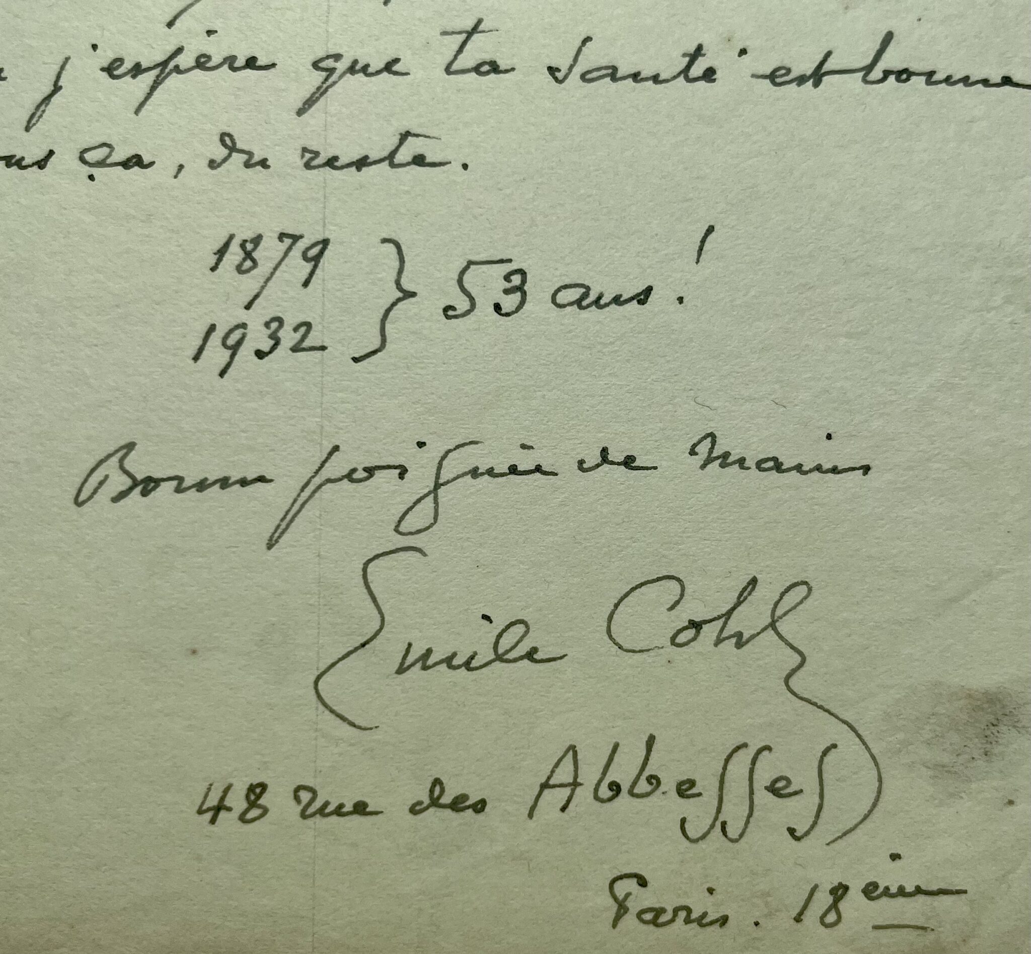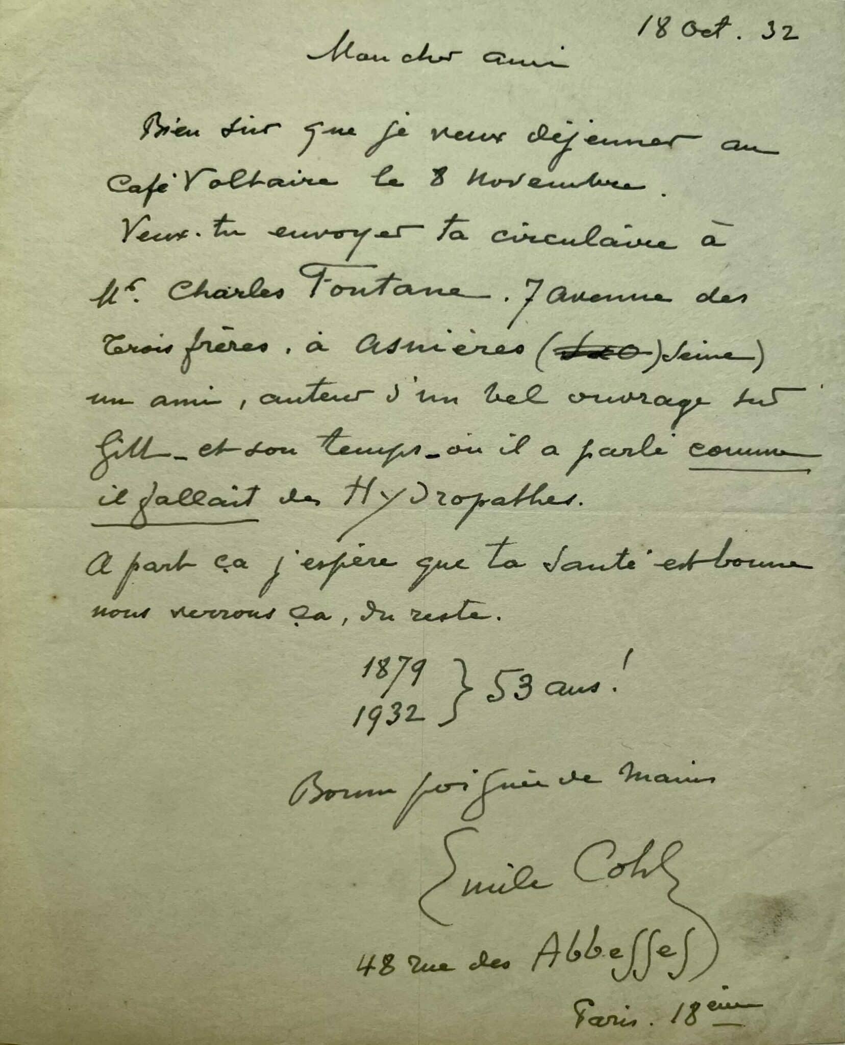 "Bien sûr que je veux déjeuner au café Voltaire le 8 novembre. Veux-tu envoyer ta circulaire à Mr Charles Fontane 7 avenue des Trois Frères, à Asnières (Seine) un ami, auteur d'un bel ouvrage sur Gill et son temps où il a parlé comme il fallait des Hydropathes. A part ça j'espère que ta santé est bonne nous verrons ça, du reste. 1879 1932 : 53 ans ! Bonne poignée de mains".