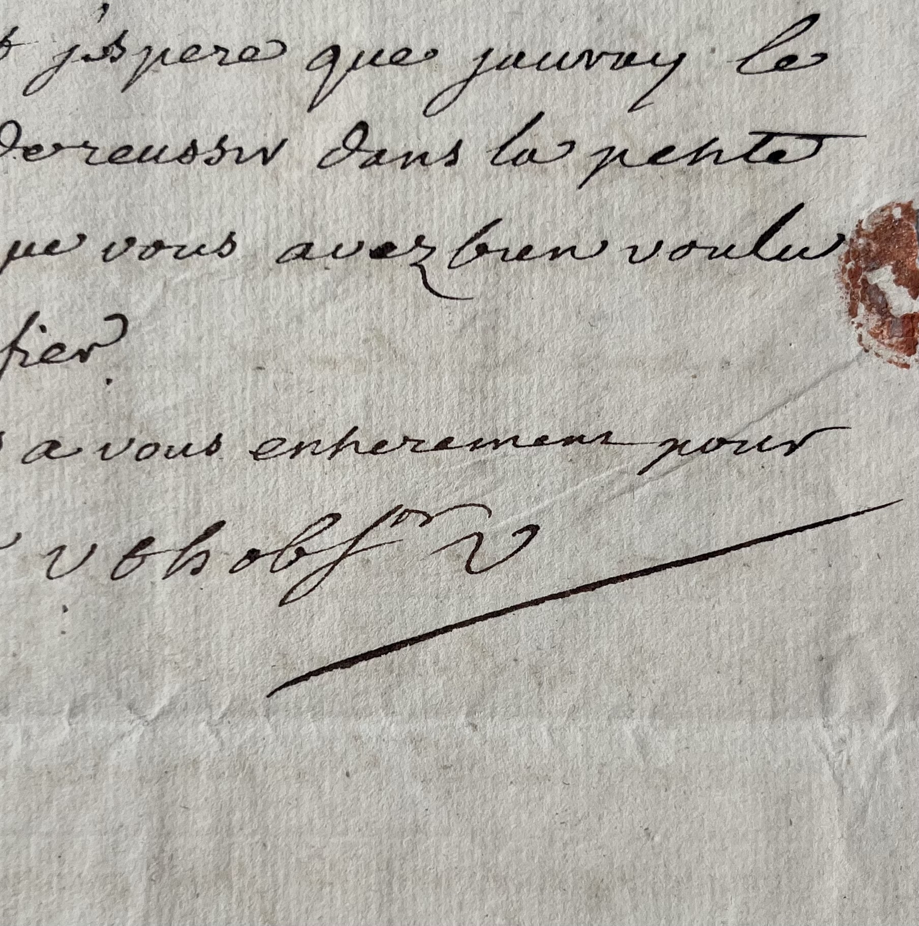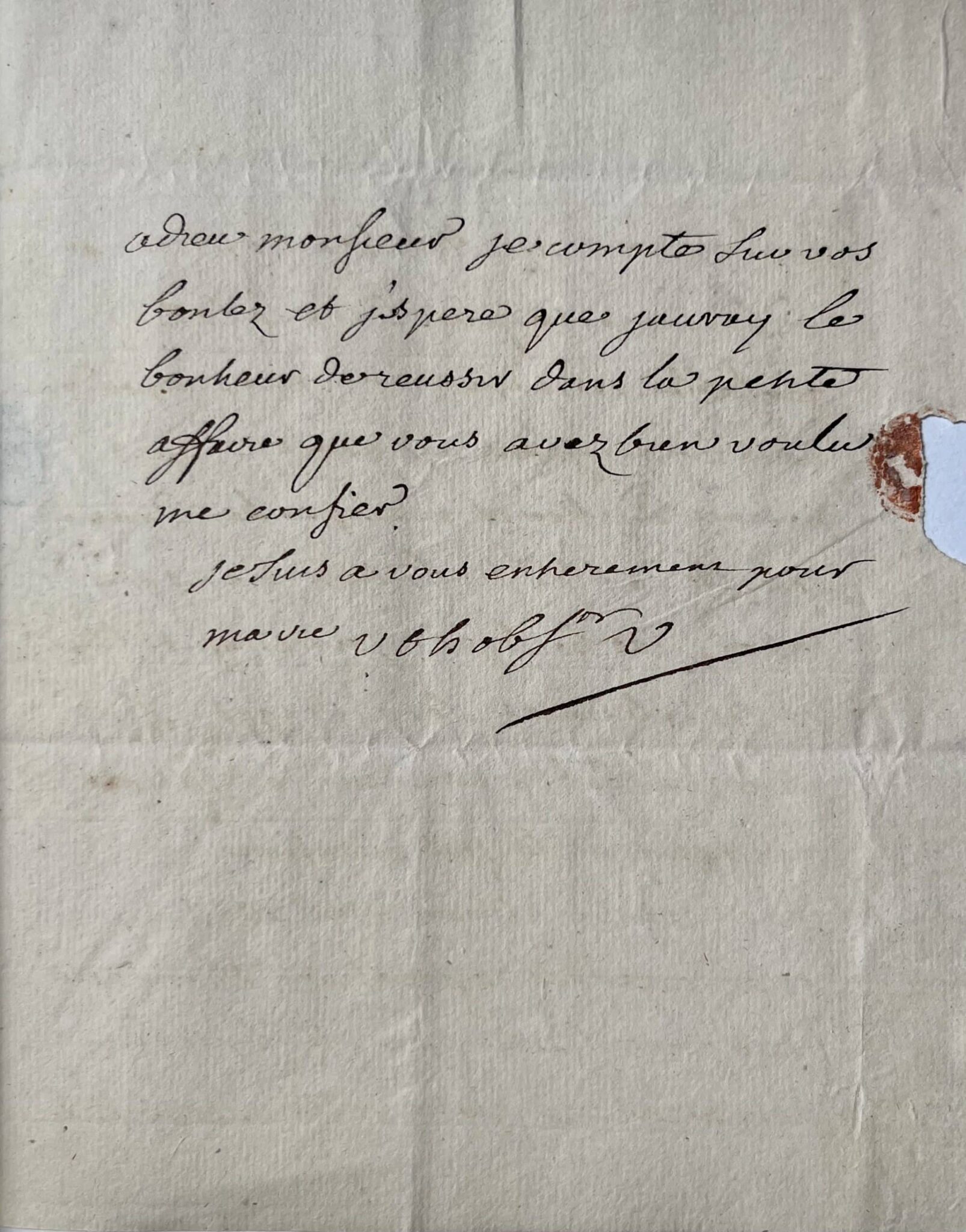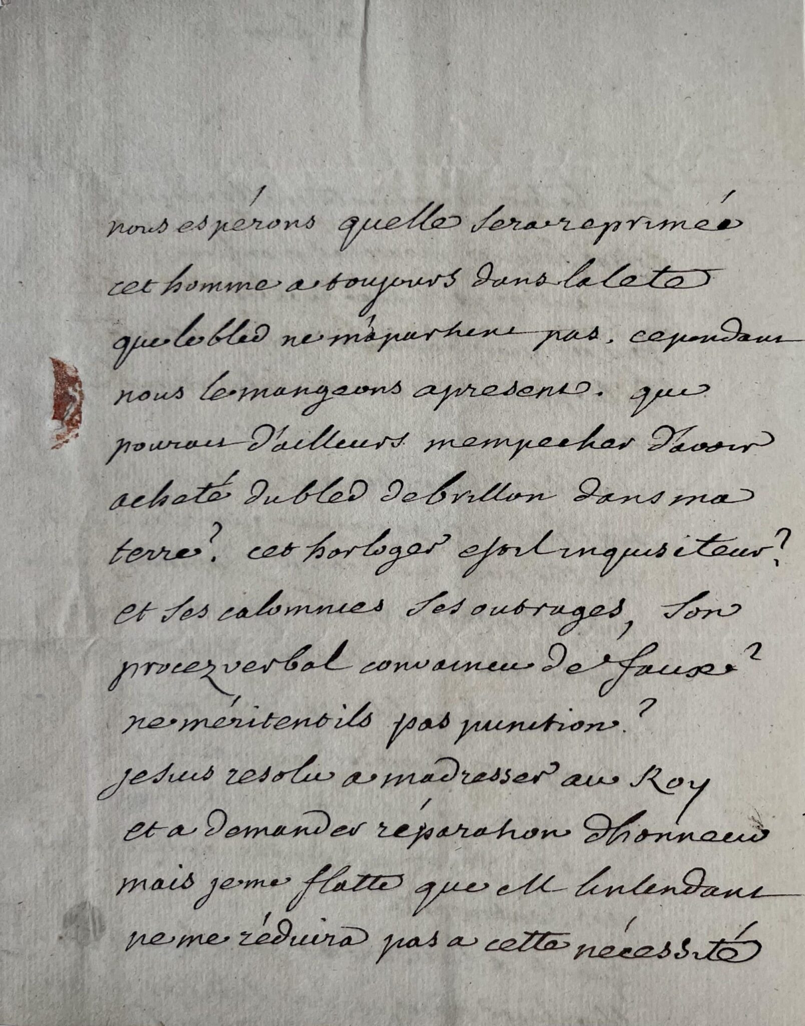 Voltaire revient ensuite sur un conflit personnel avec un horloger, un simple artisan puisse qui s’érige en "inquisiteur" et menace de s’adresser directement au roi pour obtenir réparation : "Quant à l'absurde insolence de l'horloger Crose, et de Sedillot son, nous espérons qu'elle sera réprimée. Cet homme a toujours dans la tête que le bled [blé] ne m'appartient pas, cependant nous le mangeons à present. Qui pourrait d'ailleurs m'empêcher d'avoir acheté du bled de Brillon dans ma terre, cet horloger est-il inquisiteur ? et ses calomnies, ses outrages, son procez verbal convaincu de faux ? ne méritent-ils pas punition ? Je suis résolu à m'adresser au Roy et à demander réparation d'honneur mais je me flatte que M l'intendant ne me réduira pas à cette nécessité. Adieu Monsieur je compte sur vos bontez et j'espère que j'auray le bonheur de réussir dans la petite affaire que vous avez bien voulu me confier. Je suis à vous entièrement pour ma vie. V t h ob Sr. [Votre très humble et obéissant serviteur]. V.".