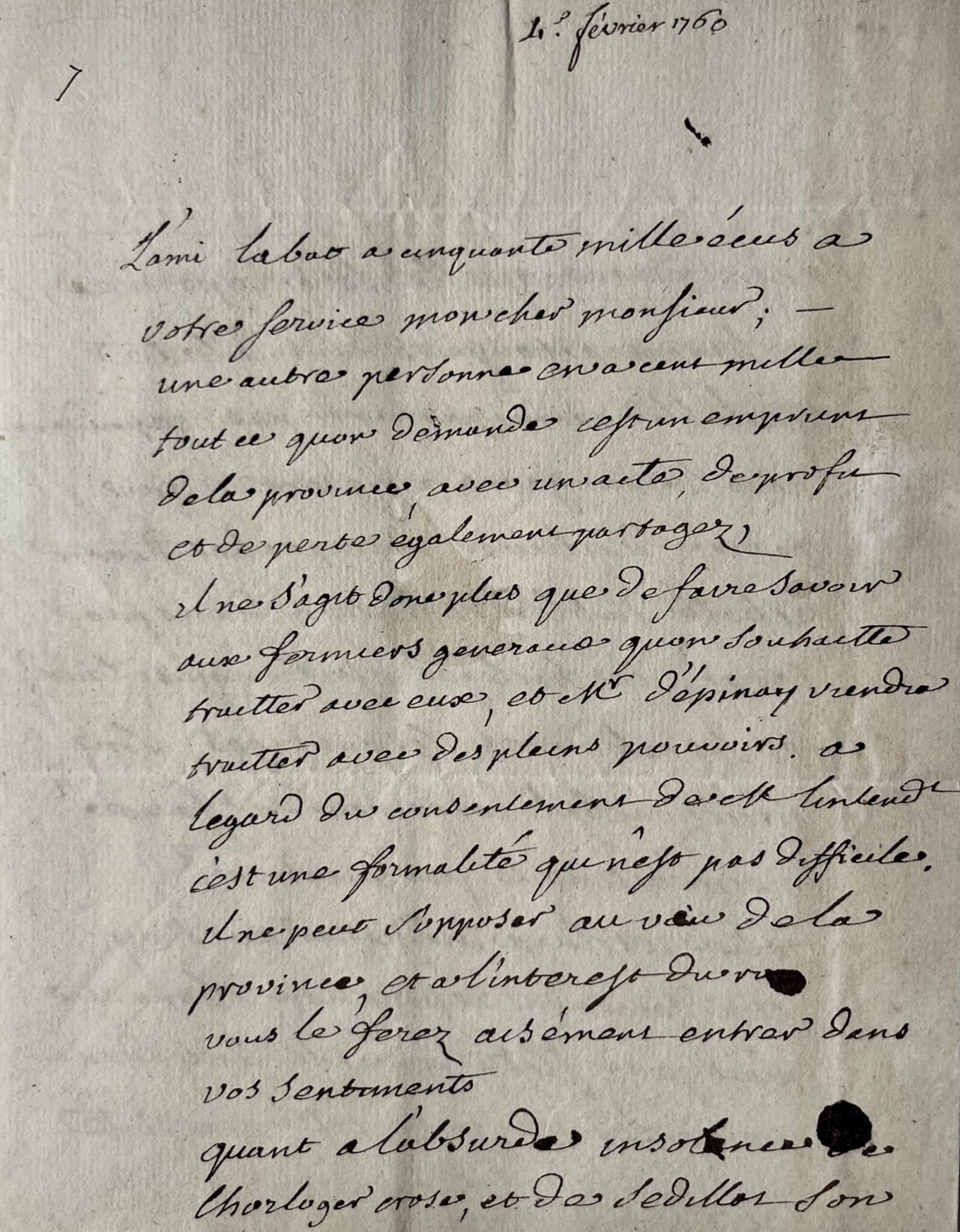 La première concerne un projet d’emprunt provincial dans lequel deux de ses associés sont prêts à engager d'importantes sommes d'argent : "L'ami Labat a cinquante mille écus à votre service mon cher monsieur ; une autre personne en a cent mille, tout ce qu'on demande c'est un emprunt de la province, avec un acte, de profit et de perte également partagez, il ne s'agit donc plus que de faire savoir aux fermiers généraux qu'on souhaitte traitter avec eux, et Mr d'Epinay viendra traitter avec les pleins pouvoirs. A l'égard du consentement de M. l'entend[an]t c'est une formalité qui n'est pas difficile. Il ne peut s'opposer au voeu de la province, et a l'intesrest du ro["roi", tâche d'encre]. Vous le ferez aisément entrer dans vos sentiments".
