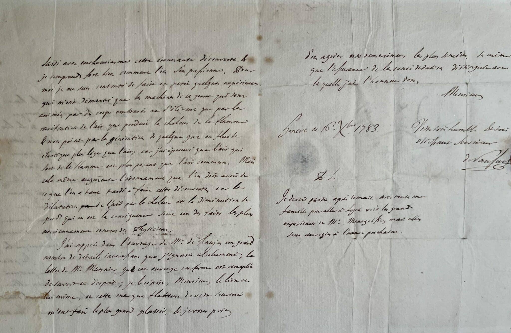 "J'ai été agréablement surpris de recevoir le livre de Mr de Faujas que vous avés eu la bonté de m'envoyer ; non seulement parce que je désirais extrêmement de le lire mais encore parce que j'ai été infiniment flatté de cette attention obligeante de votre part à laquelle je n'avois absolument aucun titre. Madame Audéoud m'a fait la grâce de me communiquer les nouvelles intéressantes que vous lui aviés mandées. J'ai peine à croire que le feu de la cuisine de la maison qui porteroit une de ces machines pût jamais servir à les faire aller ; le feu perd trop de son activité en passant par le canal d'une cheminée, mais l'idée est agréable & ingénieuse. Vous avés saisi avec enthousiasme cette étonnante découverte & je comprends fort bien comment l'on s'en passionne. Pour moi, je me suis contenté de faire en petit quelques expériences qui m'ont démontré que les machines de ce genre qui sont animées par des corps embrasés ne s'élèvent que par la raréfaction de l'air que produit la chaleur de la flamme non point par la génération de quelque gaz ou fluide élastique plus léger que l'air ; car j'ai éprouvé que l'air qui sort de la flamme est plus pesant que l'air commun. Mais cela même augmente l'étonnement que l'on doit avoir de ce que l'on a tant tardé à faire cette découverte car la dilatation de l'air par la chaleur et la diminution de poids qui en est la conséquence sont un des faits les plus anciennement connus des physiciens. J'ai appris dans l'ouvrage de Mr de Faujas un grand nombre de détails intéressans que j'ignorois absolument ; la lettre de Meusnier que cet ouvrage renferme est rempli de saveur et d'esprit ; je le répète, monsieur, le livre en lui-même, et cette marque flatteuse de votre souvenir m'ont fait le plus grand plaisir, je vous prie d'en agréer mes remerciemens les plus sincères [...]". Il ajoute "Je devois partir après-demain avec toute ma famille pour aller à Lyon voir les grandes expériences de Mr Montgolfier, mais elles sont renvoyées à l'année prochaine".