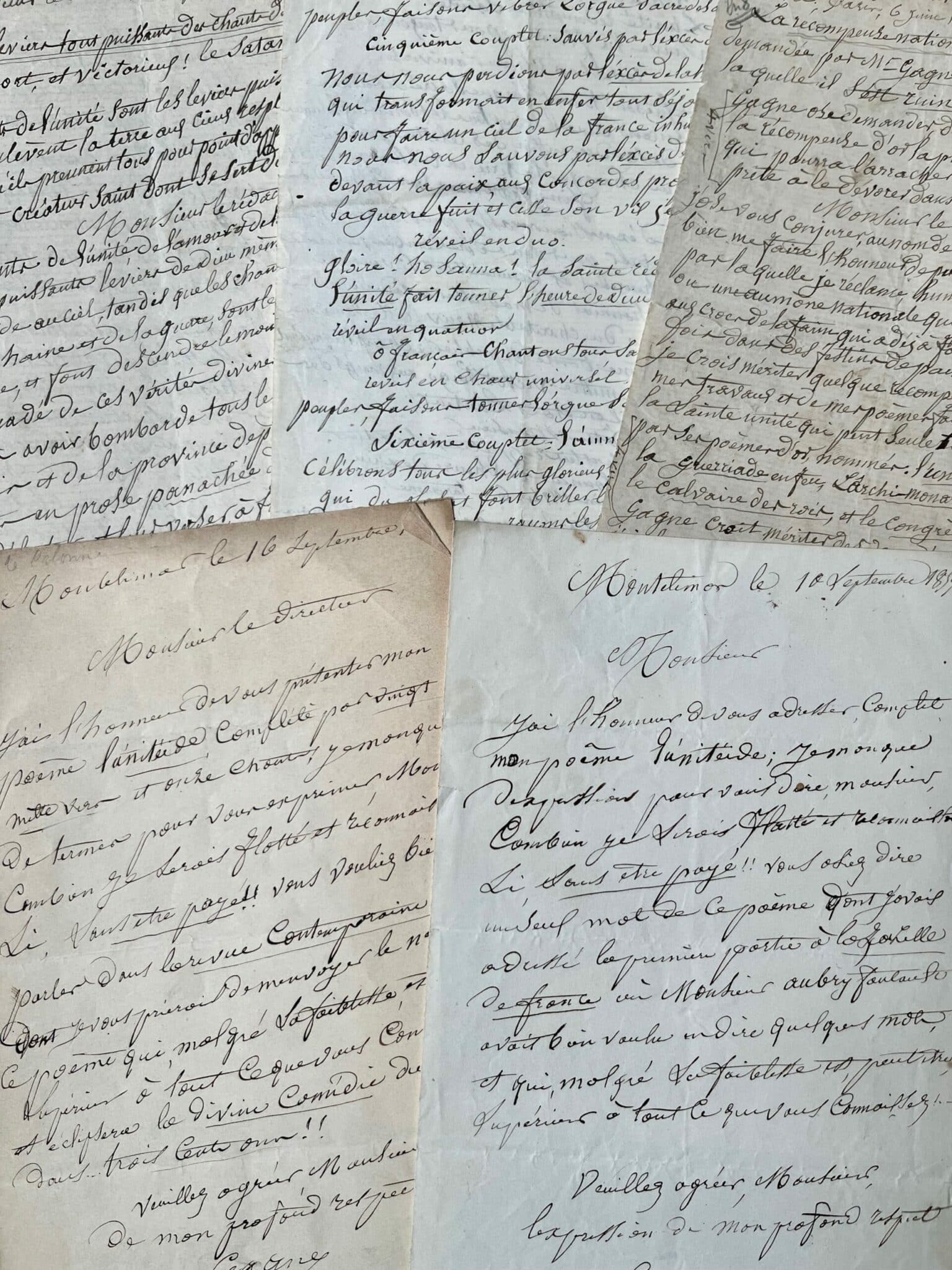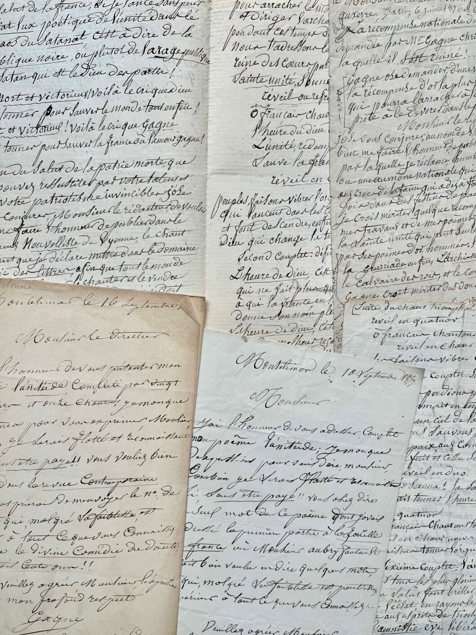 Suivent deux manuscrits de sa main (7 pp. in-8), adressés au directeur du Novelliste de l'Yonne, intitulés "Les Leviers tout puissants des chants de l'unité" et "La récompense nationale du Salut" avec de longs extraits. Il y évoque également ses oeuvres La Guerriade, L'Archi-monarqueïde, Le Calvaire des rois ou Le Congrès sauveur.