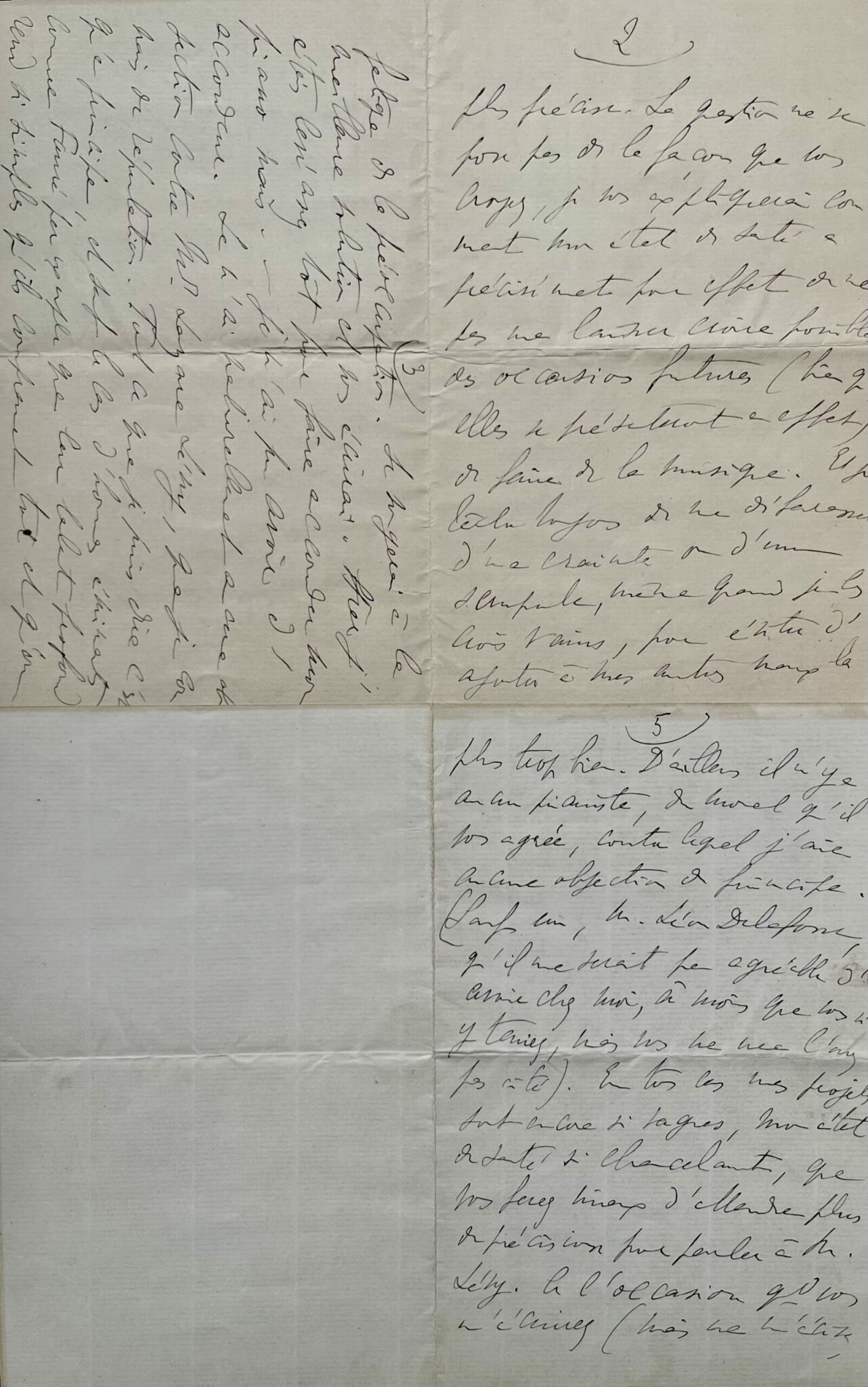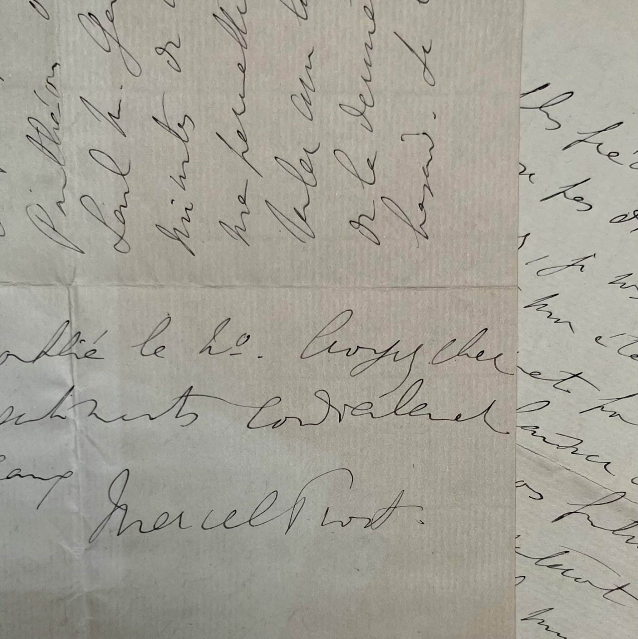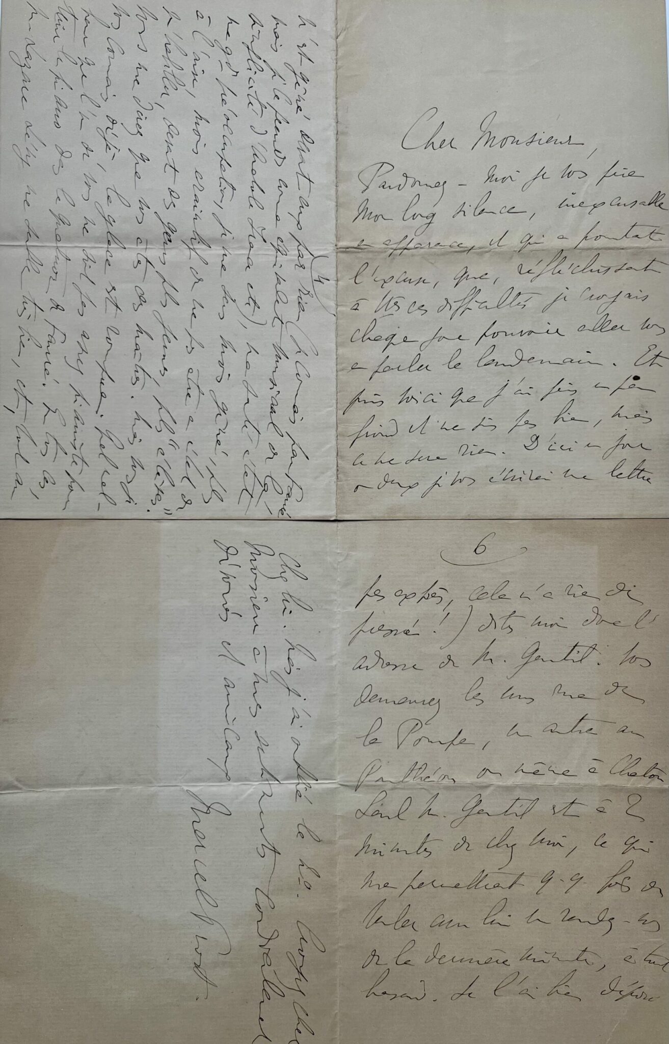 "Cher Monsieur, Pardonnez-moi je vous prie mon long silence, inexcusable en apparence, et qui a pourtant l'excuse que, réfléchissant à toutes ces difficultés je croyais chaque jour pouvoir aller vous en parler le lendemain. Et puis voici que j'ai pris un peu froid et ne suis pas bien, mais ce ne sera rien. D'ici un jour ou deux, je vous écrirai une lettre plus précise. La question ne se pose pas de la façon que vous croyez, je vous expliquerai comment mon état de santé a précisément pour effet de ne pas me laisser croire possible des occasions futures (bien qu'elles se présenteront en effet) de faire de la musique. Et je tâche toujours de me débarrasser d'une crainte ou d'un scrupule, même quand je les crois vains, pour éviter d'ajouter à mes autres maux la fatigue de la préoccupation. Je songerai à la meilleure solution et vous écrirai. Hier j'étais levé assez tôt pour faire accorder mon piano mais... je n'ai pu avoir d'accordeur. Je n'ai naturellement aucune objection contre M. Lazare Lévy, que je connais de réputation. Tout ce que je puis dire c'est qu'en principe, et sauf le cas d'hommes éminents comme Fauré par exemple que leur talent profond rend si simples qu'ils comprennent tout et qu'on n'est gêné devant eux par rien (je connais peu Fauré, mais je le prends comme équivalent musical de la simplicité d'Anatole France etc), ma santé était ma gde préoccupation, je me sens moins gêné, plus à l'aise, mois craintif de ne pas être en état de m'habiller, devant des gens plus jeunes plus "élèves". Vous me direz que vous êtes des maîtres. Mais vous, je vous connais déjà, la glace est rompue. Quel malheur que l'un de nous ne soit pas assez pianiste pour tenir le piano dans le quatuor de Fauré ! En tout cas, M. Lazare Lévy me semble très bien, et, tout au plus trop bien. D'ailleurs il n'y a aucun pianiste, du moment qu'il vous agrée, contre lequel j'aie aucune objection de principe. (Sauf un, M. Léon Delafosse, qu'il me serait peu agréable d'avoir chez moi, à moins que vous n'y teniez, mais vous ne me l'avez pas cité [Proust l'avait présenté, en 1894, à Robert de Montesquiou). En tous cas mes projets sont encore si vagues, mon état de santé si chancelant, que vous ferez mieux d'attendre plus de précisions pour parler à M. Lévy. A l'occasion qd vous m'écrirez (mais ne m'écrivez pas exprès, cela n'a rien de pressé !) dites moi donc l'adresse de M. Gentil [second violoniste du quatuor de Gaston Poulet]. Vous demeurez les uns rue de la Pompe, un autre au Panthéon ou même à Chatou. Seul M. Gentil est à 2 minutes de chez moi, ce qui me permettait q. q. fois de tenter avec lui un rendez-vous de la dernière minute, à tout hasard. Je l'ai hier déposé chez lui. Mais j'ai oublié le n°. Croyez cher monsieur à mes sentiments cordialement dévoués et amicaux. Marcel Proust".